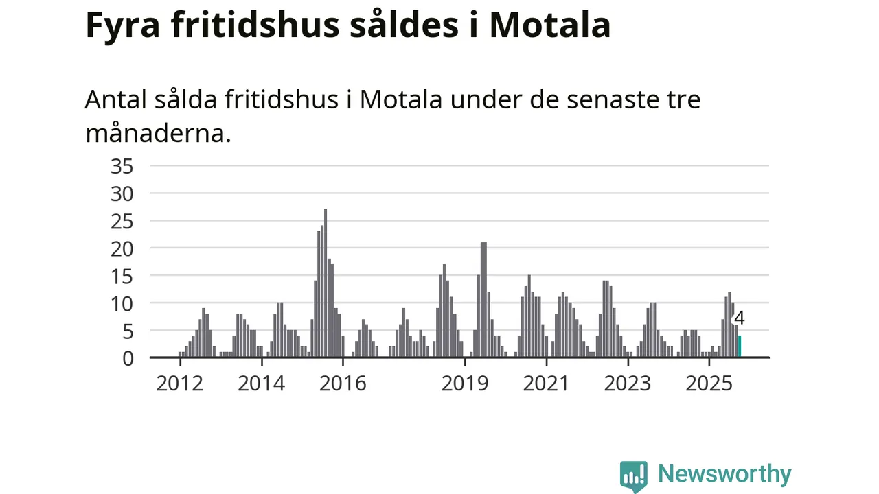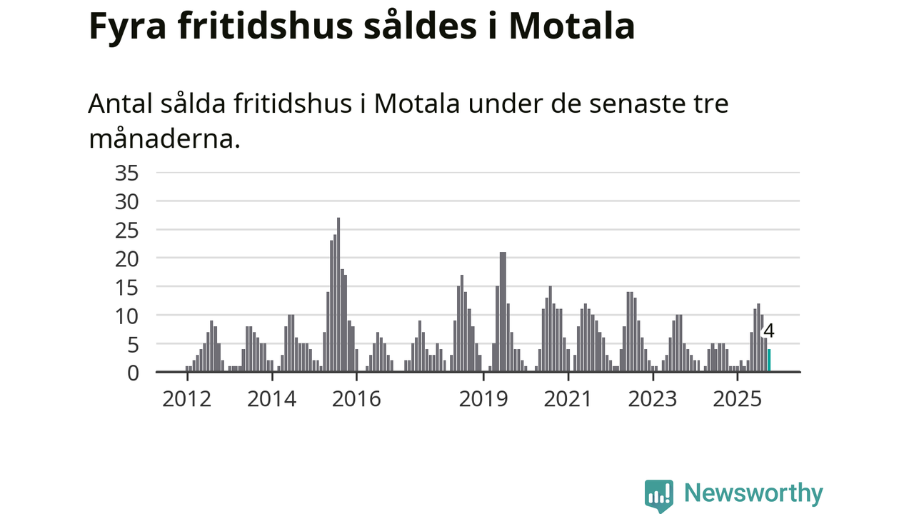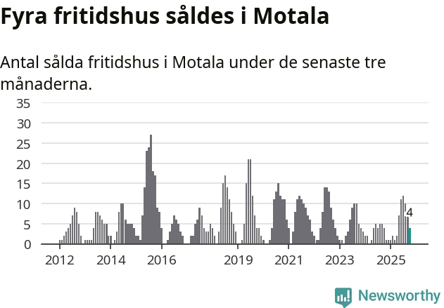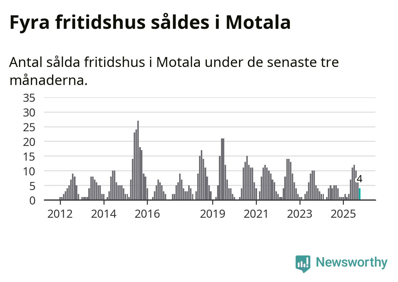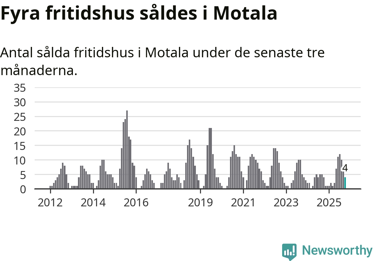 Mellan augusti och oktober gjordes sammanlagt fyra affärer med fritidshus i Motala kommun. Det är lika många affärer som vid motsvarande tid i fjol.