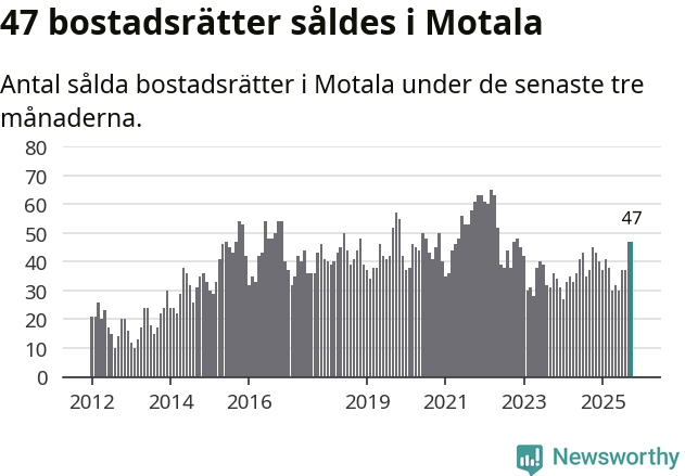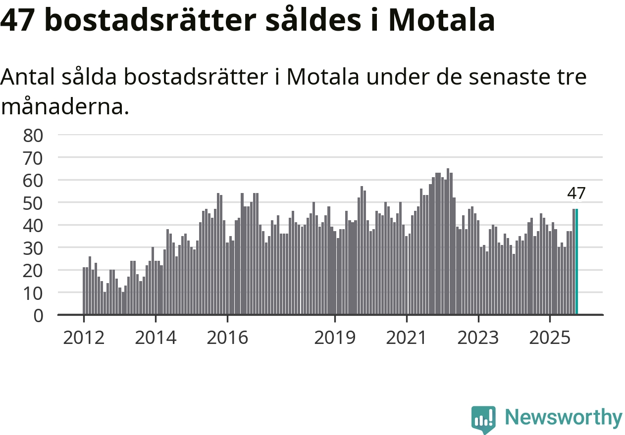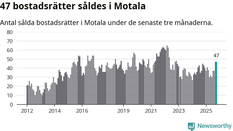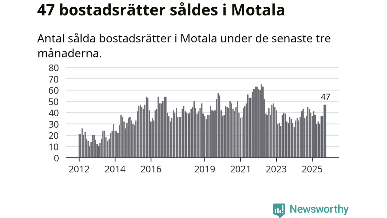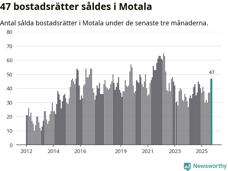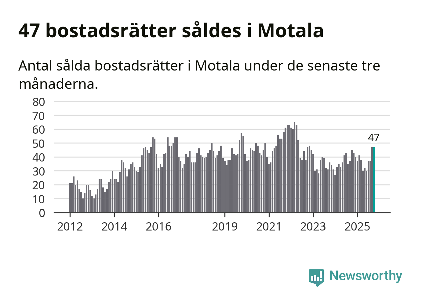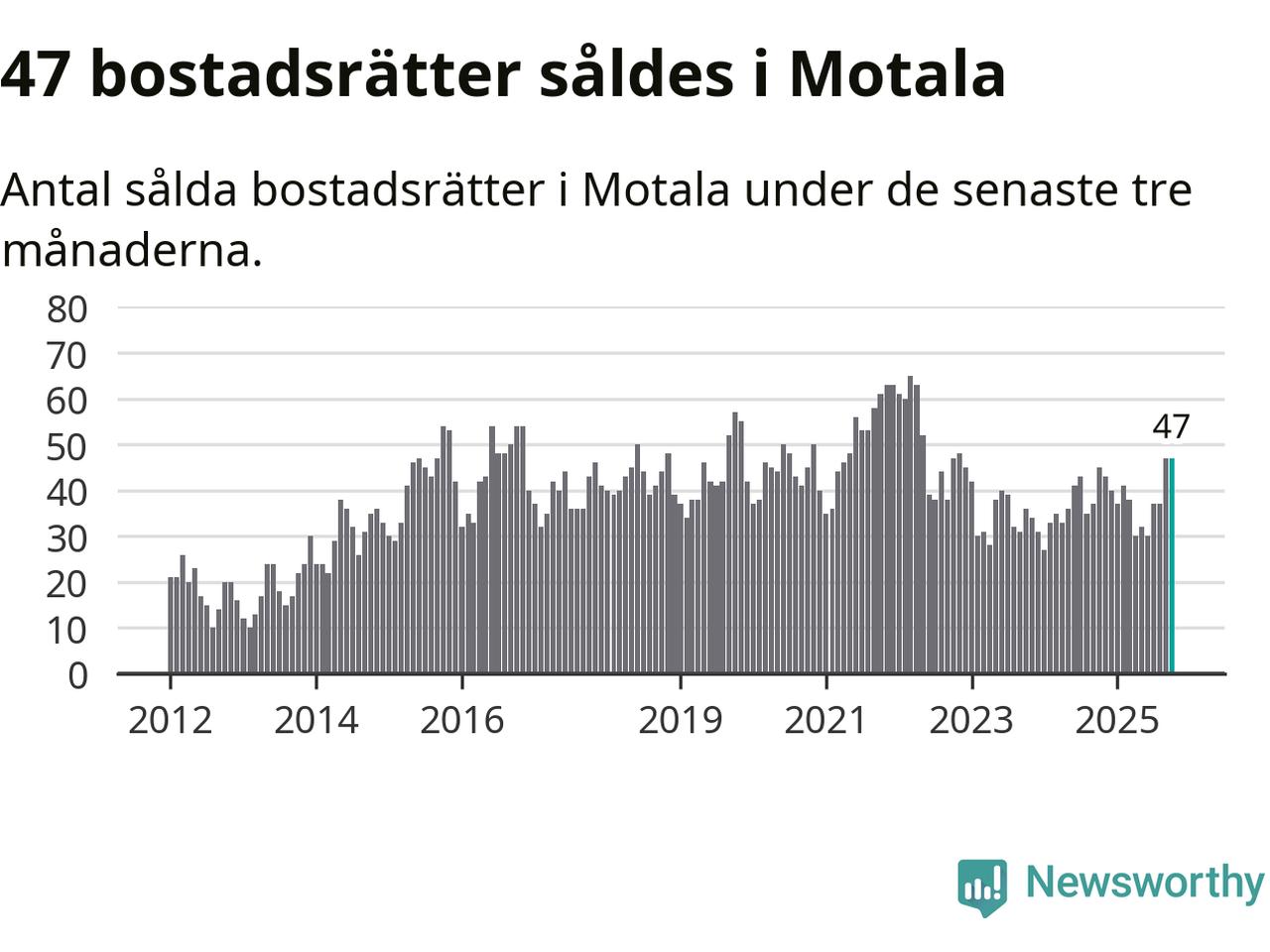 Sammanlagt såldes 47 bostadsrätter i Motala kommun mellan augusti och oktober till ett genomsnittligt pris på 1,2 miljoner kronor. I fjol gjordes 45 affärer vid den här tiden på året.
