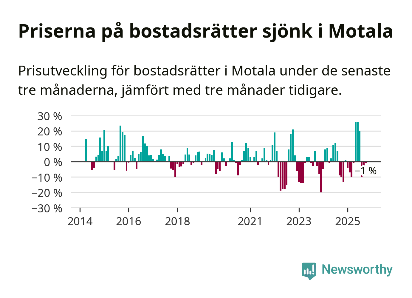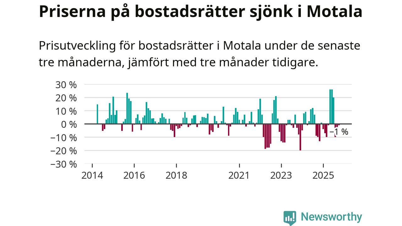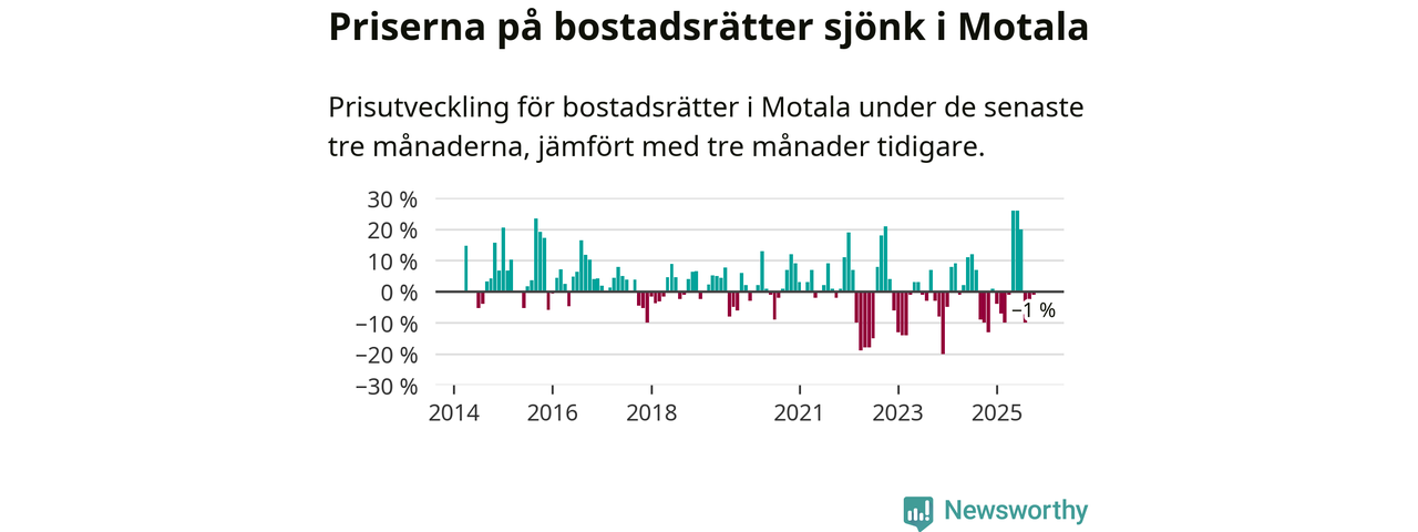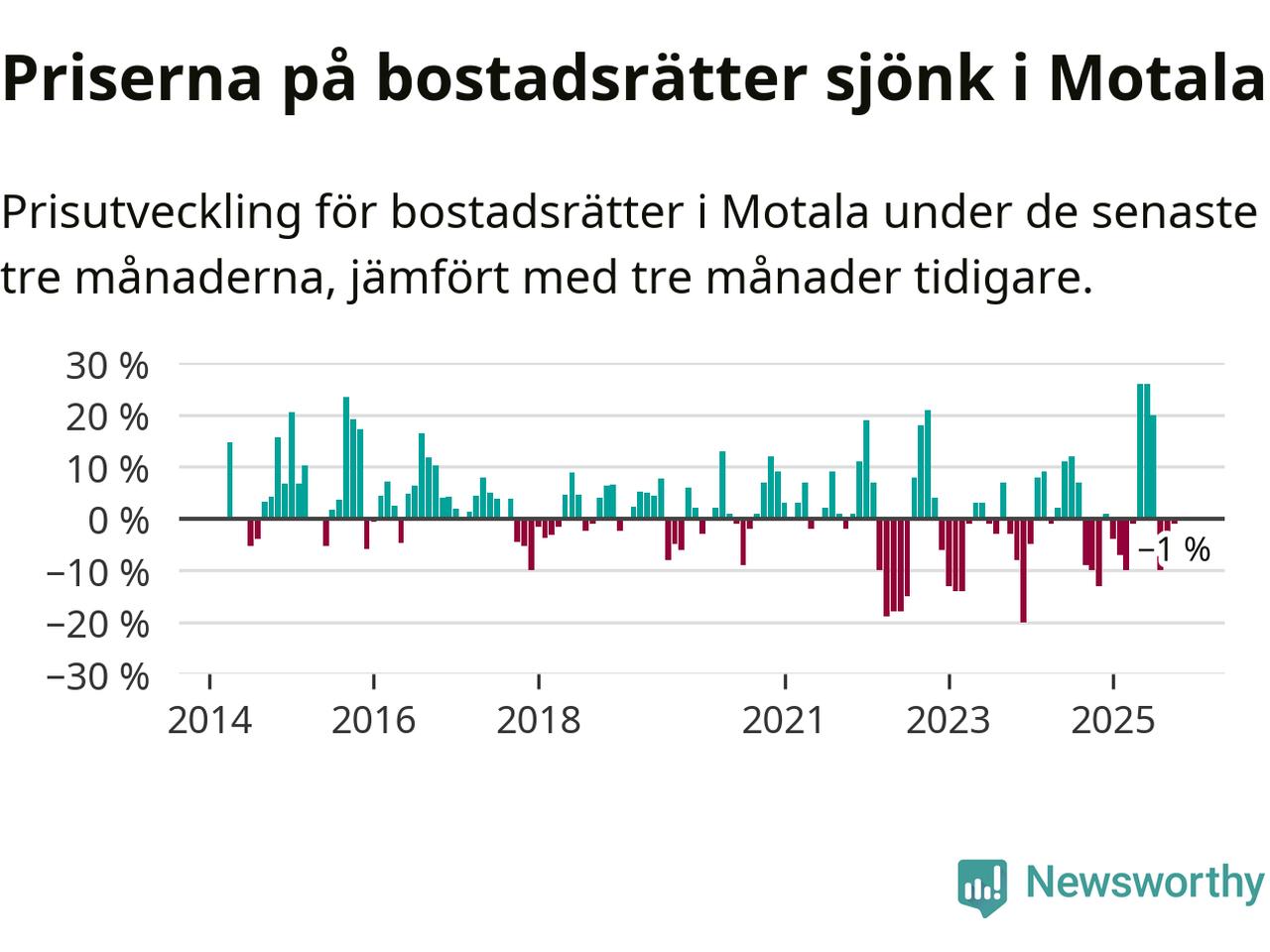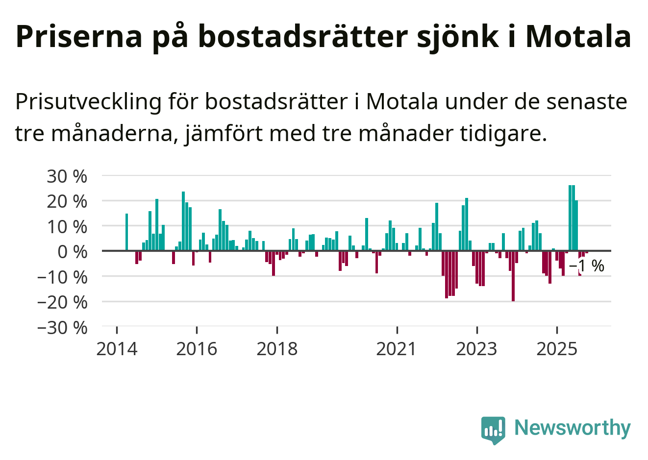 Priserna på bostadsrätter har gått ner i Motala kommun. Medelpriset på försäljningarna under de senaste tre månaderna visar på en nedgång med 1 procent.
