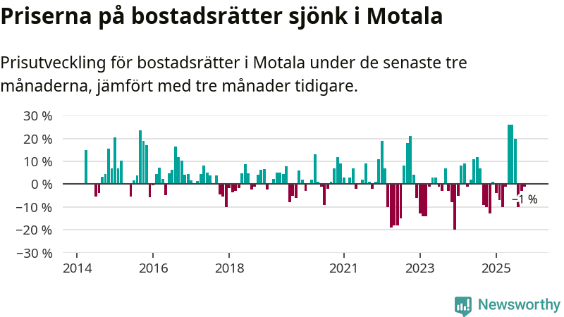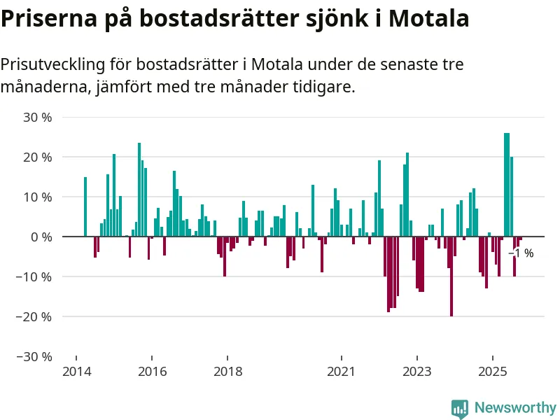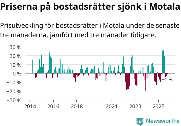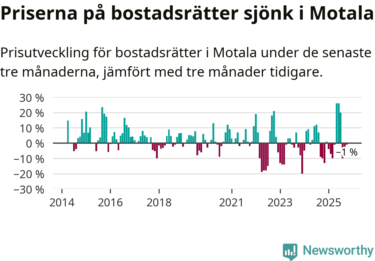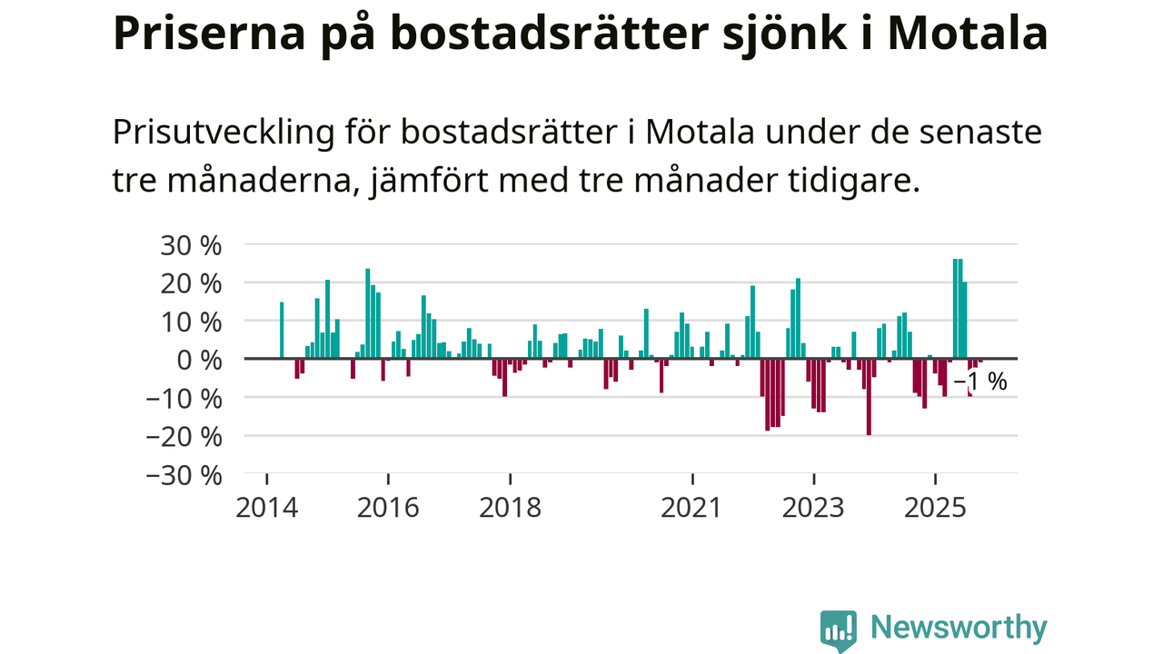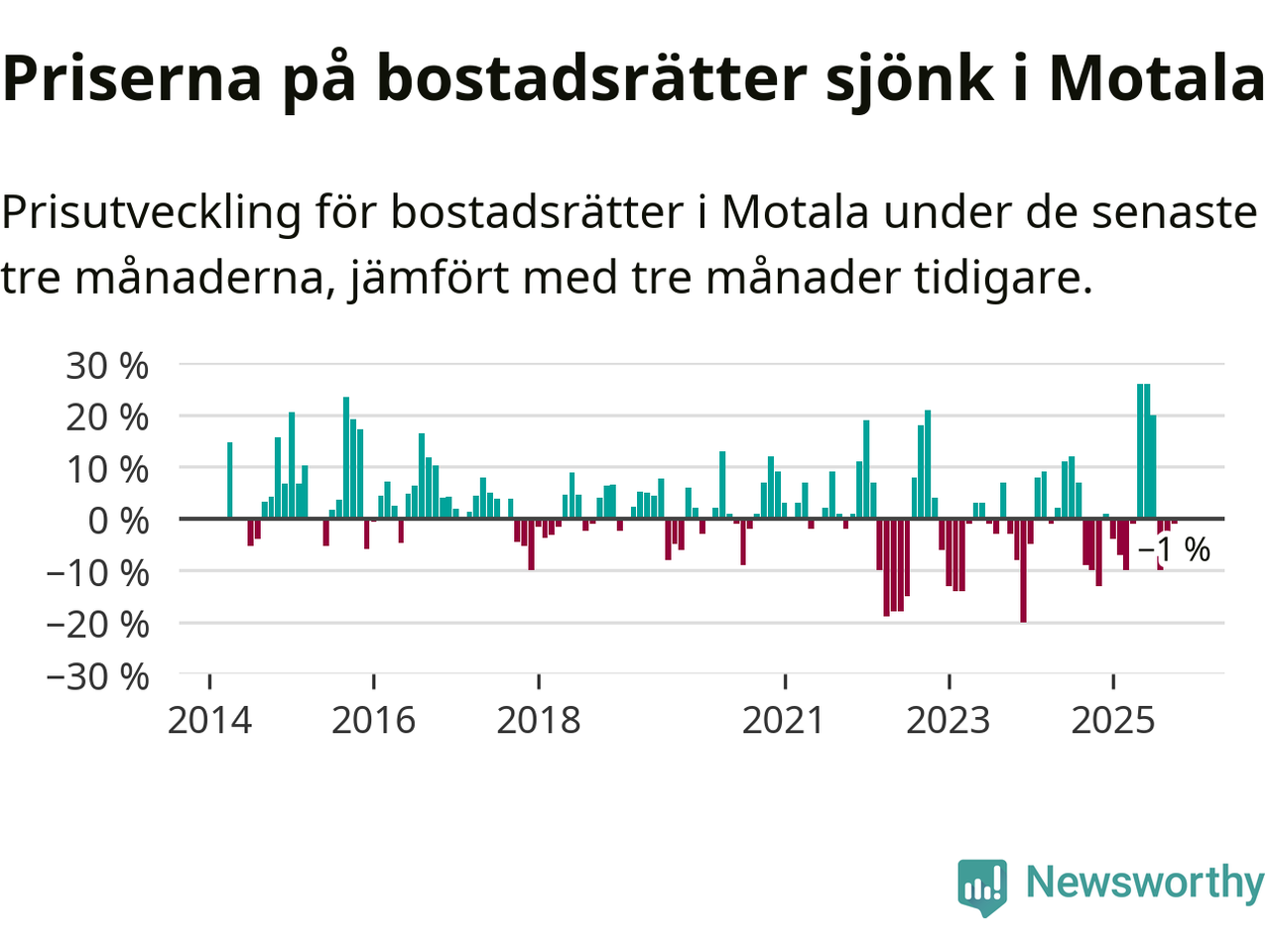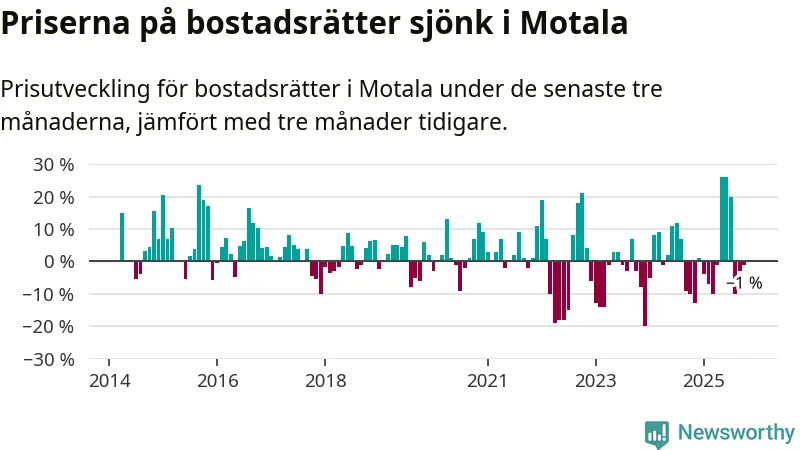 Priserna på bostadsrätter har gått ner i Motala kommun. Medelpriset på försäljningarna under de senaste tre månaderna visar på en nedgång med 1 procent.