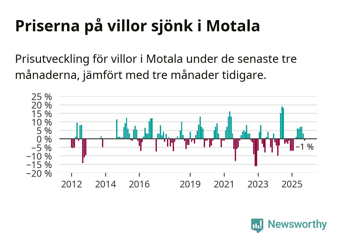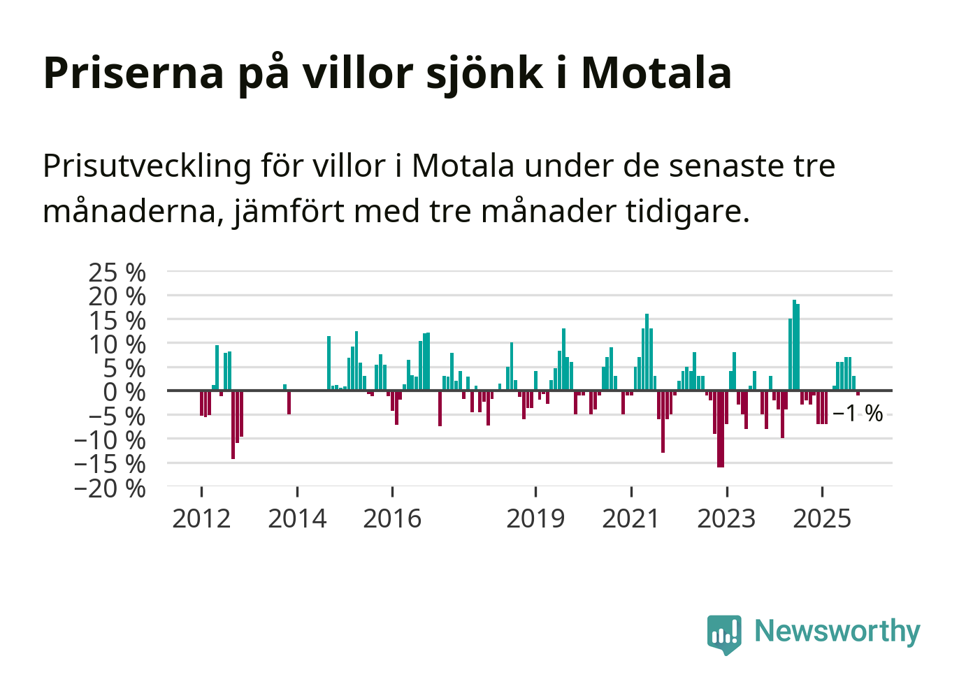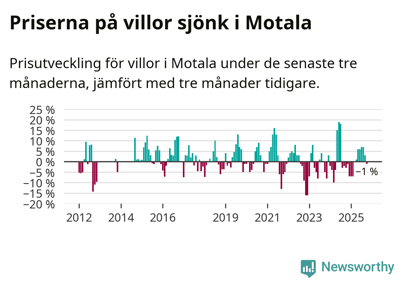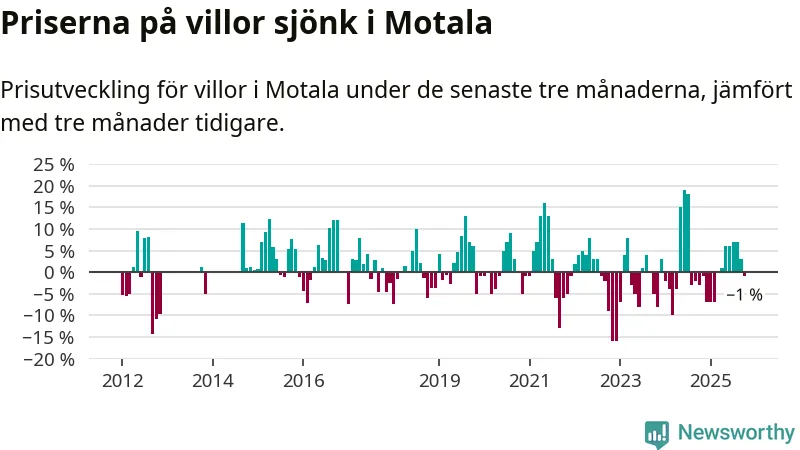 Statistiken visar även på en prisnedgång i Motala kommun. Medelpriset på försäljningarna av villor i kommunen var 1 procent lägre än för tre månader sedan. I hela Östergötland däremot ökar villapriserna. I hela länet noterades en prisuppgång på 3 procent.