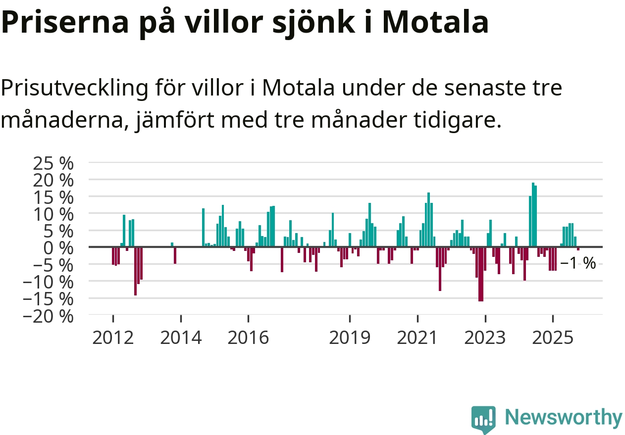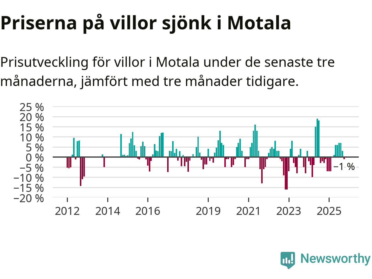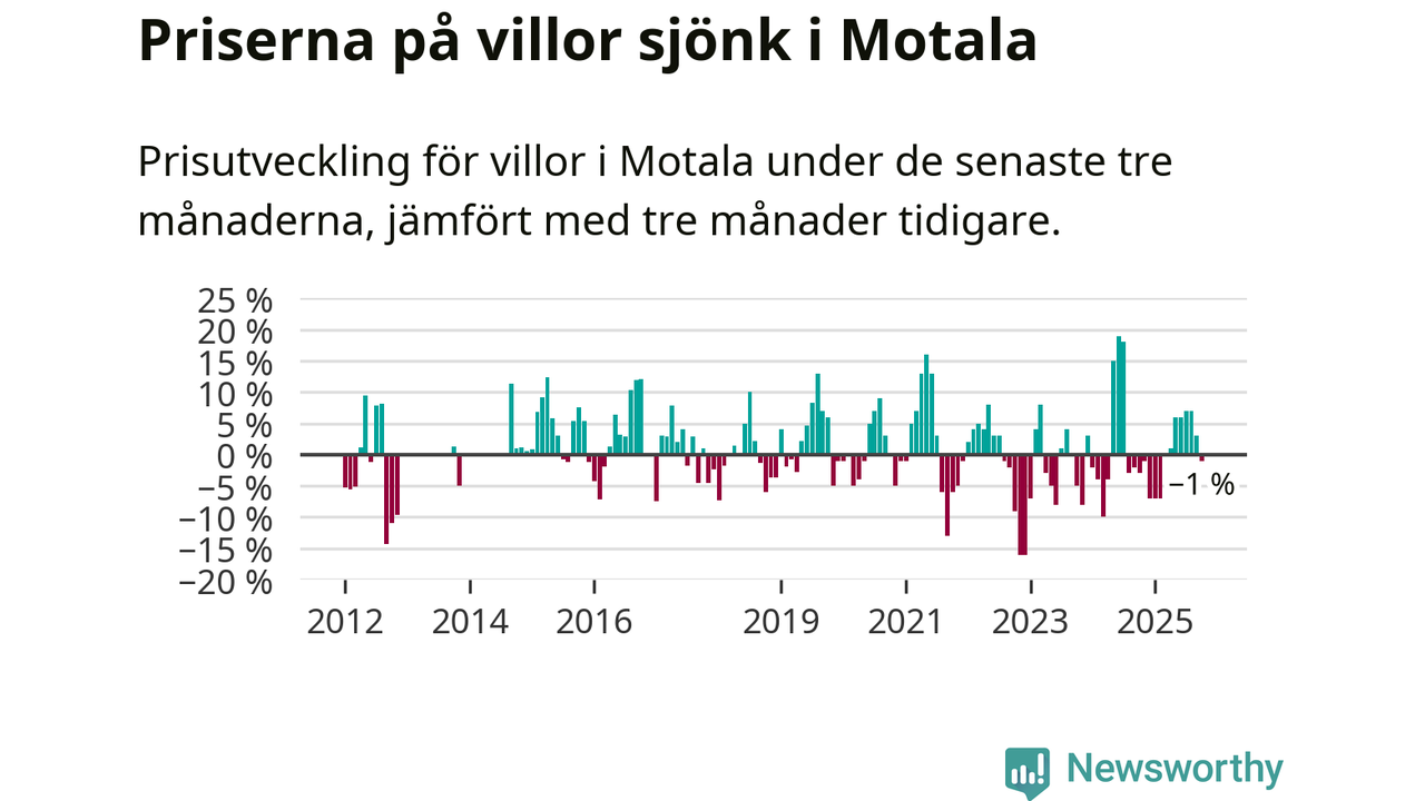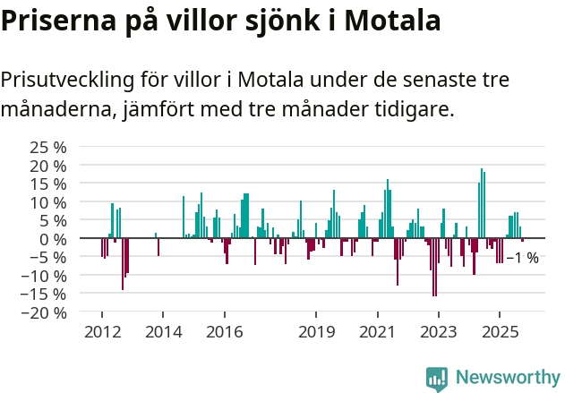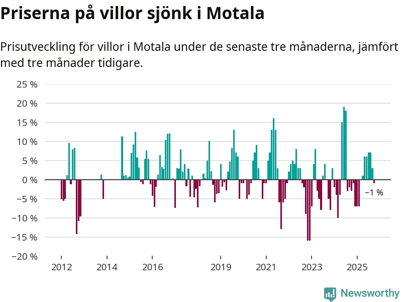 Statistiken visar även på en prisnedgång i Motala kommun. Medelpriset på försäljningarna av villor i kommunen var 1 procent lägre än för tre månader sedan. I hela Östergötland däremot ökar villapriserna. I hela länet noterades en prisuppgång på 3 procent.