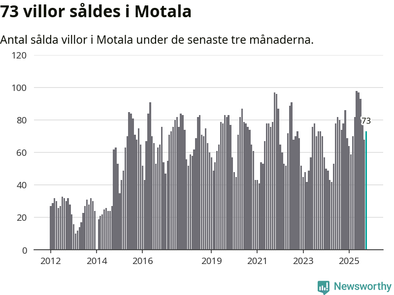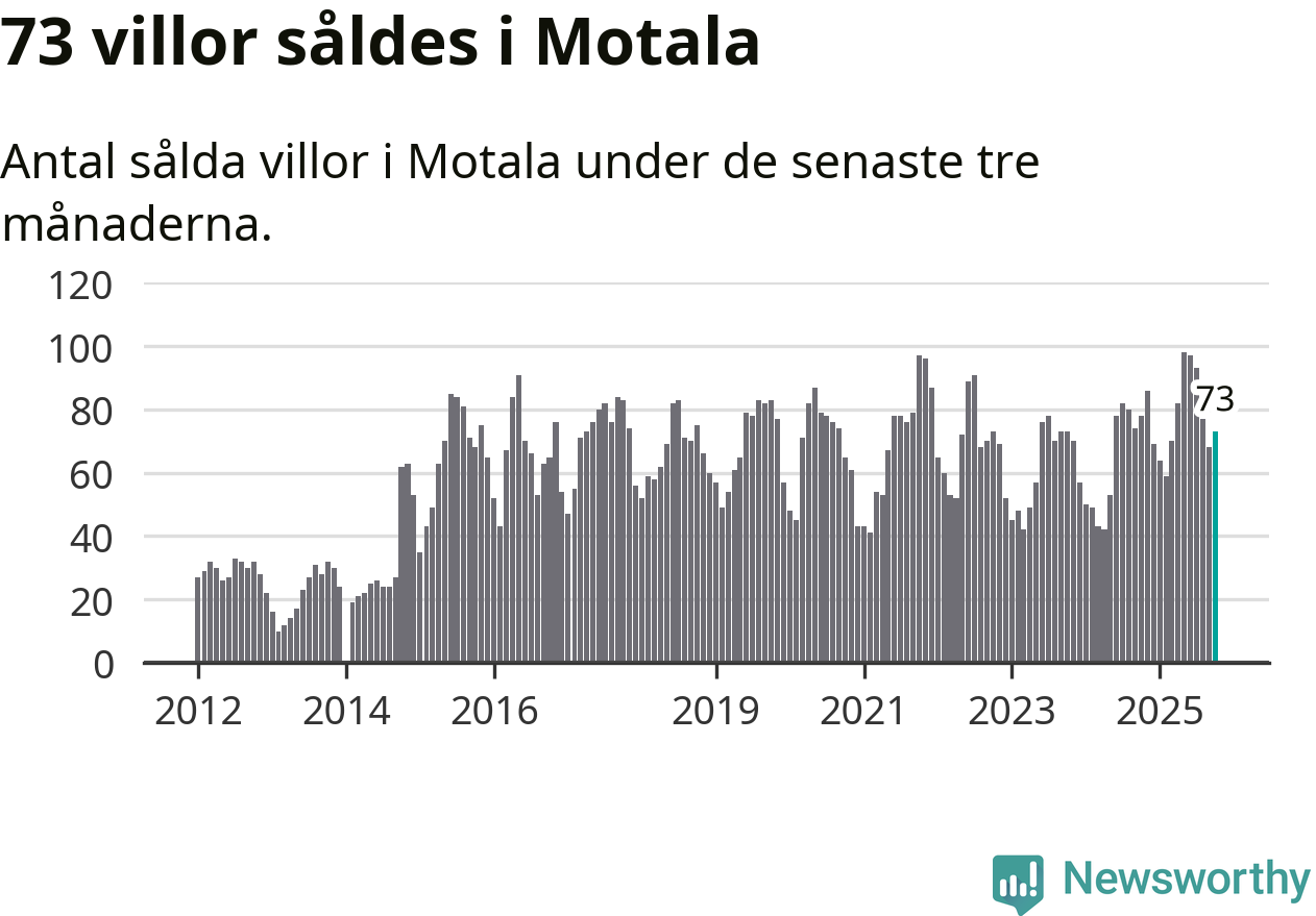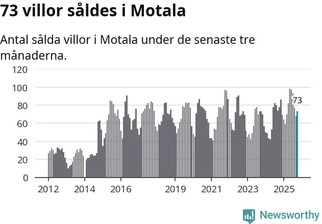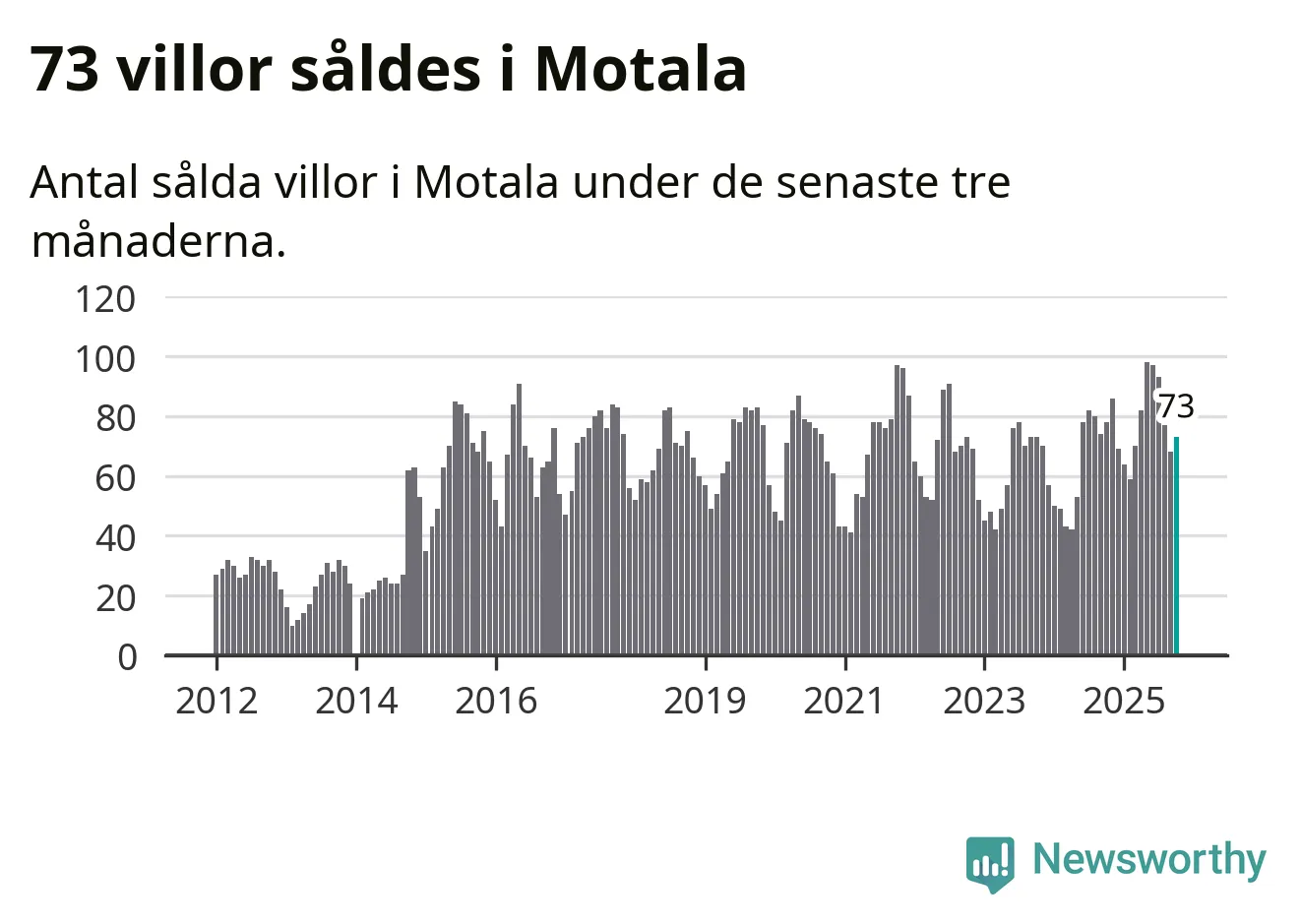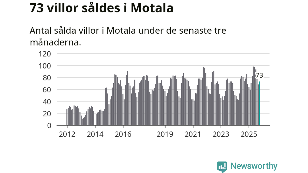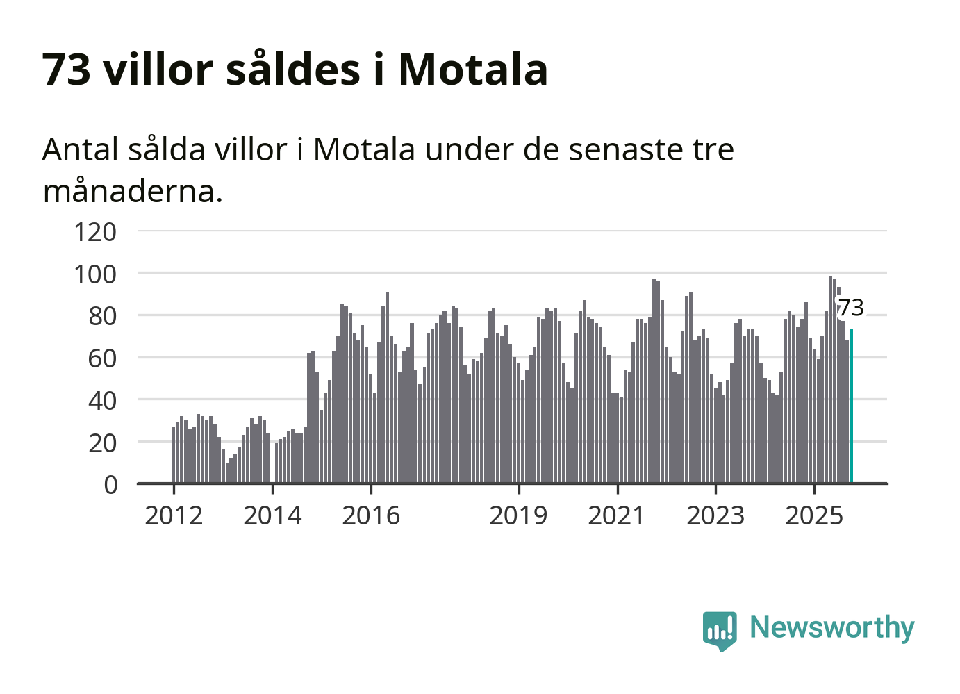Mellan augusti och oktober såldes 73 villor i Motala kommun. Det är relativt få sett till aktiviteten på bostadsmarknaden i kommunen under de senaste tolv månaderna, samt det historiska snittet för den här tiden på året.