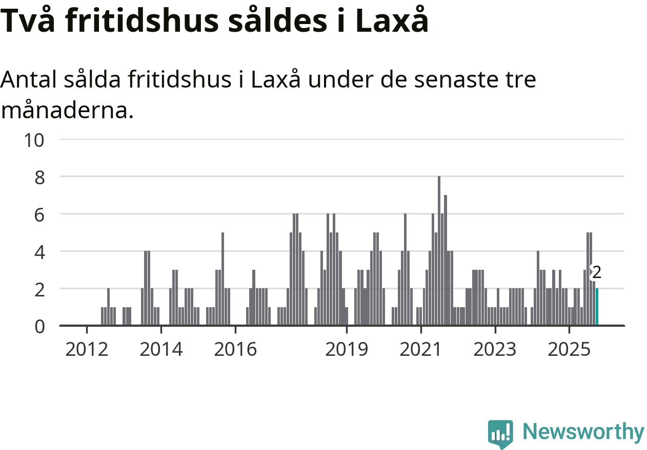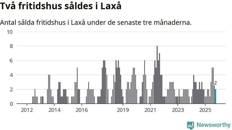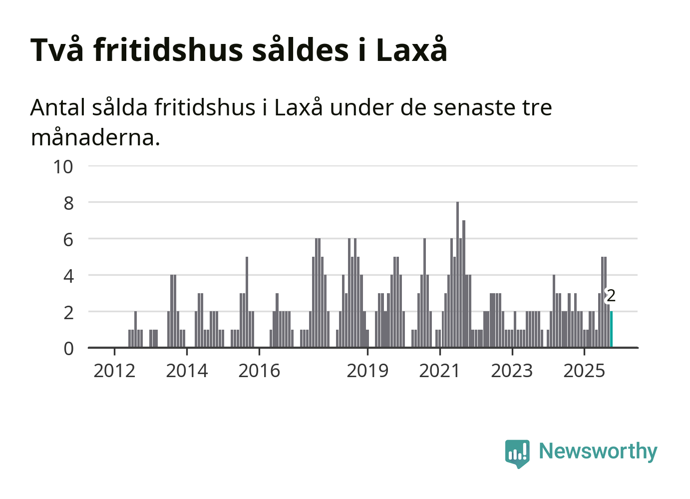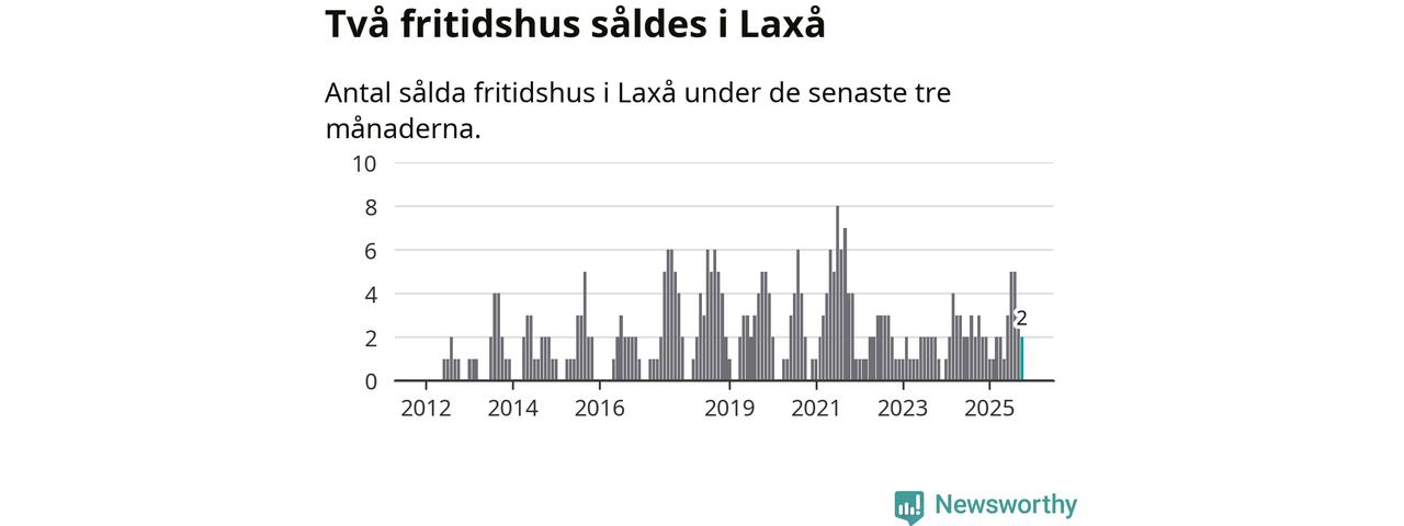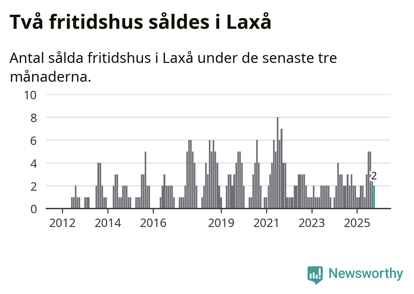 Mellan augusti och oktober gjordes sammanlagt två affärer med fritidshus i Laxå kommun. Det kan jämföras med tre vid motsvarande tid i fjol.