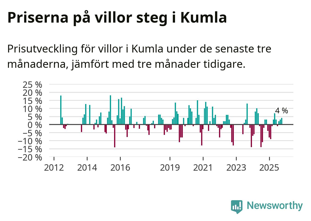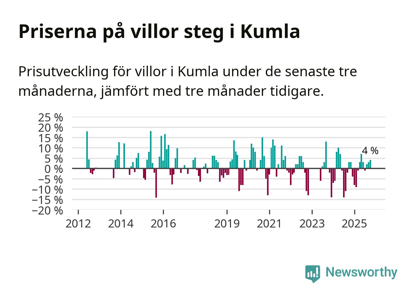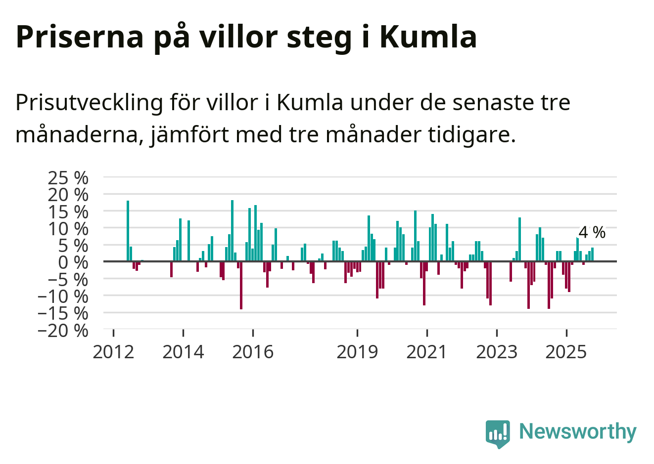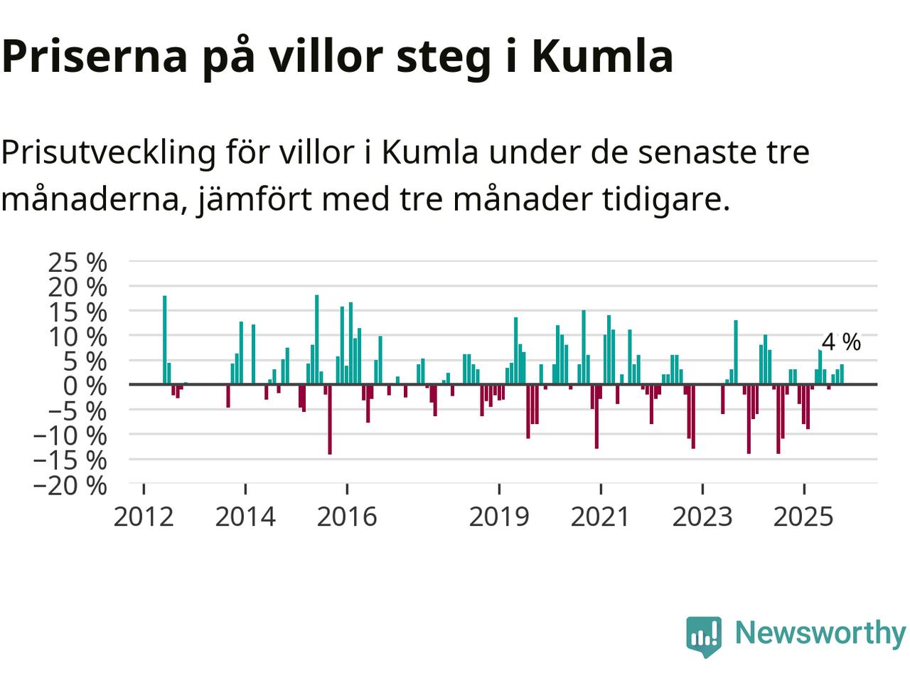 Villapriserna har gått upp i Kumla kommun. Medelpriset på försäljningarna under de senaste tre månaderna visar på en uppgång med 4 procent.