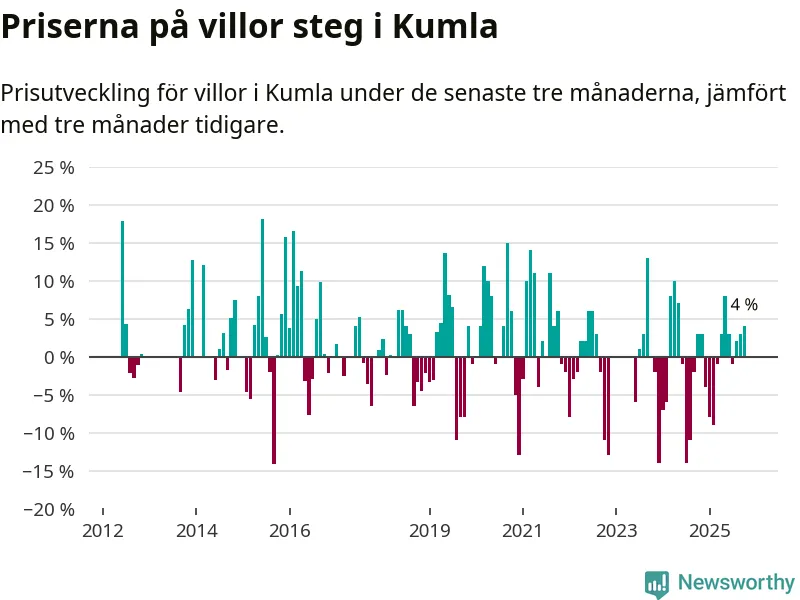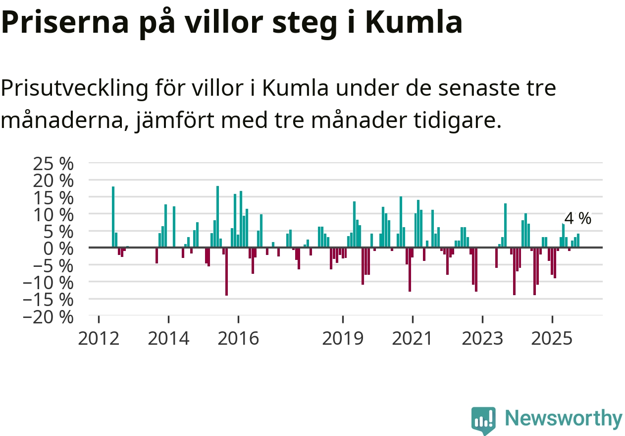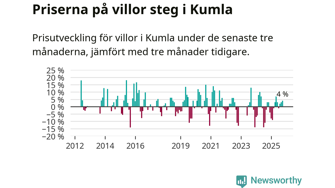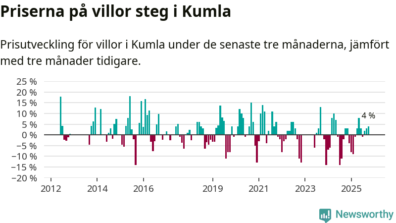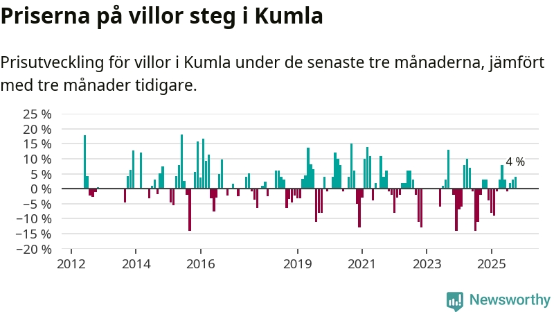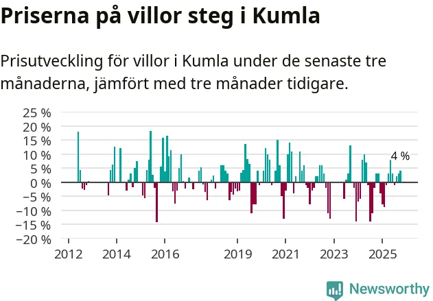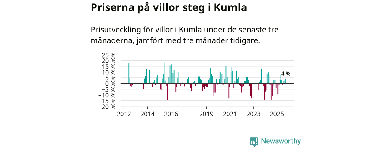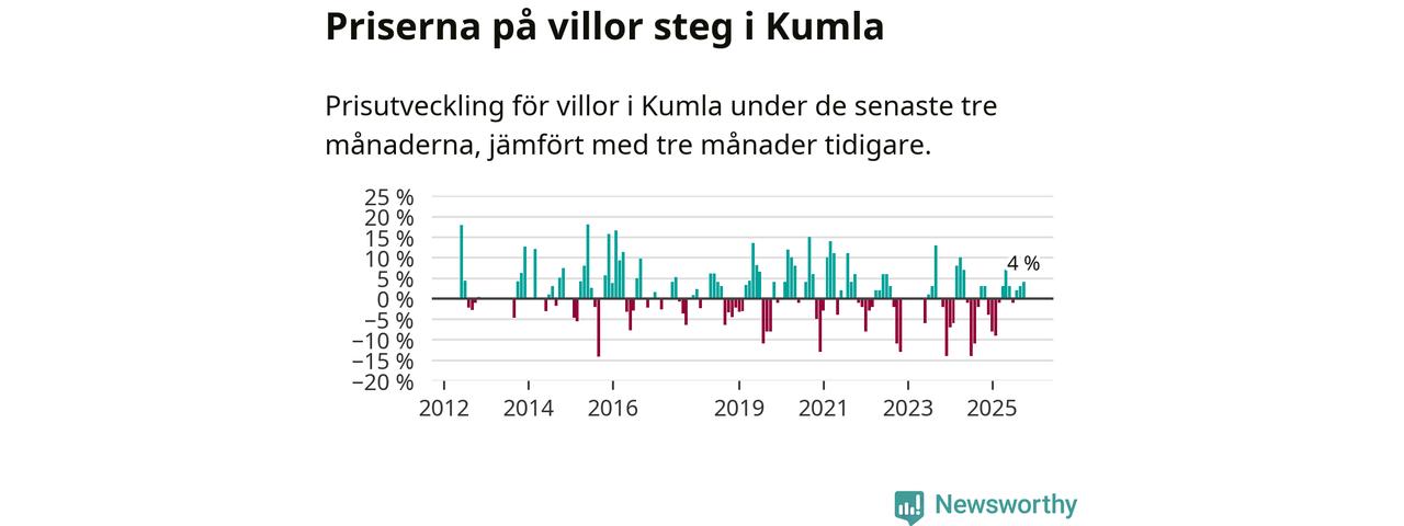 Villapriserna har gått upp i Kumla kommun. Medelpriset på försäljningarna under de senaste tre månaderna visar på en uppgång med 4 procent.