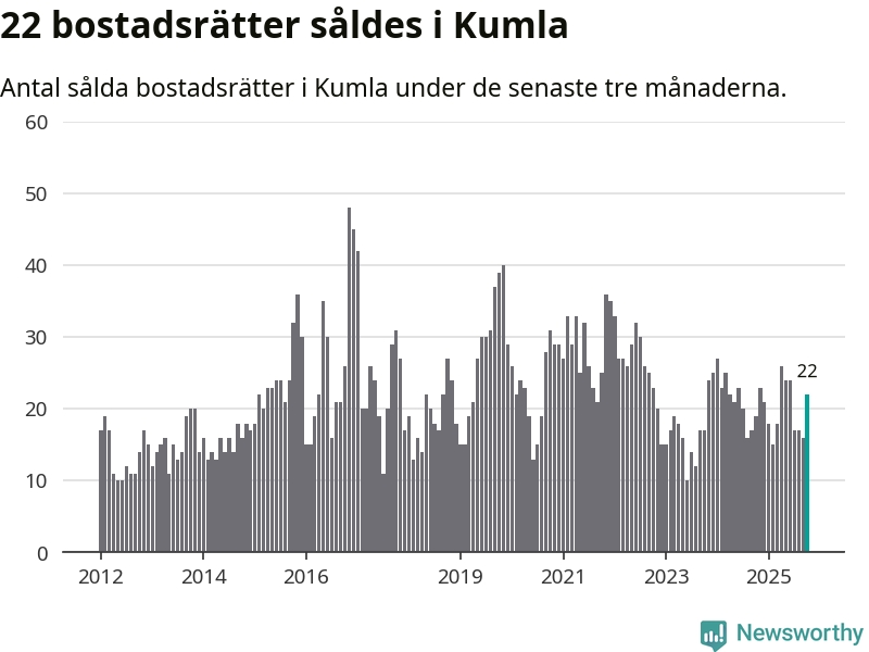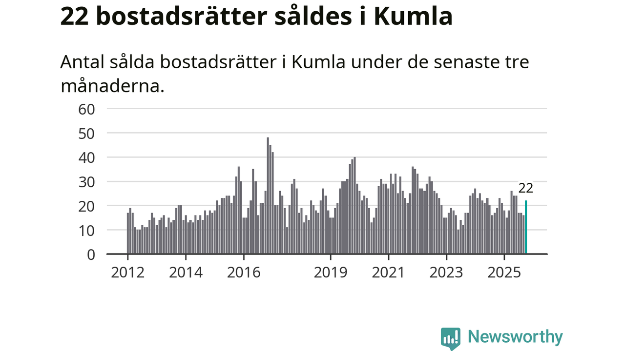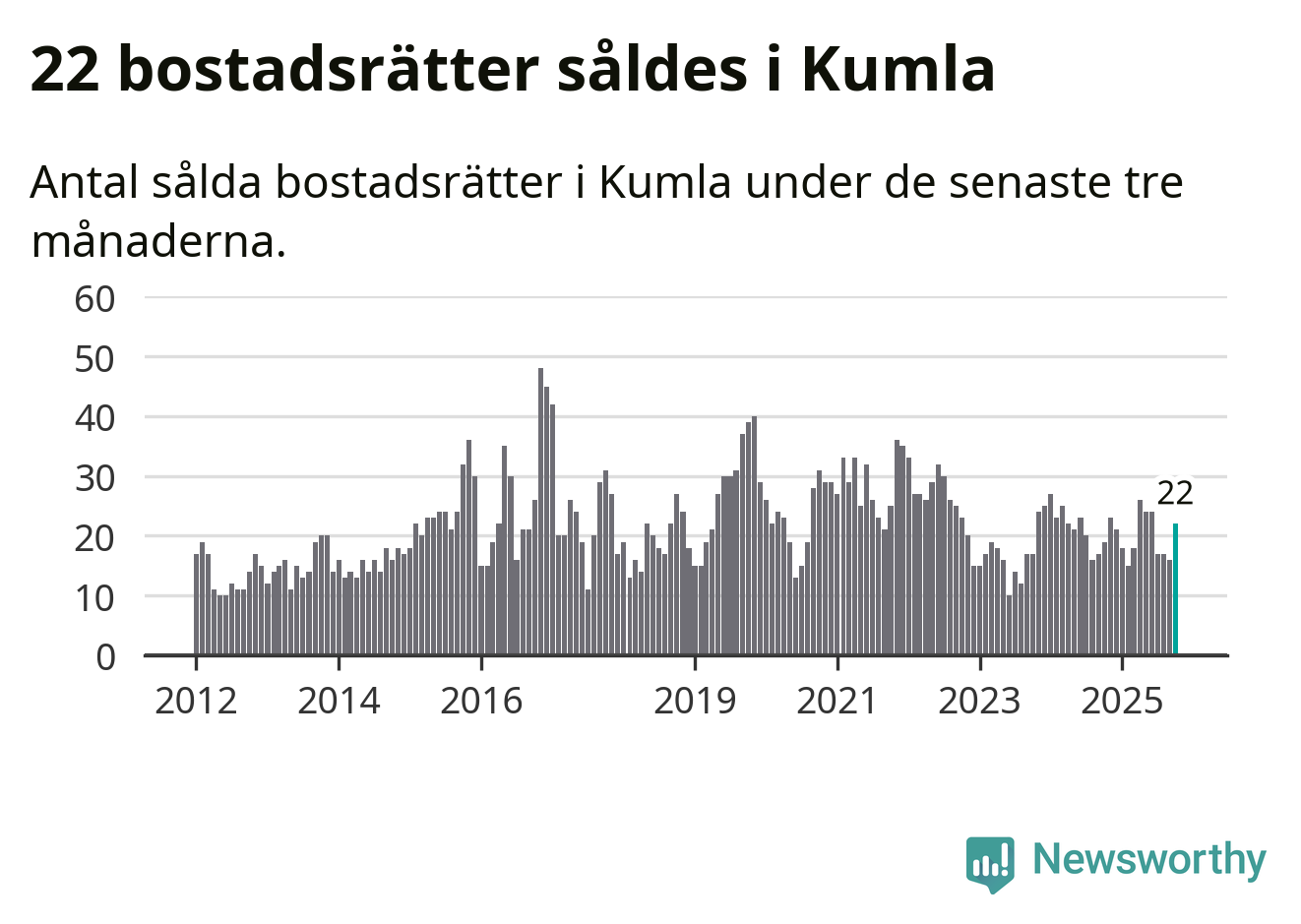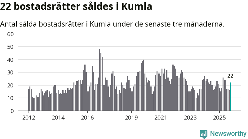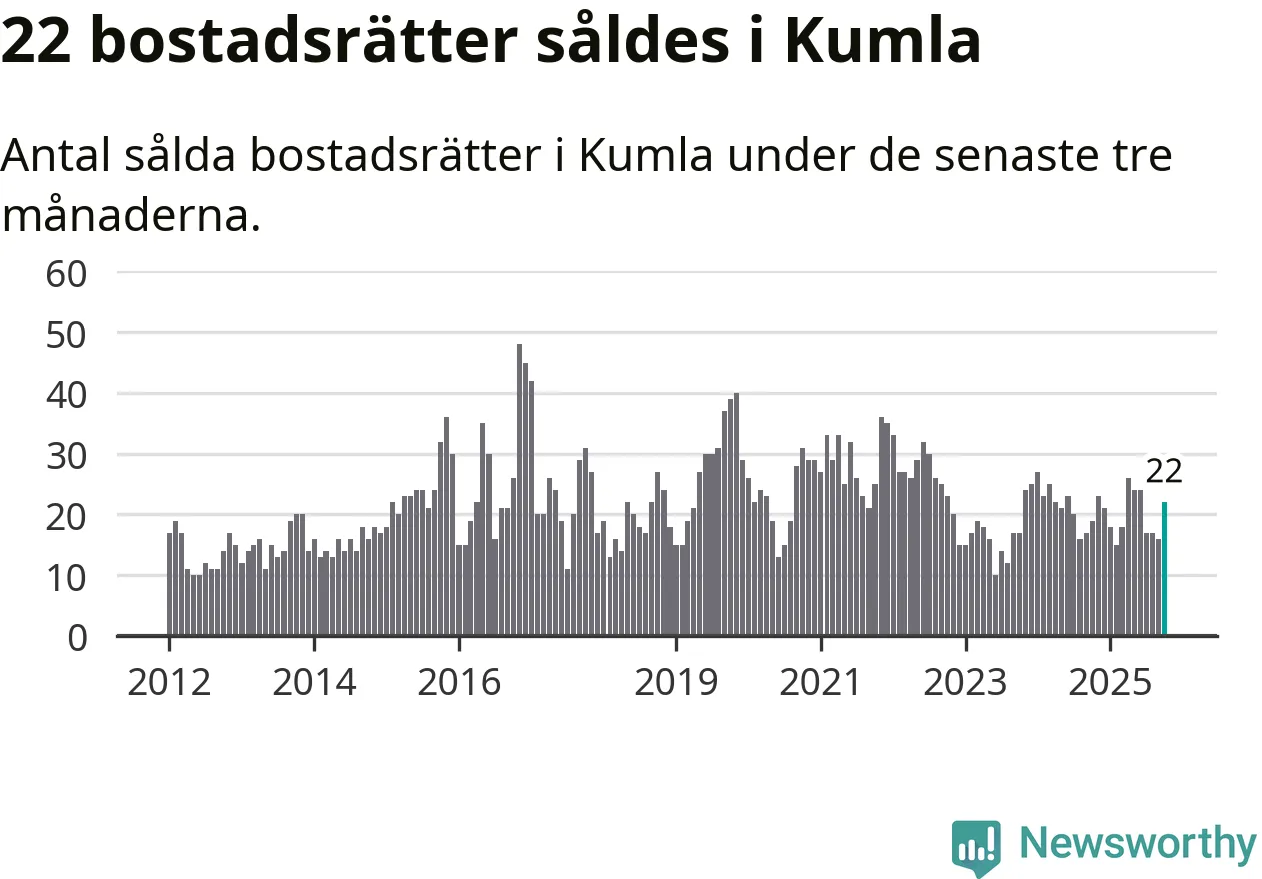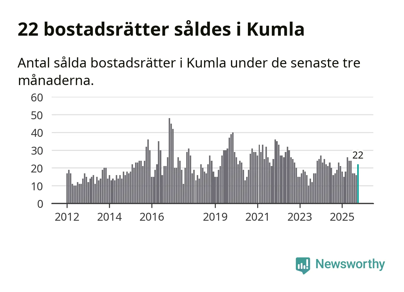 Mellan augusti och oktober gjordes sammanlagt 22 affärer med bostadsrätter i Kumla kommun. Det kan jämföras med 19 vid motsvarande tid i fjol.