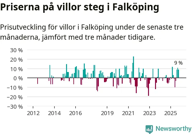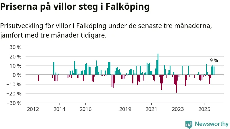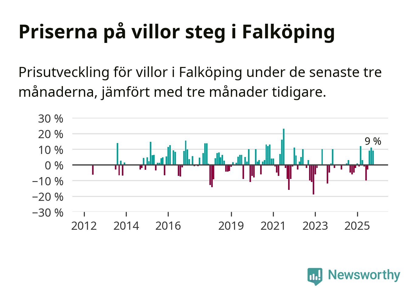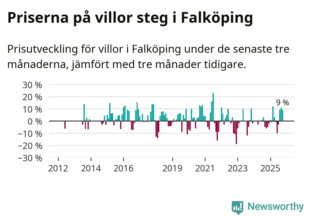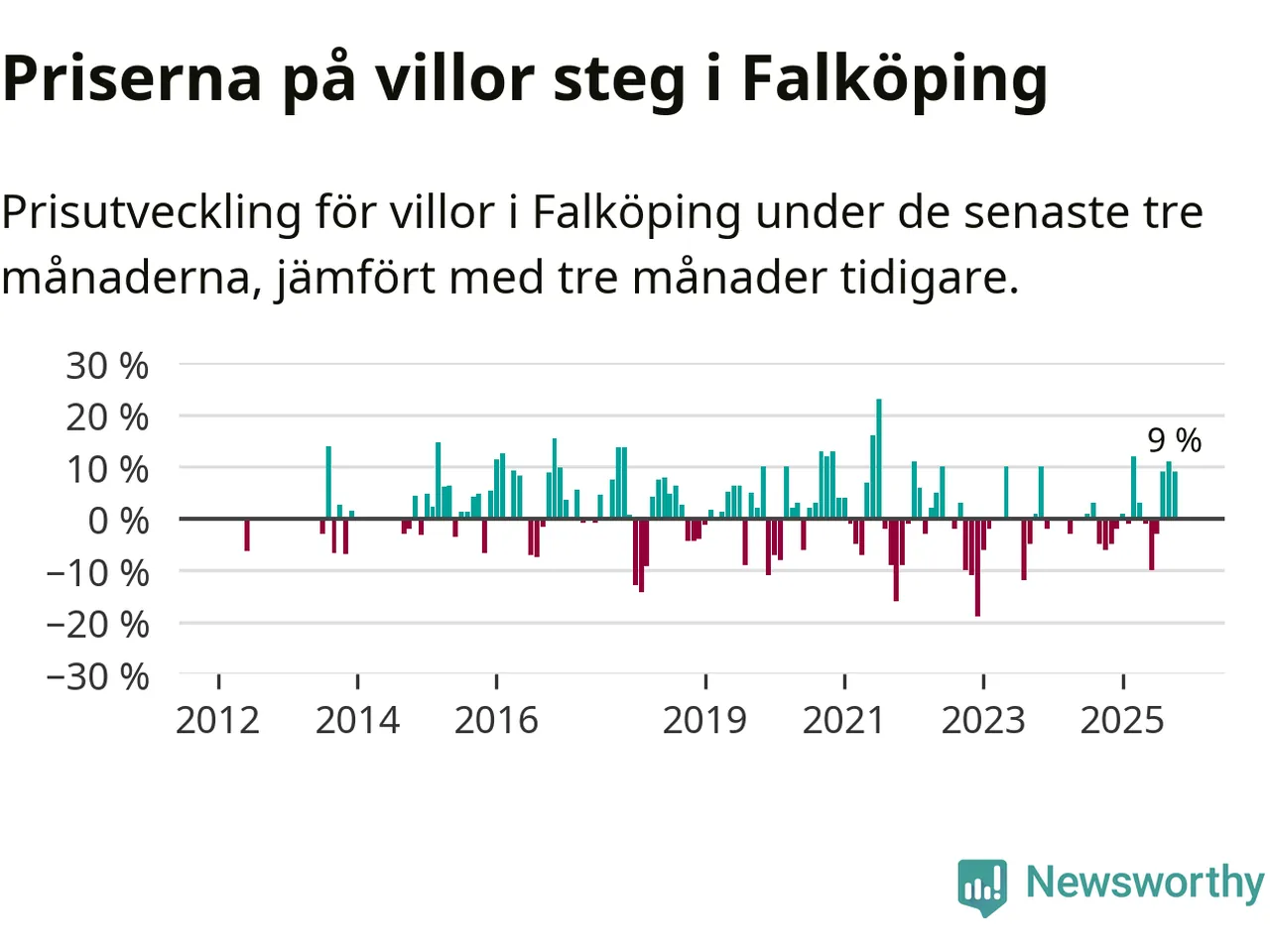 Statistiken visar även på en stor prisuppgång i Falköpings kommun. Medelpriset på försäljningarna av villor i kommunen var 9 procent högre än för tre månader sedan. I hela Västra Götaland däremot sjunker villapriserna. I hela länet noterades en prisnedgång på 1 procent.
