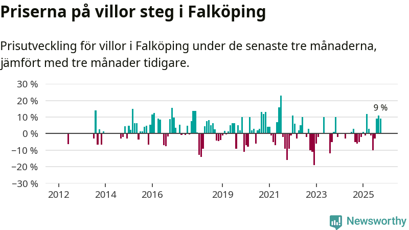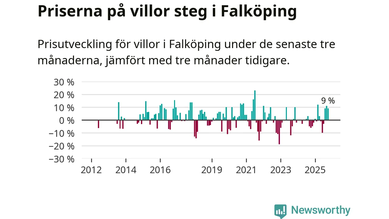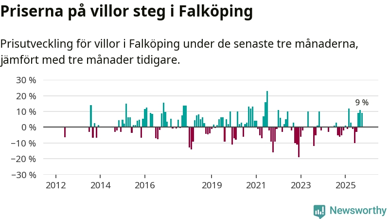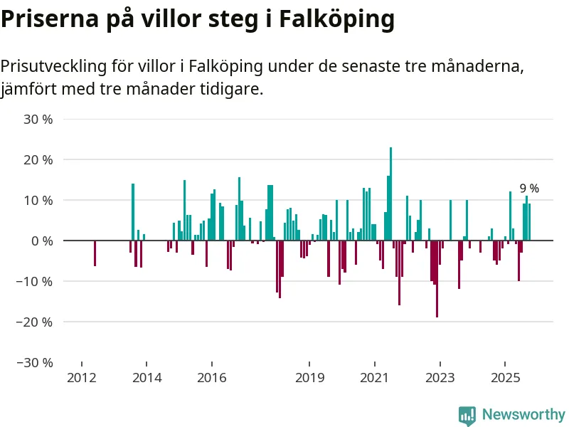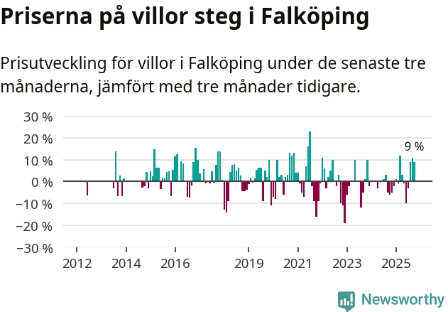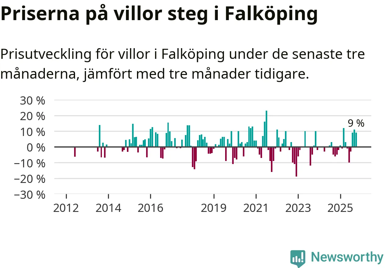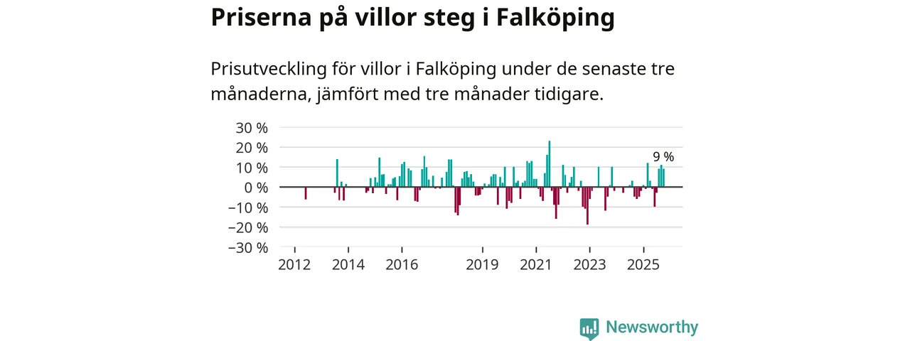 Statistiken visar även på en stor prisuppgång i Falköpings kommun. Medelpriset på försäljningarna av villor i kommunen var 9 procent högre än för tre månader sedan. I hela Västra Götaland däremot sjunker villapriserna. I hela länet noterades en prisnedgång på 1 procent.