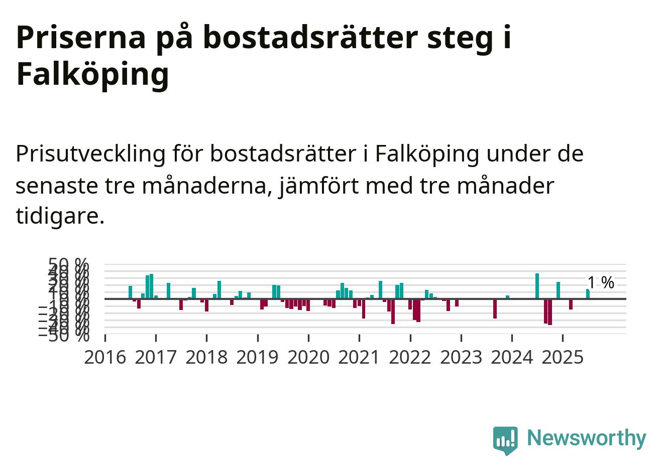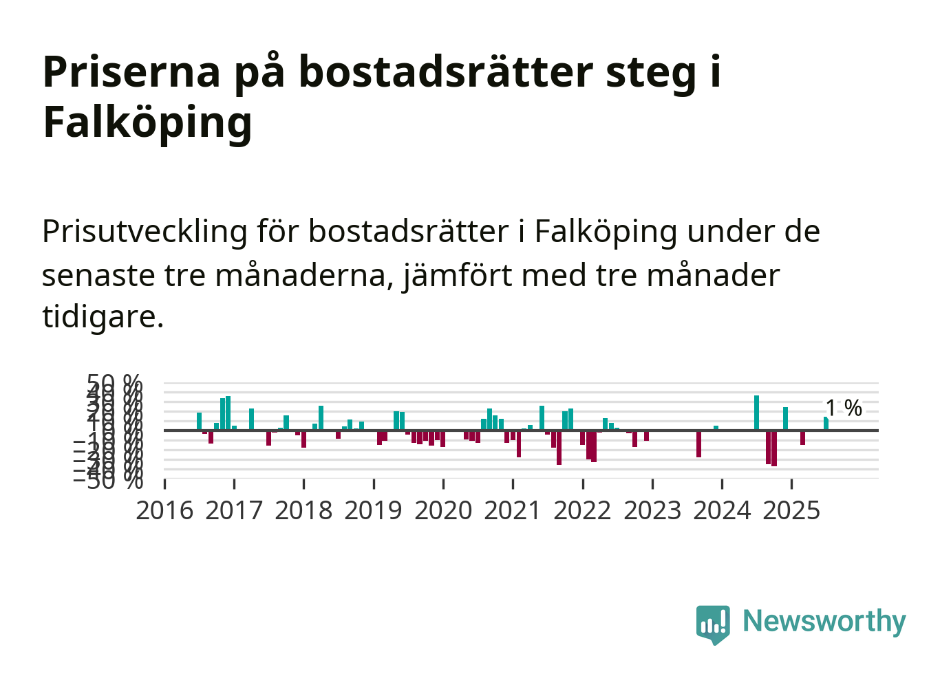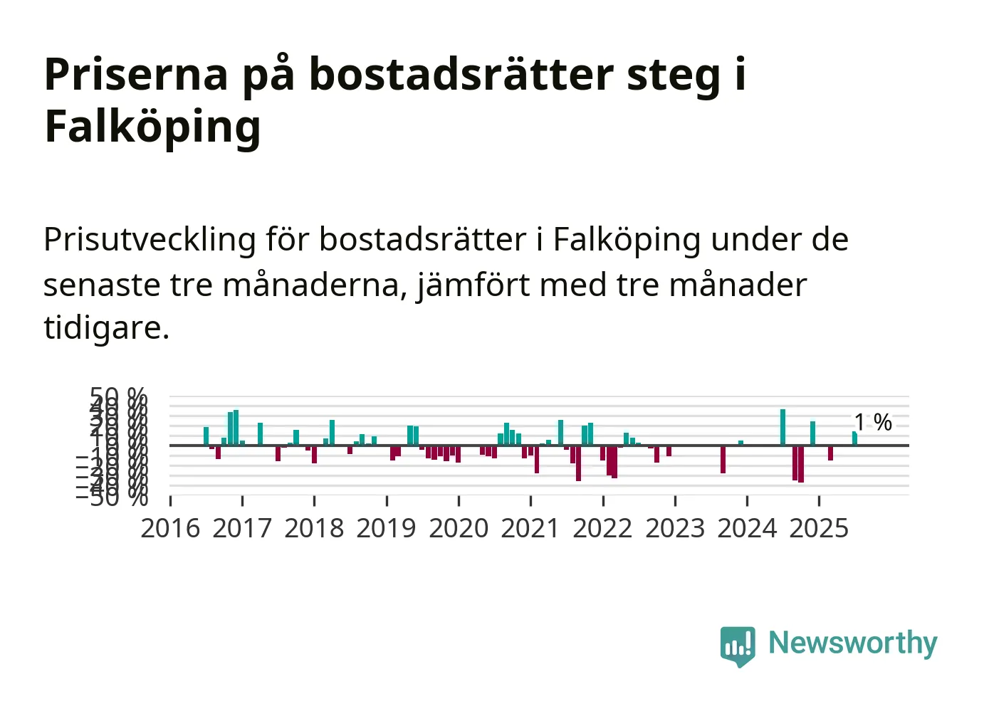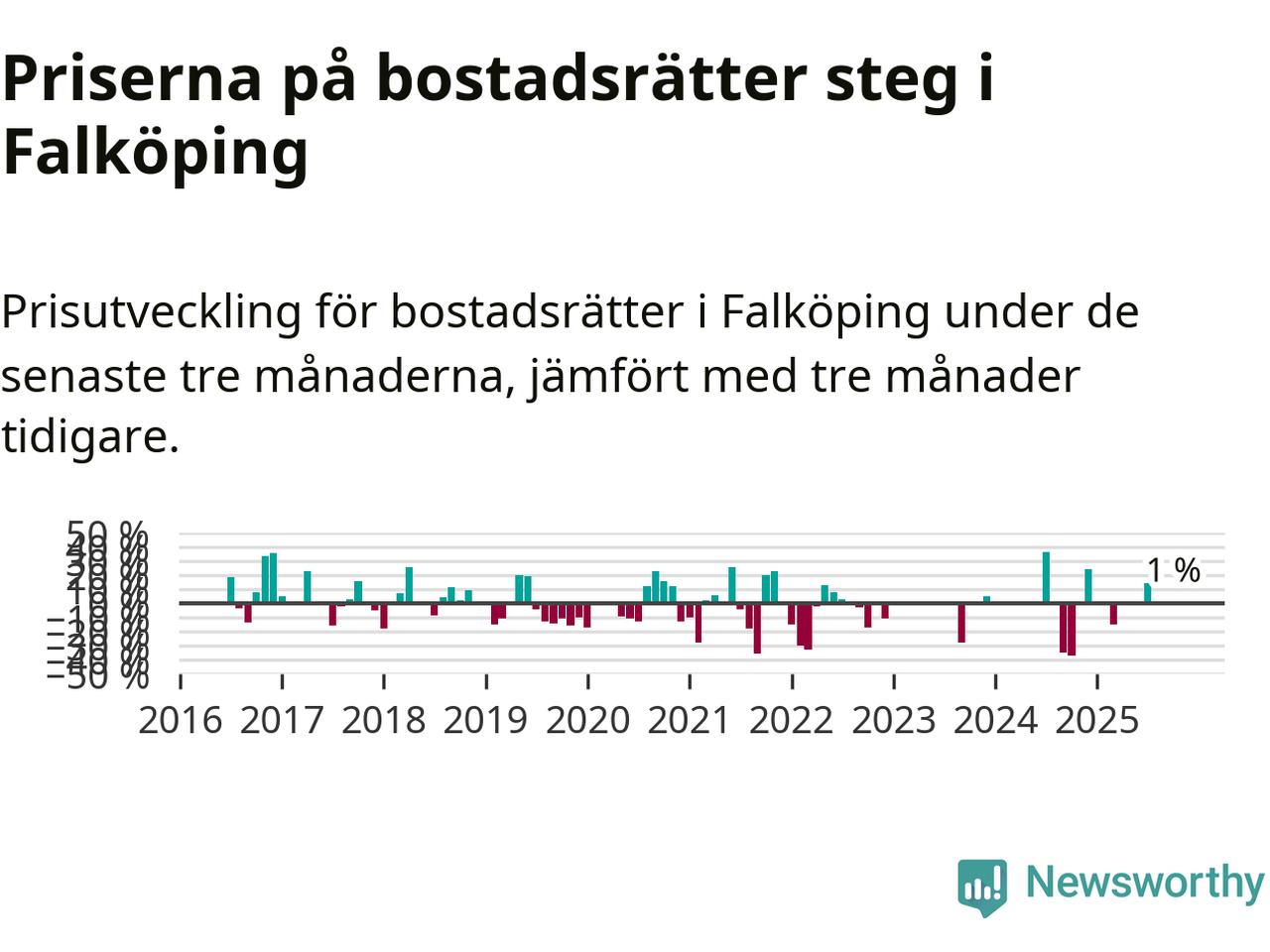 Statistiken visar även på en prisuppgång i Falköpings kommun. Medelpriset på försäljningarna av bostadsrätter i kommunen var 1 procent högre än för tre månader sedan. I hela Västra Götaland däremot ligger priserna på bostadsrätter stilla.