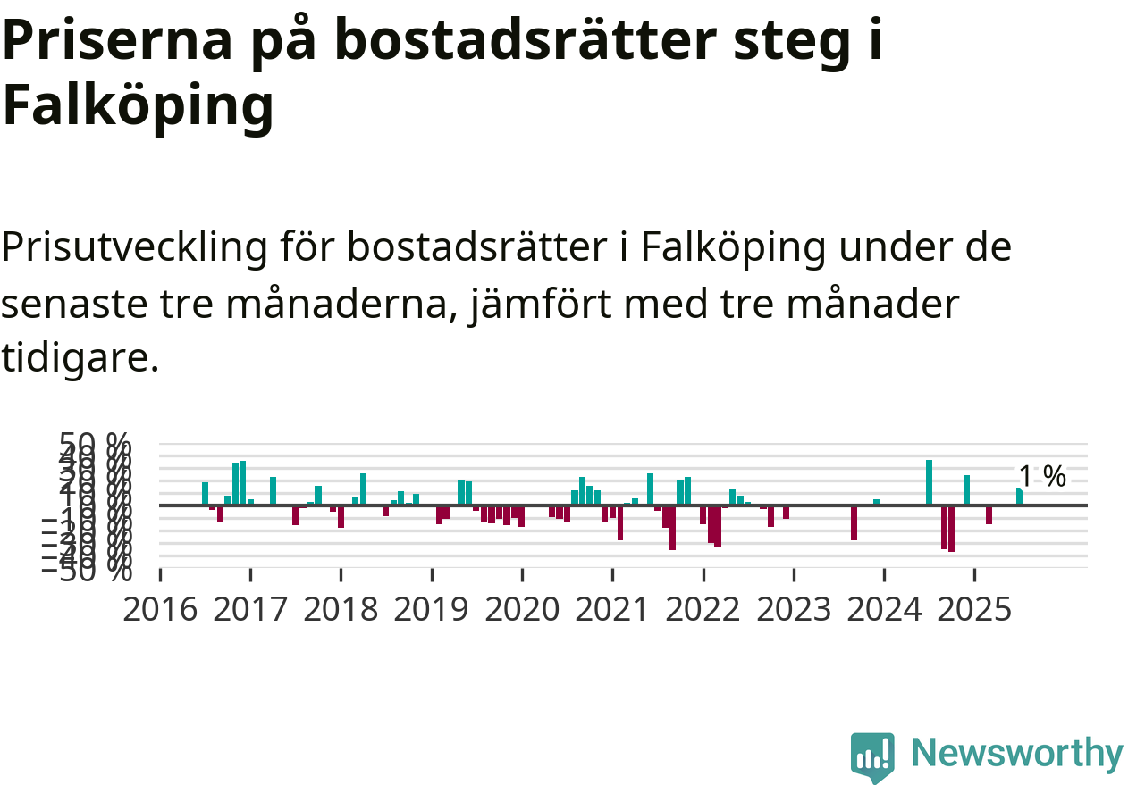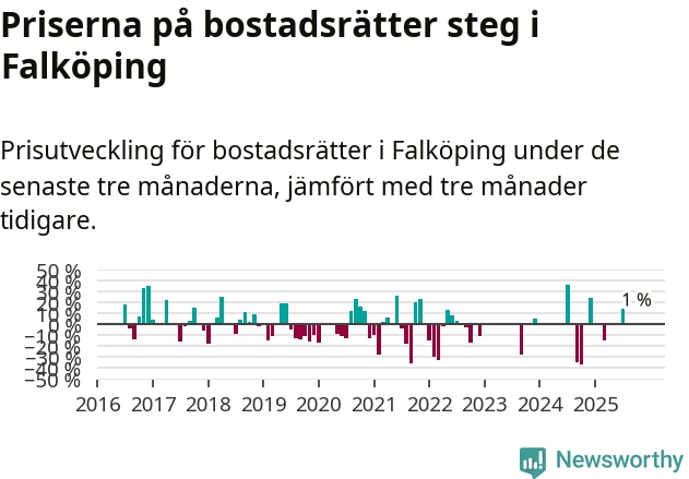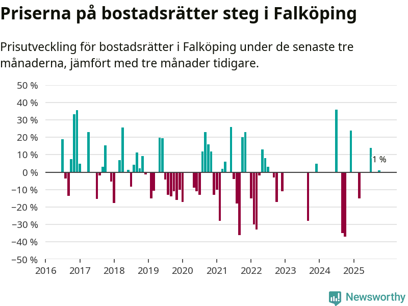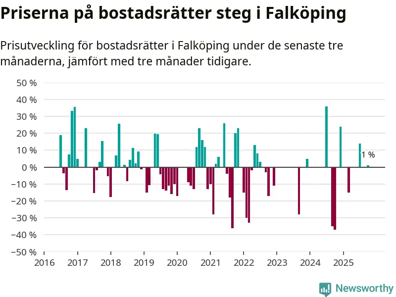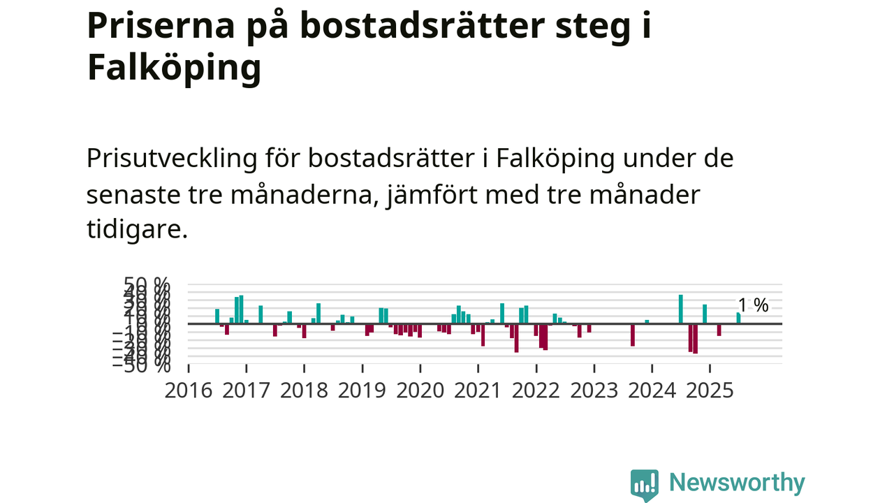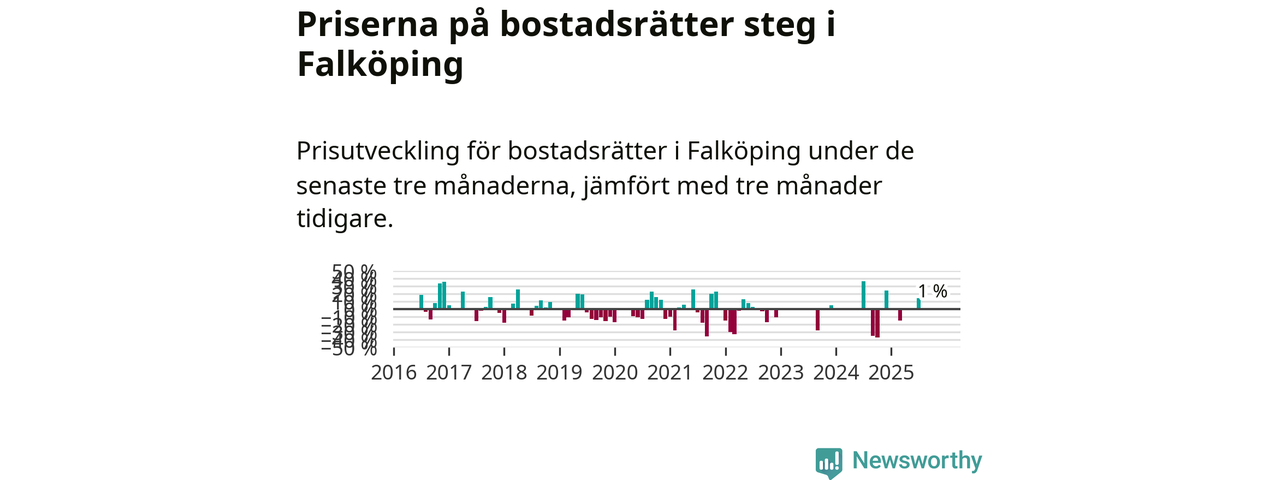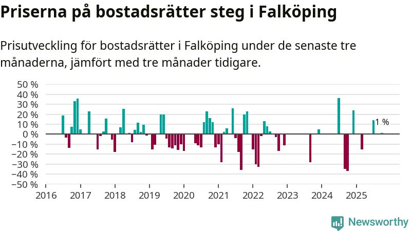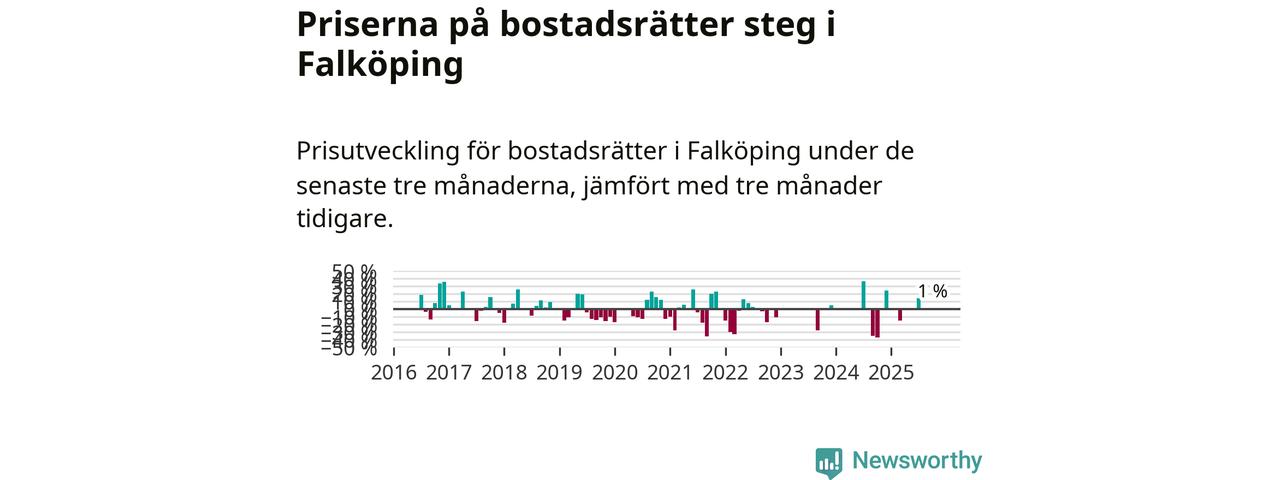 Statistiken visar även på en prisuppgång i Falköpings kommun. Medelpriset på försäljningarna av bostadsrätter i kommunen var 1 procent högre än för tre månader sedan. I hela Västra Götaland däremot ligger priserna på bostadsrätter stilla.