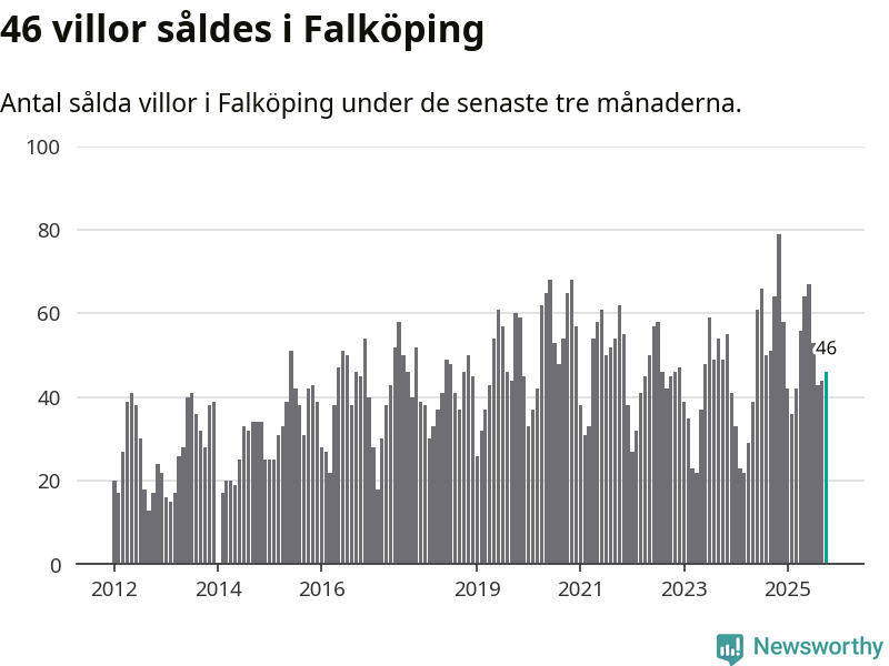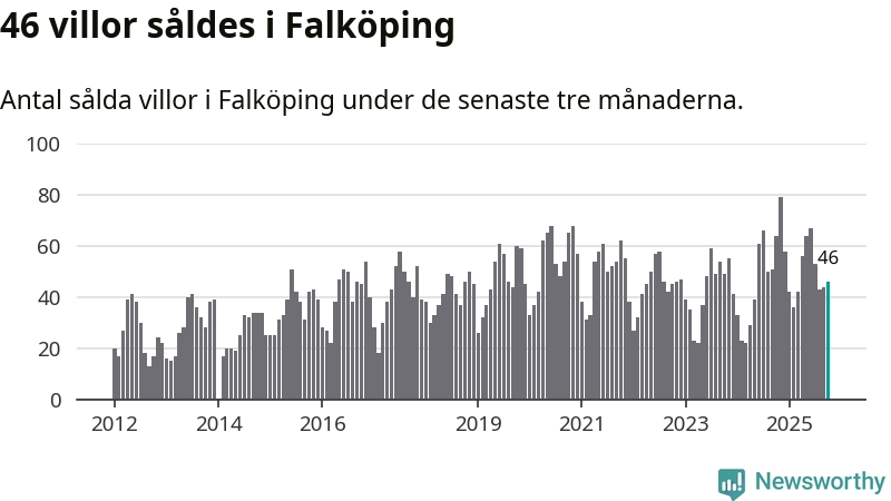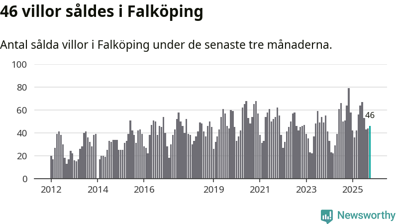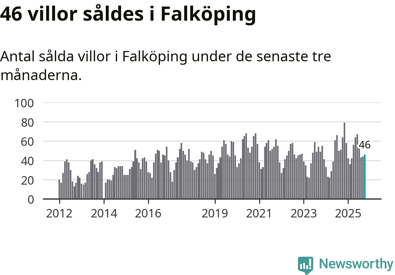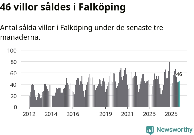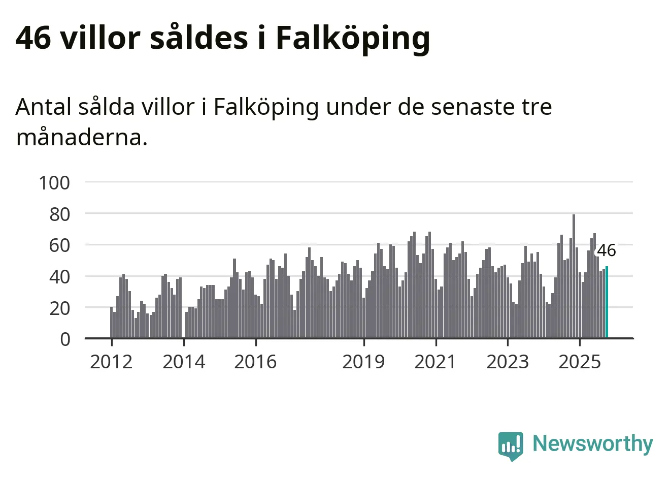 Mellan augusti och oktober såldes 46 villor i Falköpings kommun. Det är relativt få sett till aktiviteten på bostadsmarknaden i kommunen under de senaste tolv månaderna, samt det historiska snittet för den här tiden på året.
