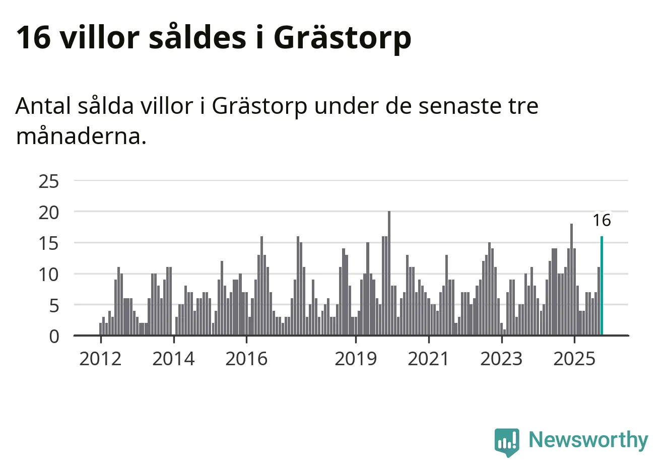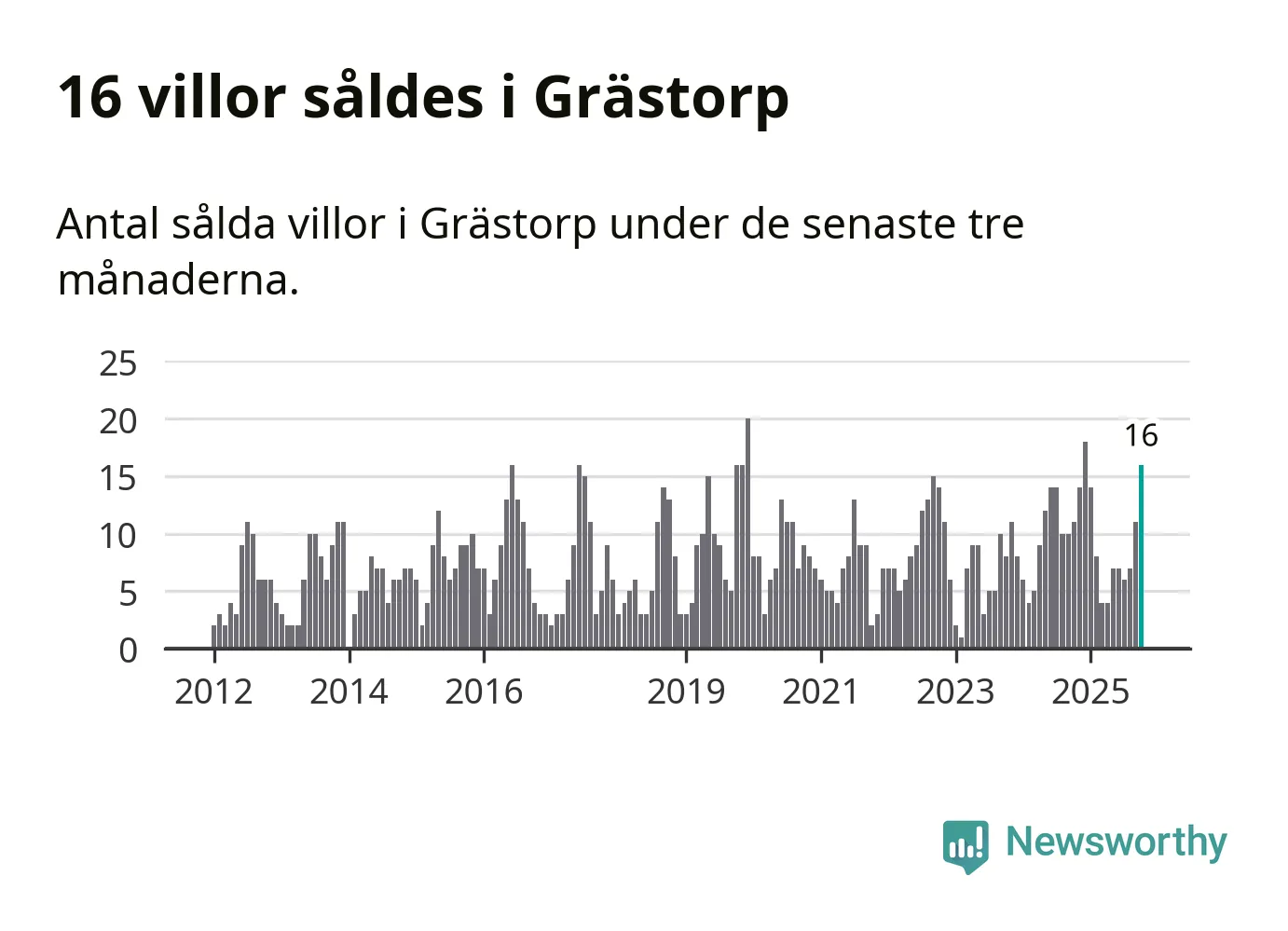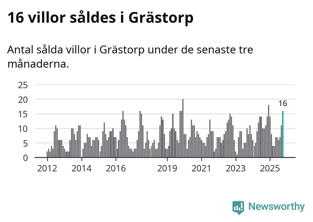 Mellan augusti och oktober gjordes sammanlagt 16 affärer med villor i Grästorps kommun. Det kan jämföras med elva vid motsvarande tid i fjol.