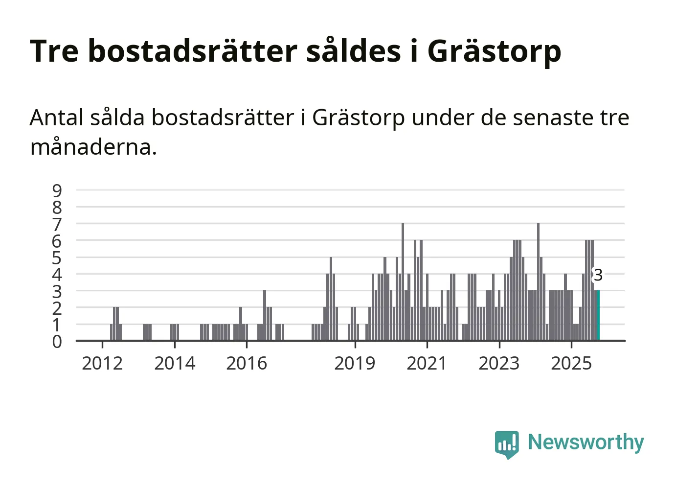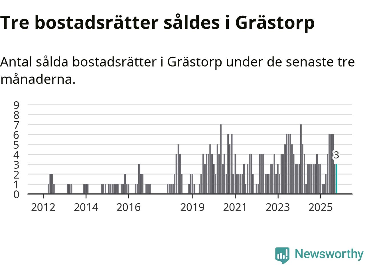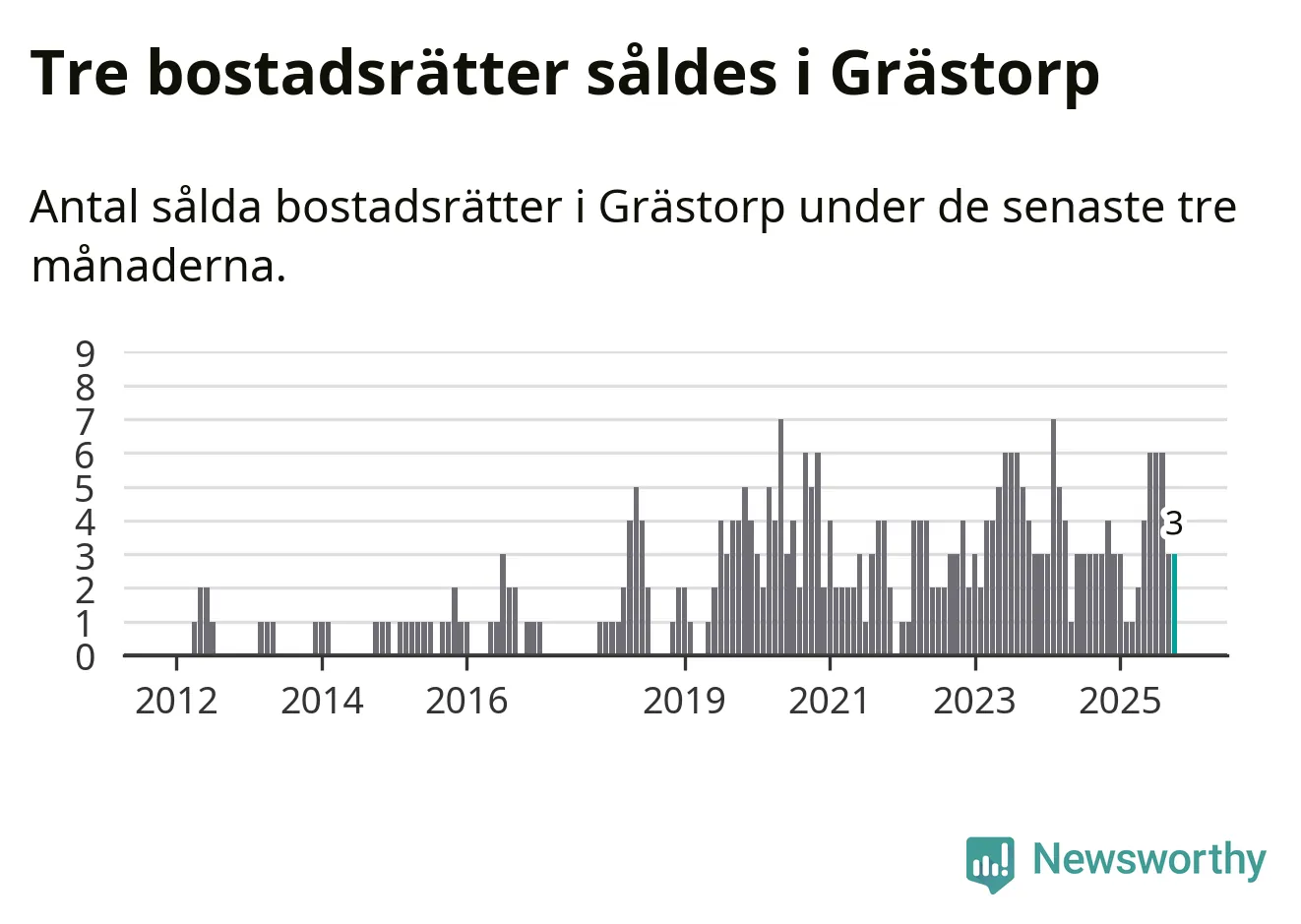 Mellan augusti och oktober gjordes sammanlagt tre affärer med bostadsrätter i Grästorps kommun. Det är lika många affärer som vid motsvarande tid i fjol.