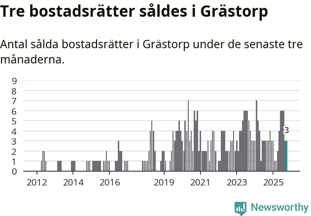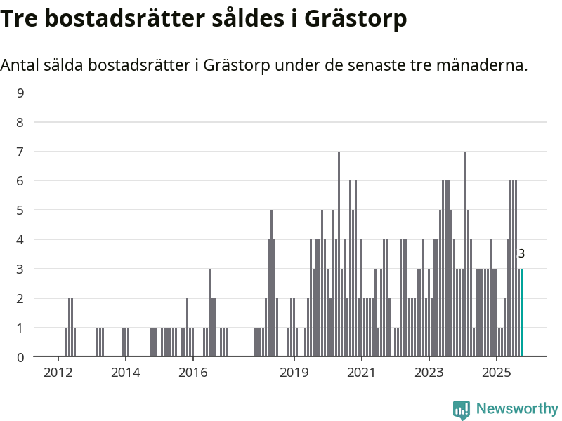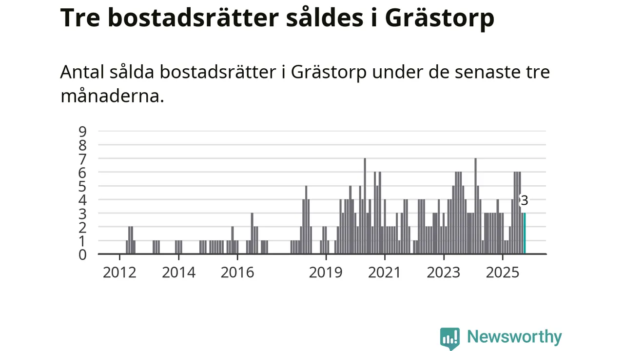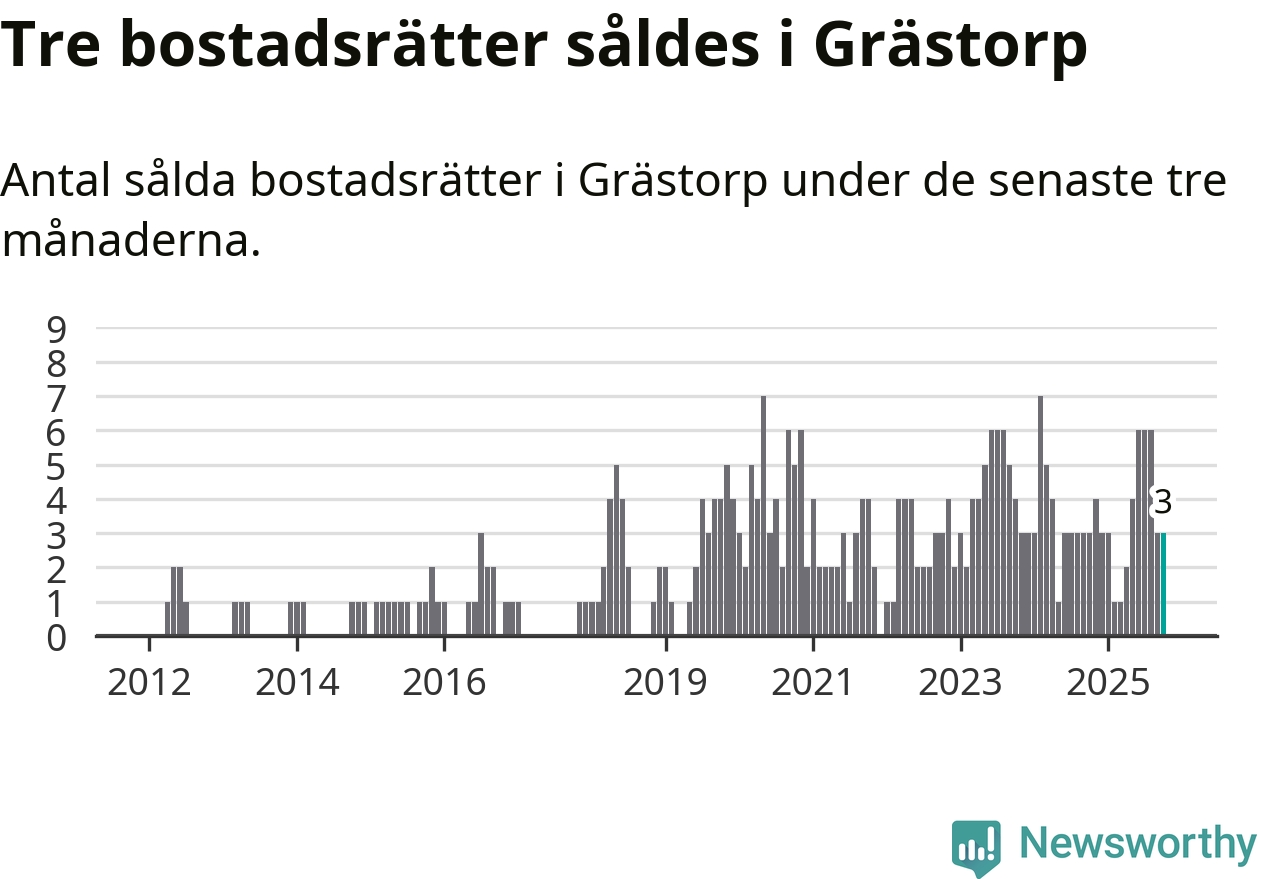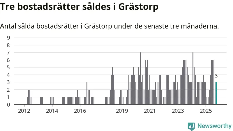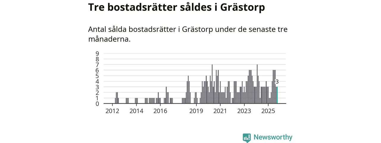 Mellan augusti och oktober gjordes sammanlagt tre affärer med bostadsrätter i Grästorps kommun. Det är lika många affärer som vid motsvarande tid i fjol.
