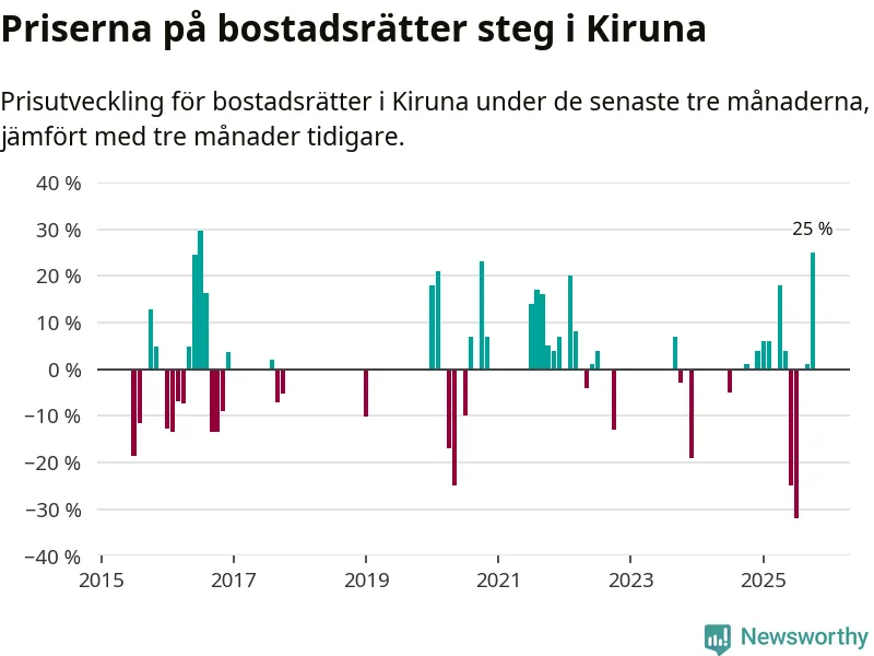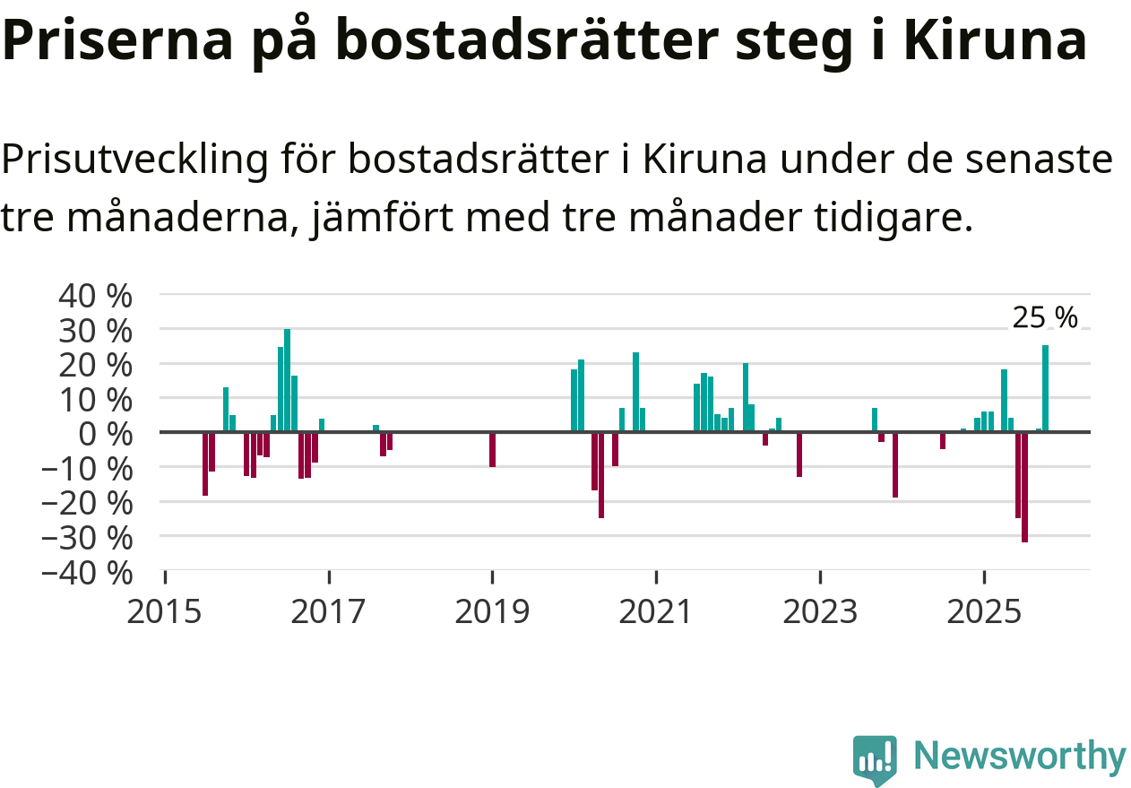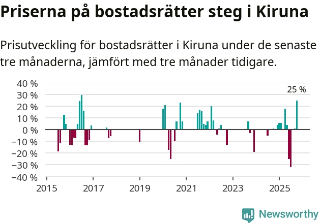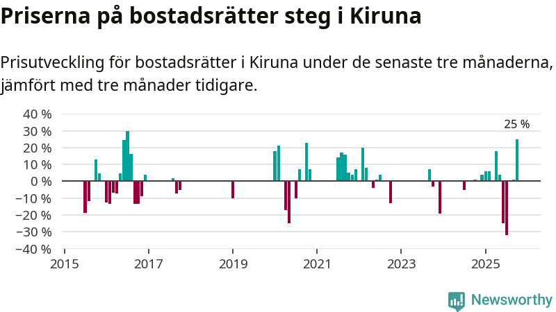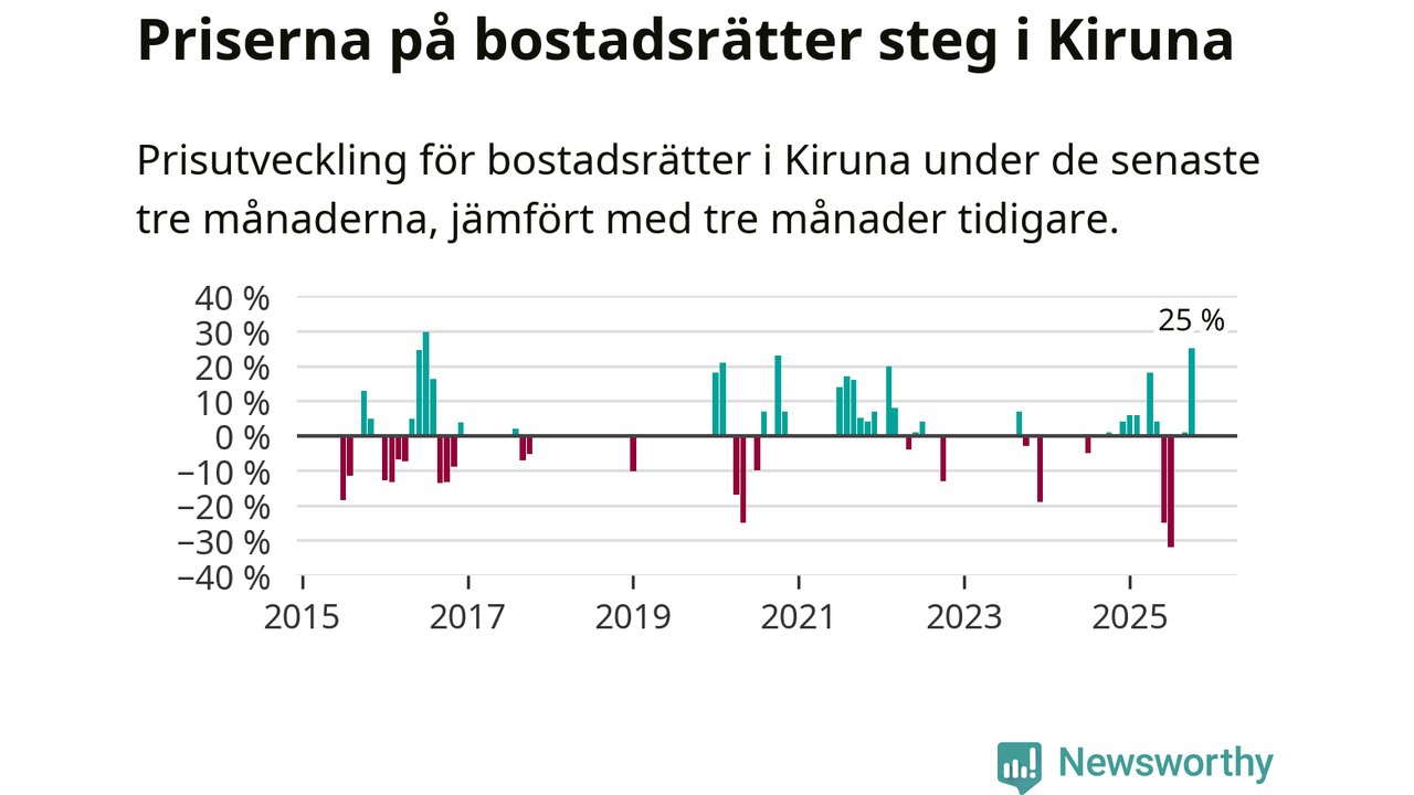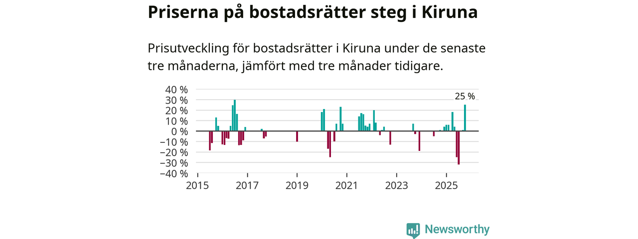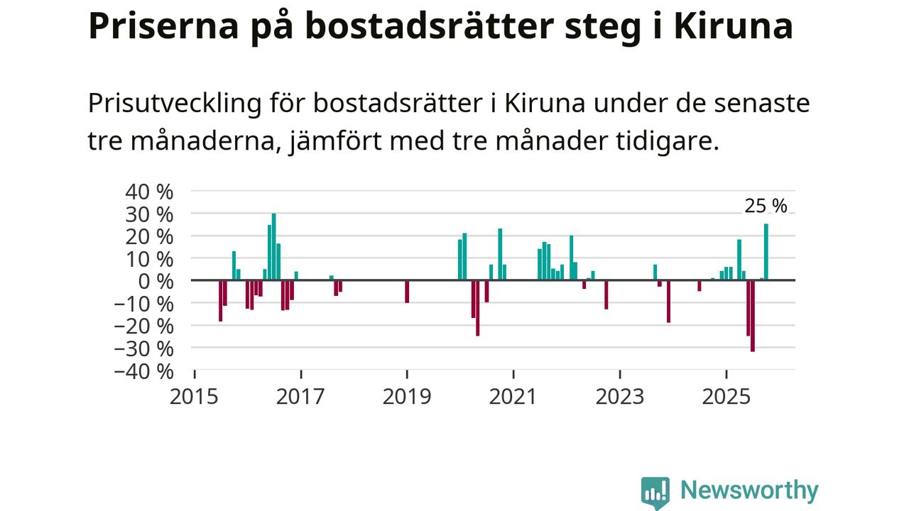 Statistiken visar även på en stor prisuppgång i Kiruna kommun. Medelpriset på försäljningarna av bostadsrätter i kommunen var 25 procent högre än för tre månader sedan. Även i hela Norrbotten ökar priserna på bostadsrätter. I hela länet noterades en prisuppgång på 2 procent.