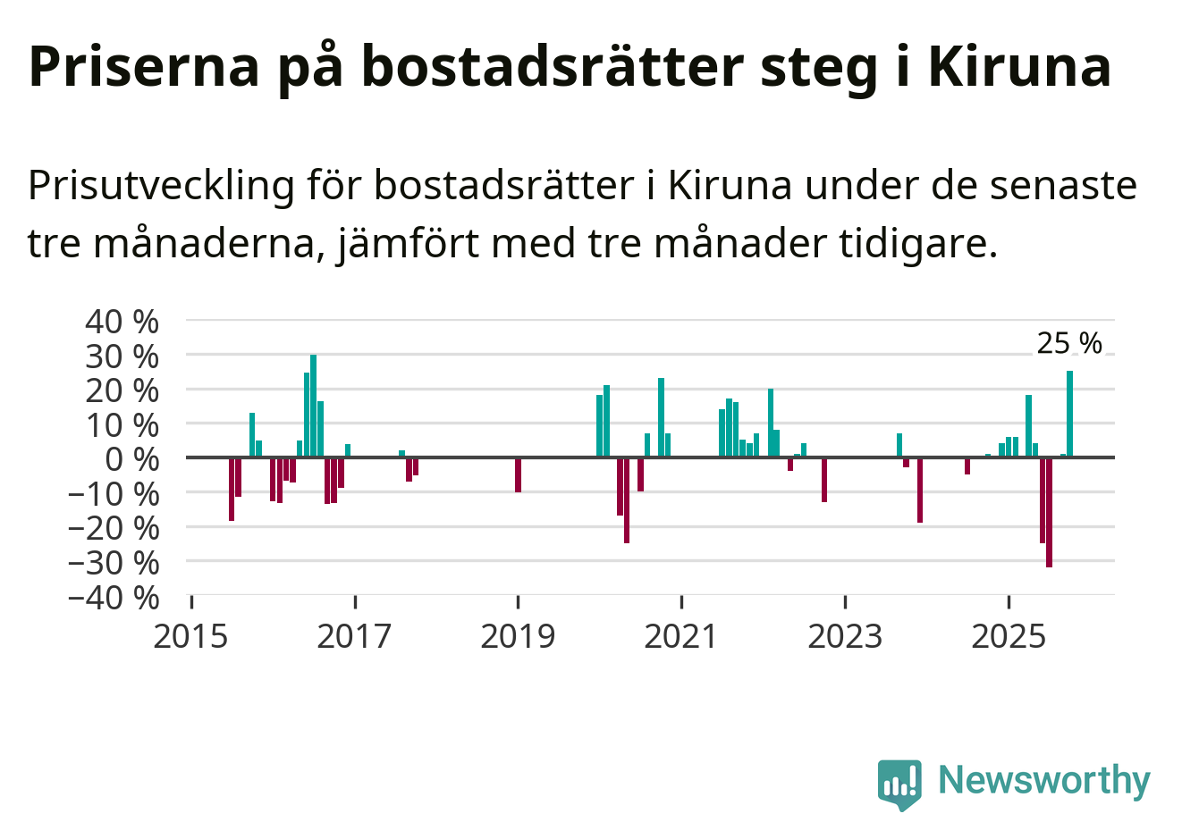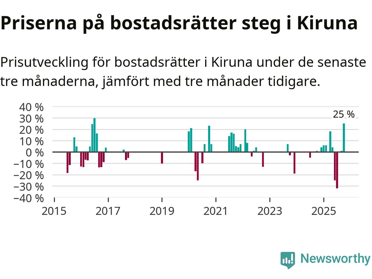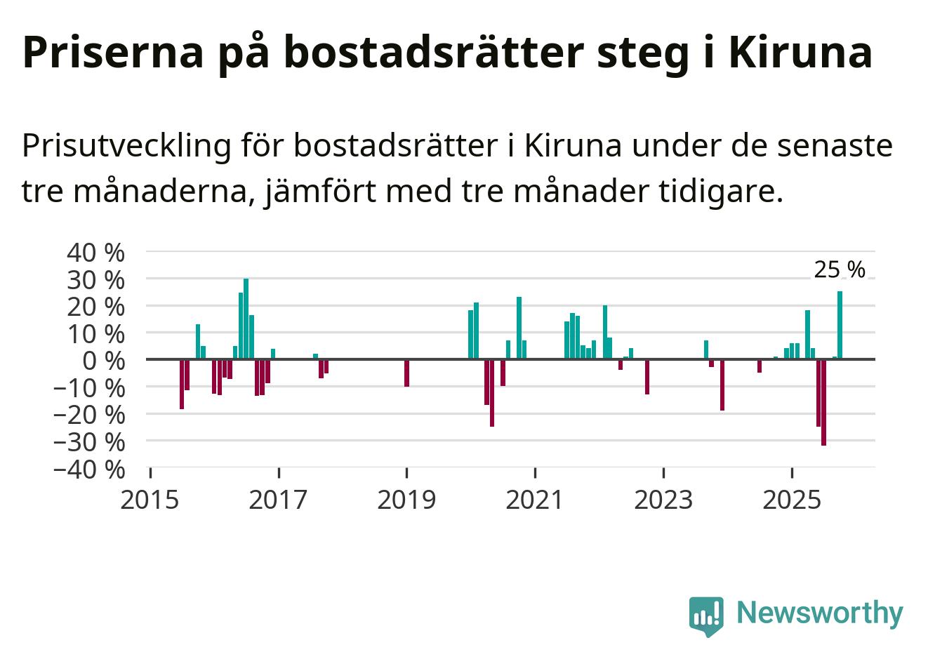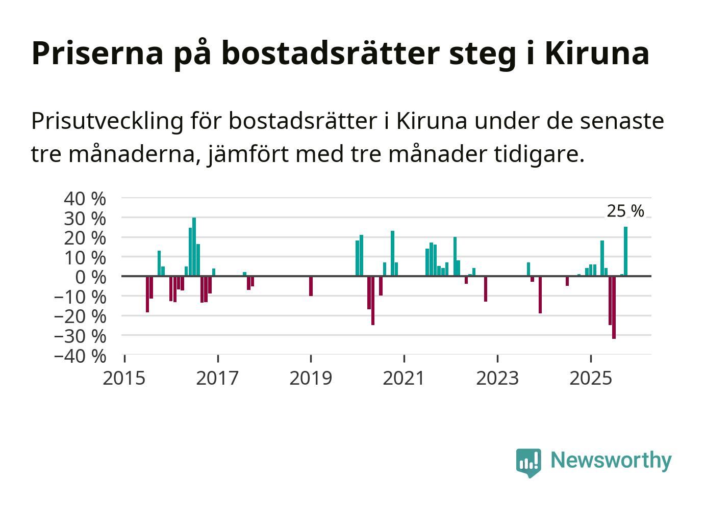Statistiken visar även på en stor prisuppgång i Kiruna kommun. Medelpriset på försäljningarna av bostadsrätter i kommunen var 25 procent högre än för tre månader sedan. Även i hela Norrbotten ökar priserna på bostadsrätter. I hela länet noterades en prisuppgång på 2 procent.