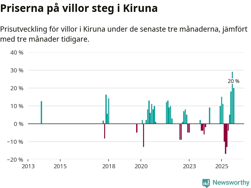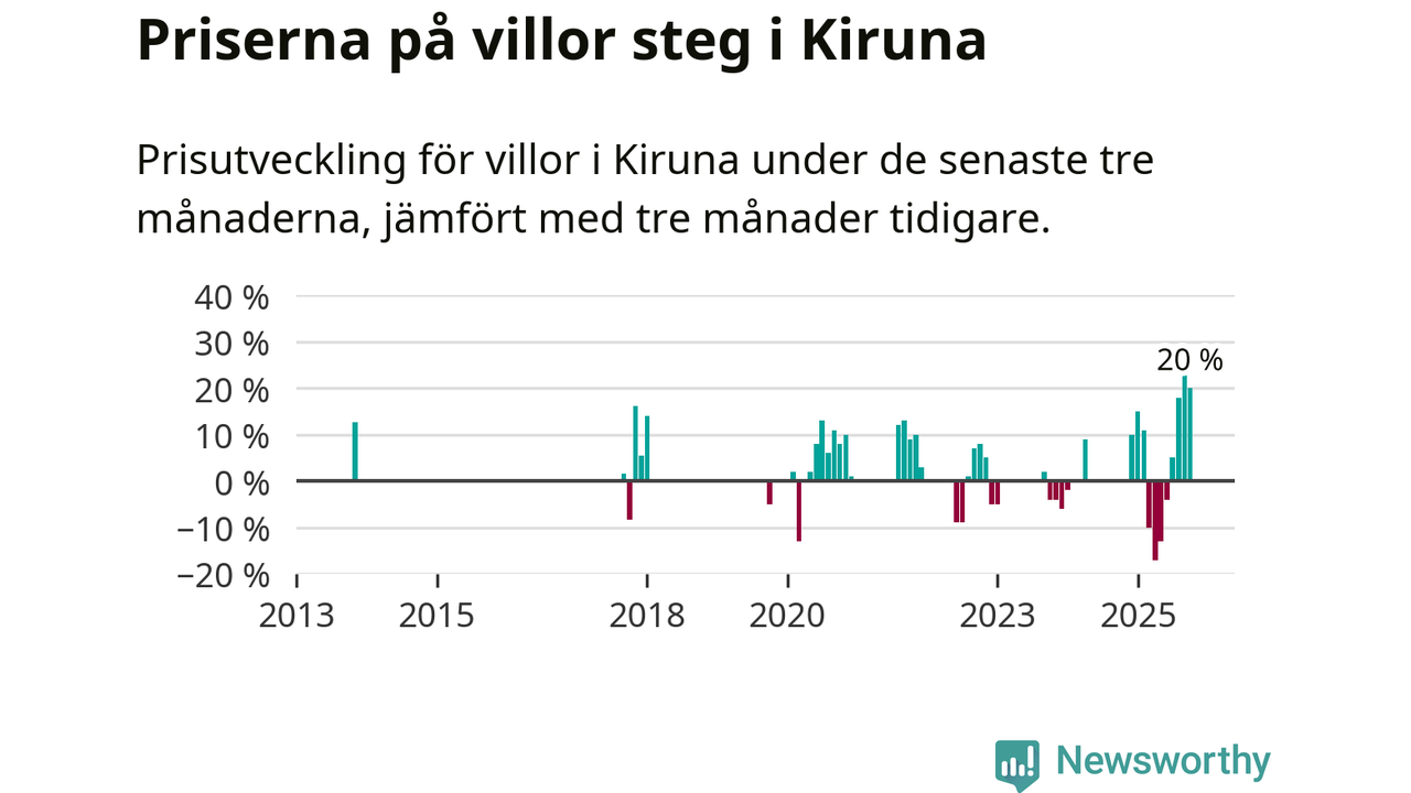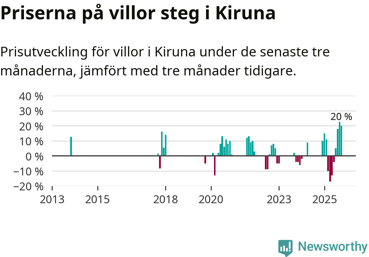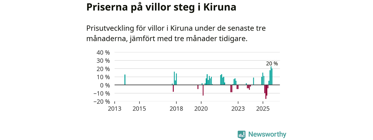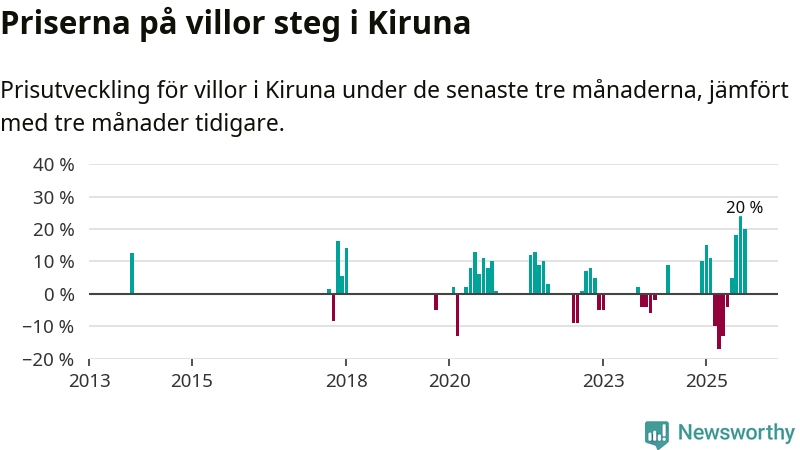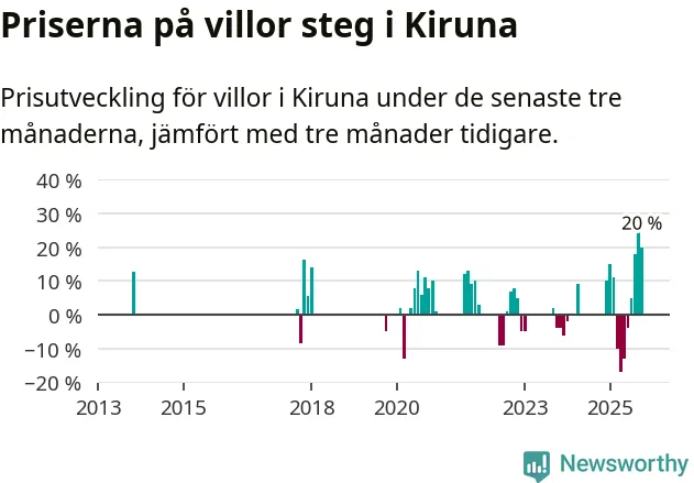 Statistiken visar även på en stor prisuppgång i Kiruna kommun. Medelpriset på försäljningarna av villor i kommunen var 20 procent högre än för tre månader sedan. Även i hela Norrbotten ökar villapriserna. I hela länet noterades en prisuppgång på 1 procent.