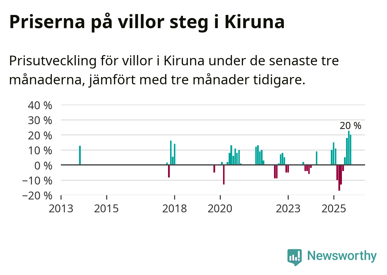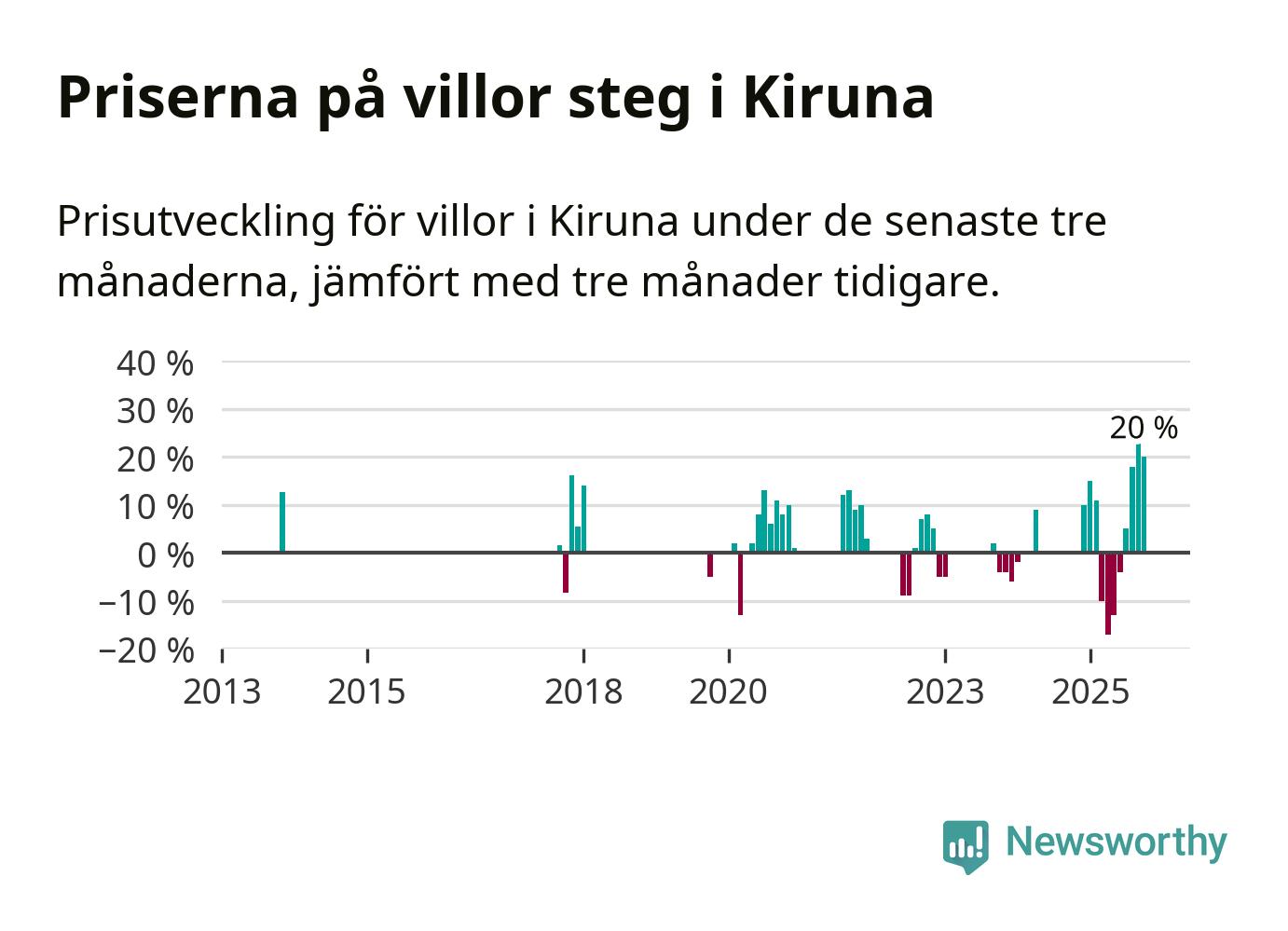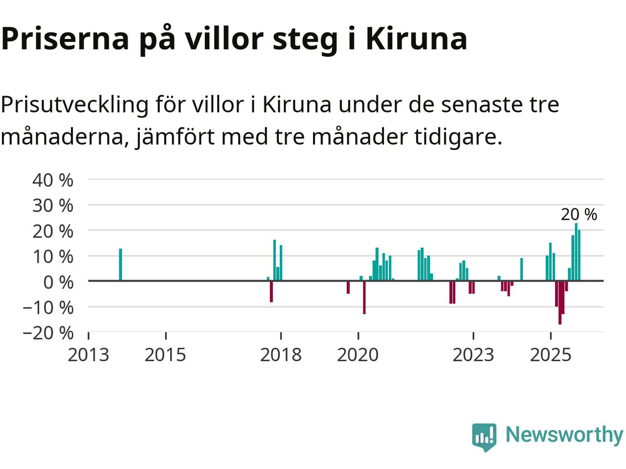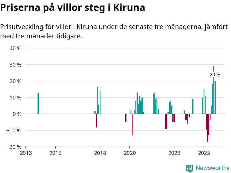 Statistiken visar även på en stor prisuppgång i Kiruna kommun. Medelpriset på försäljningarna av villor i kommunen var 20 procent högre än för tre månader sedan. Även i hela Norrbotten ökar villapriserna. I hela länet noterades en prisuppgång på 1 procent.