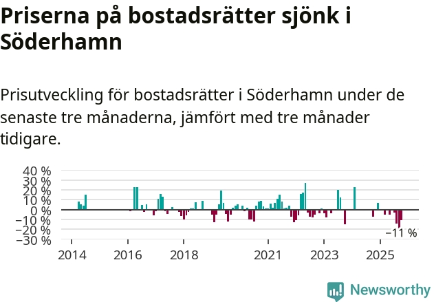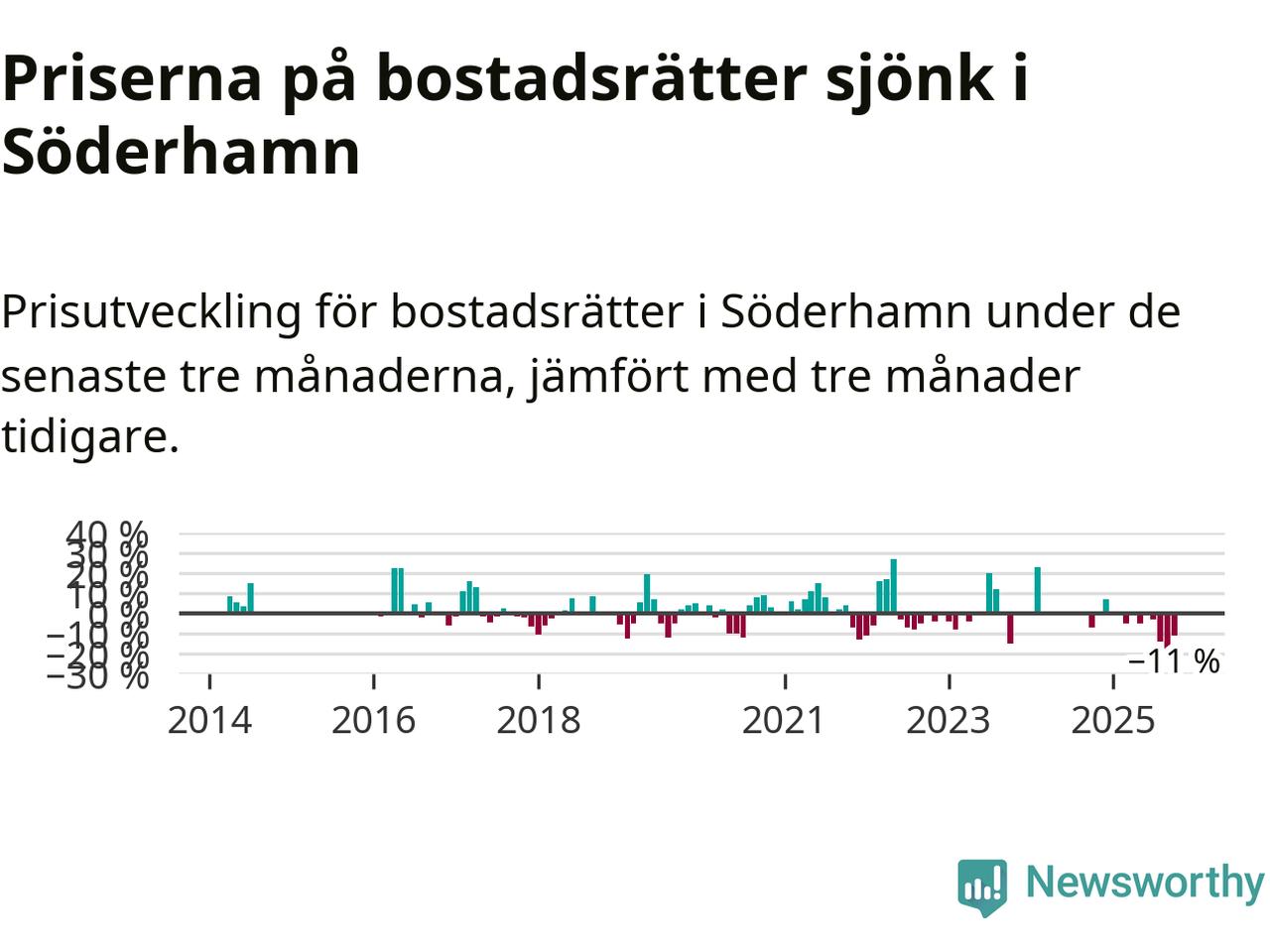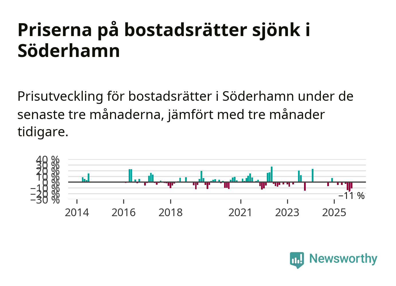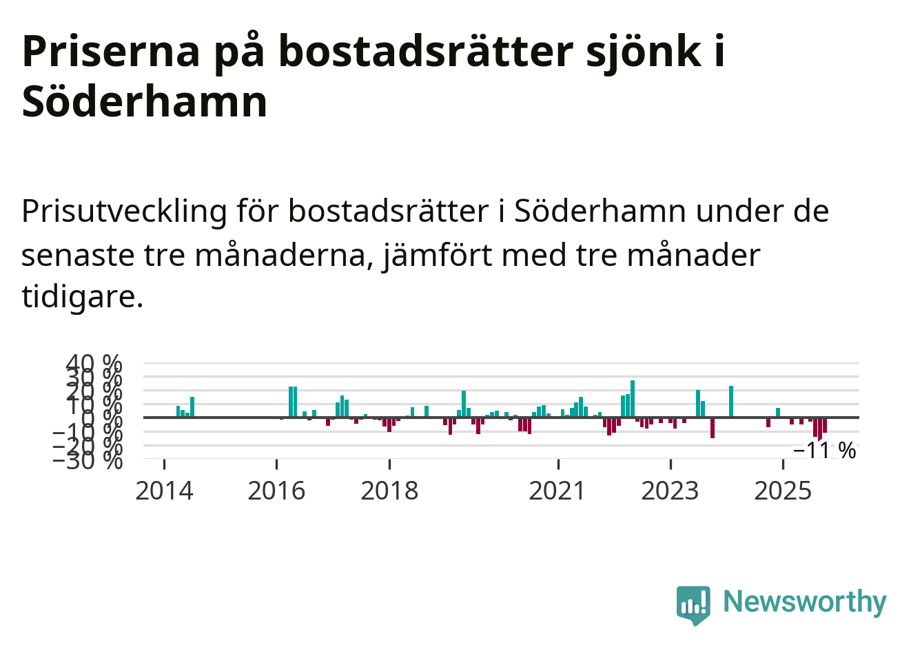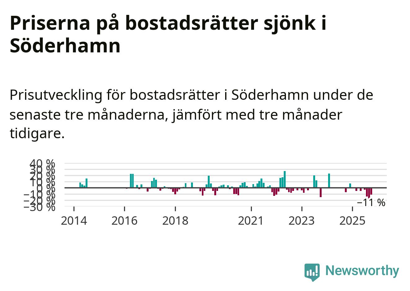 Priserna på bostadsrätter har gått ner i Söderhamns kommun. Medelpriset på försäljningarna under de senaste tre månaderna visar på en nedgång med 11 procent.