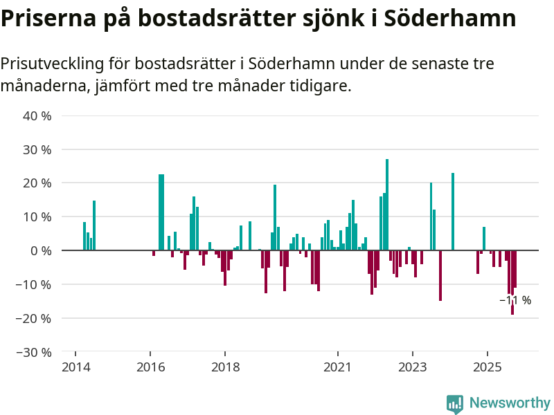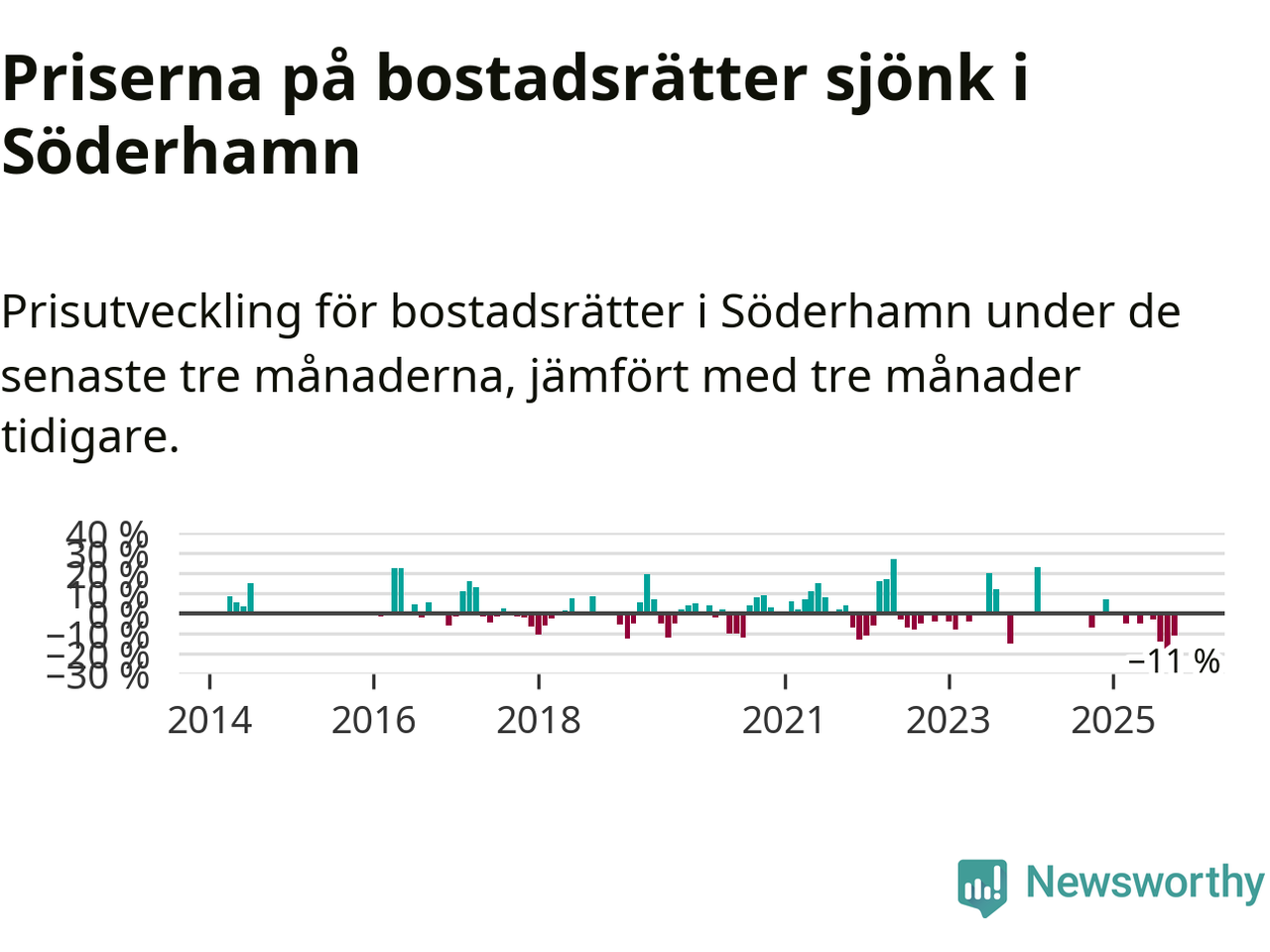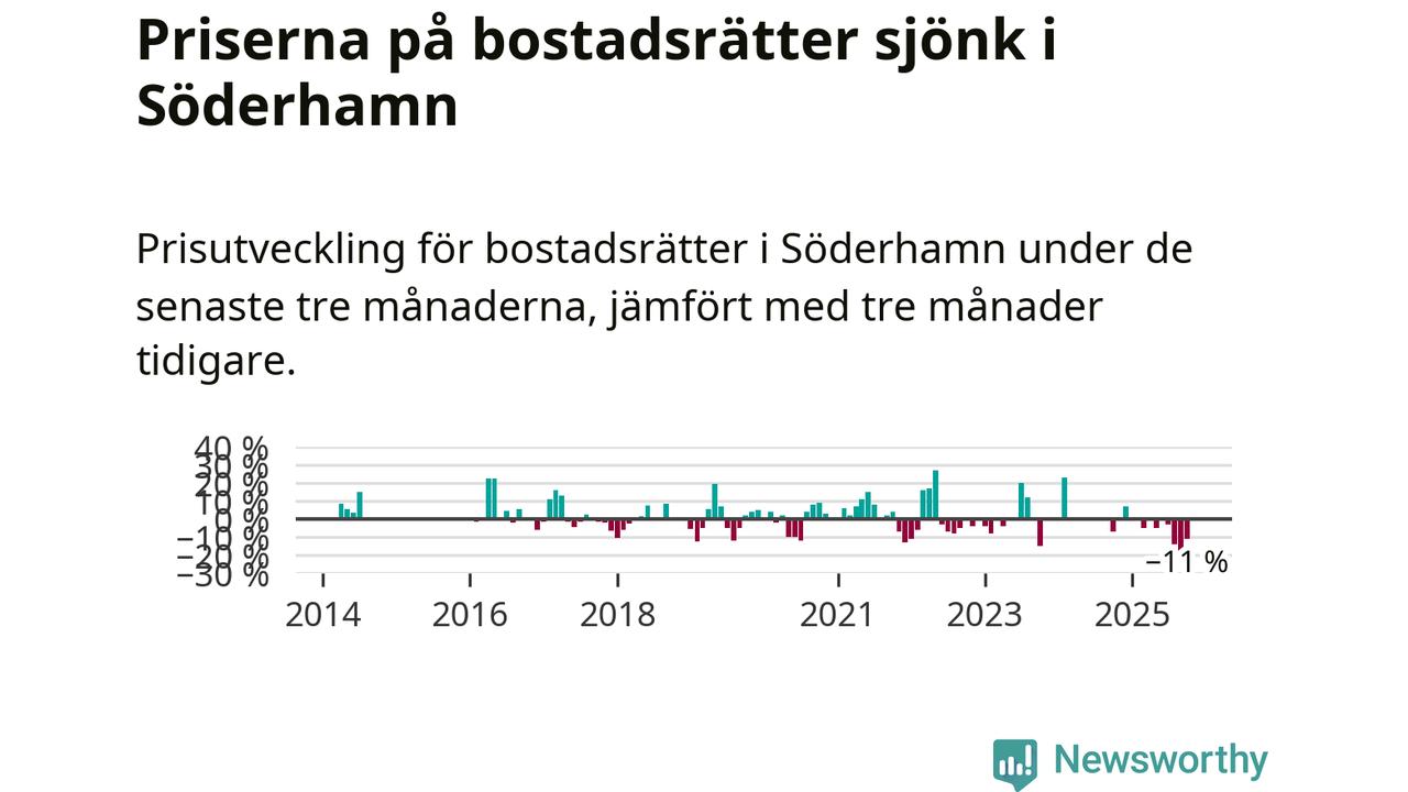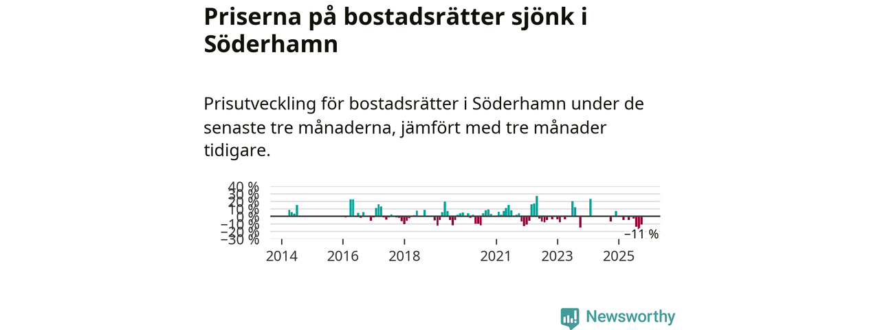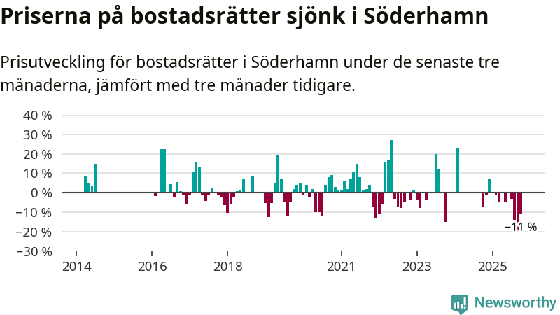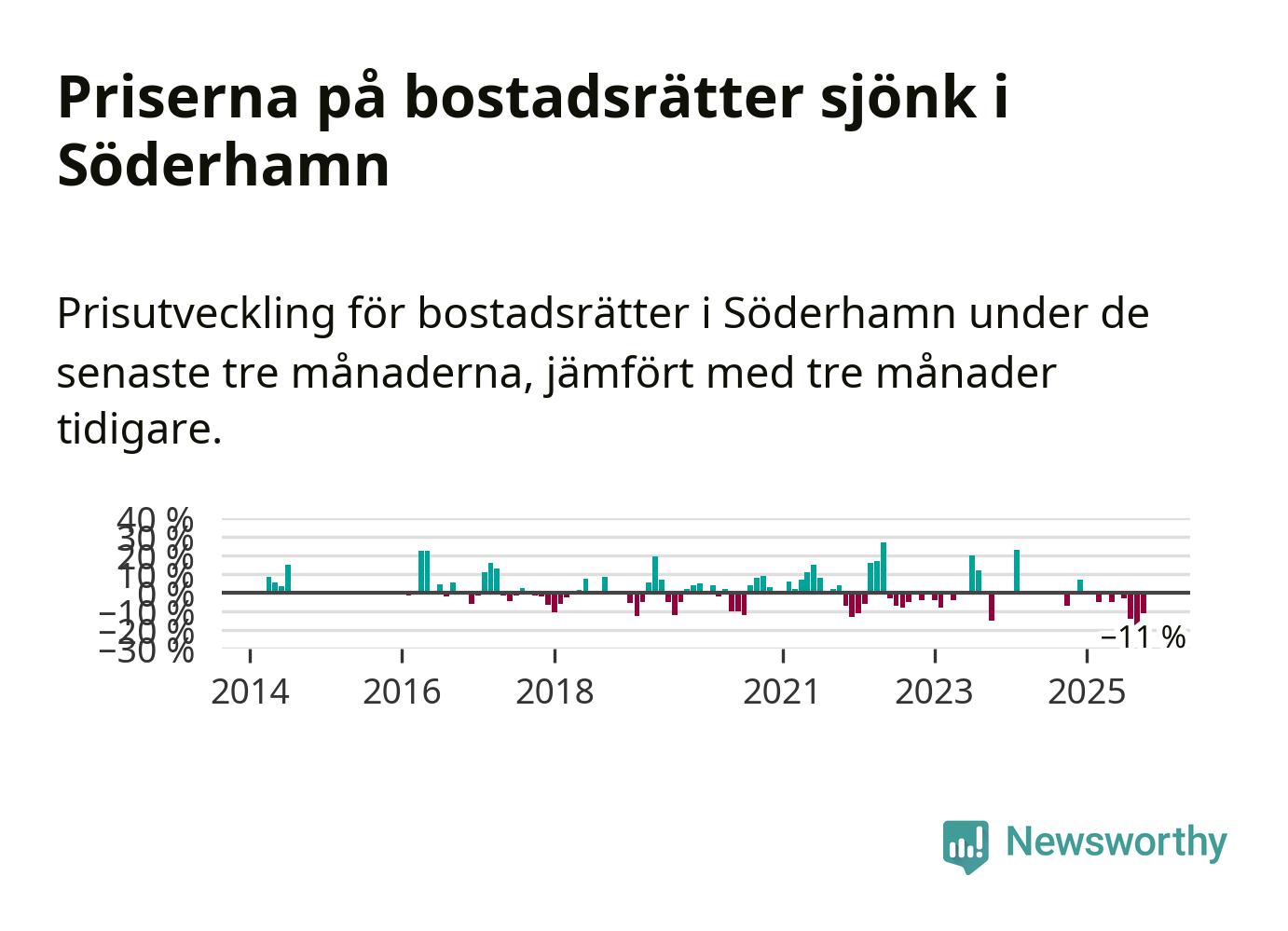 Priserna på bostadsrätter har gått ner i Söderhamns kommun. Medelpriset på försäljningarna under de senaste tre månaderna visar på en nedgång med 11 procent.