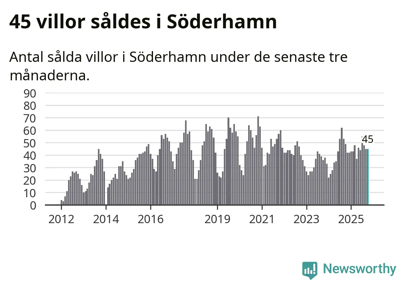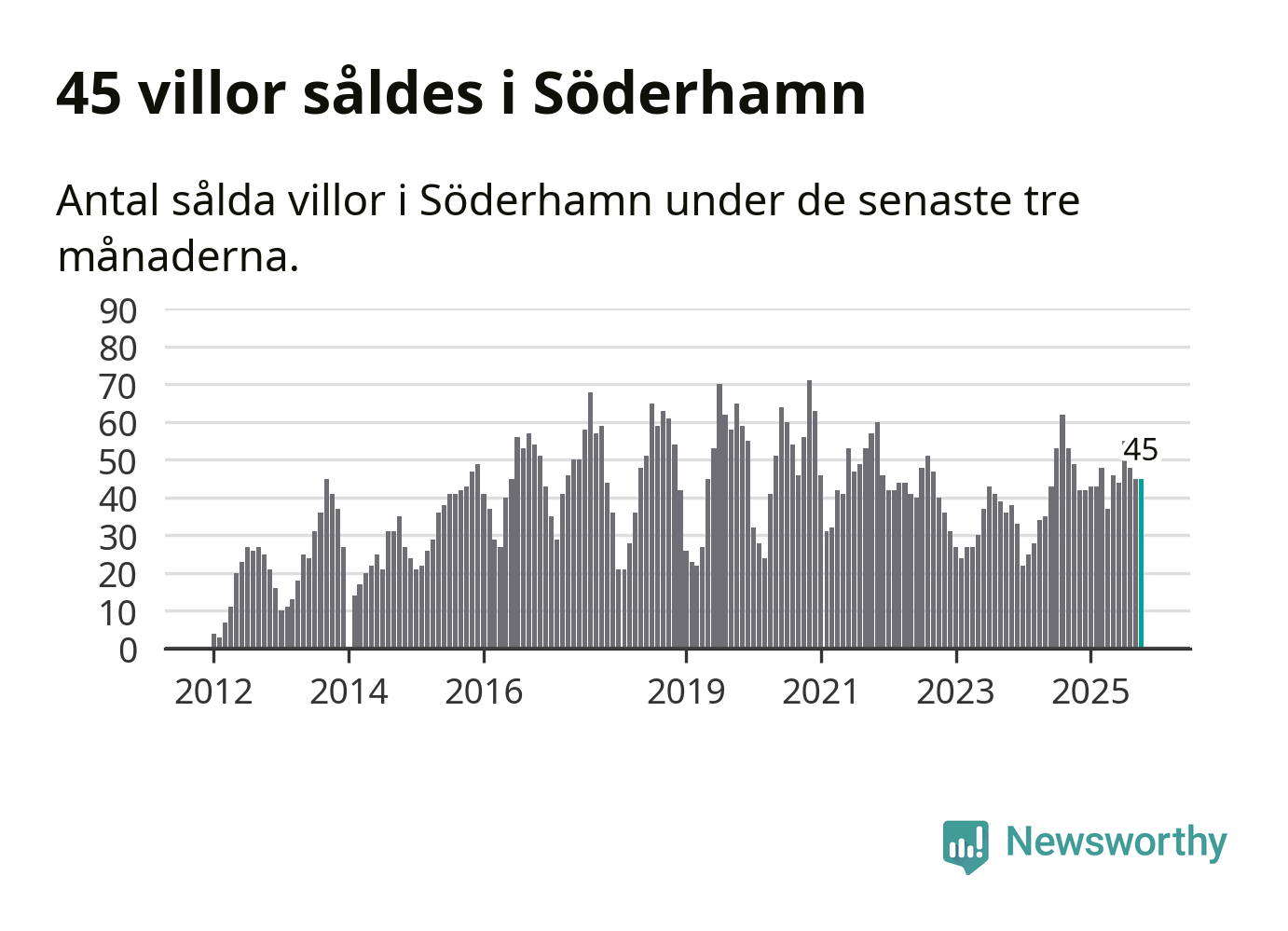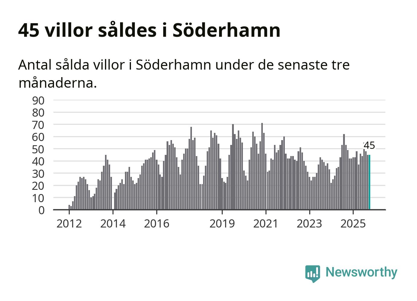 Mellan augusti och oktober såldes 45 villor i Söderhamns kommun. Det är relativt få sett till aktiviteten på bostadsmarknaden i kommunen under de senaste tolv månaderna, samt det historiska snittet för den här tiden på året.