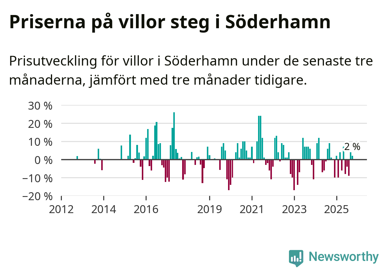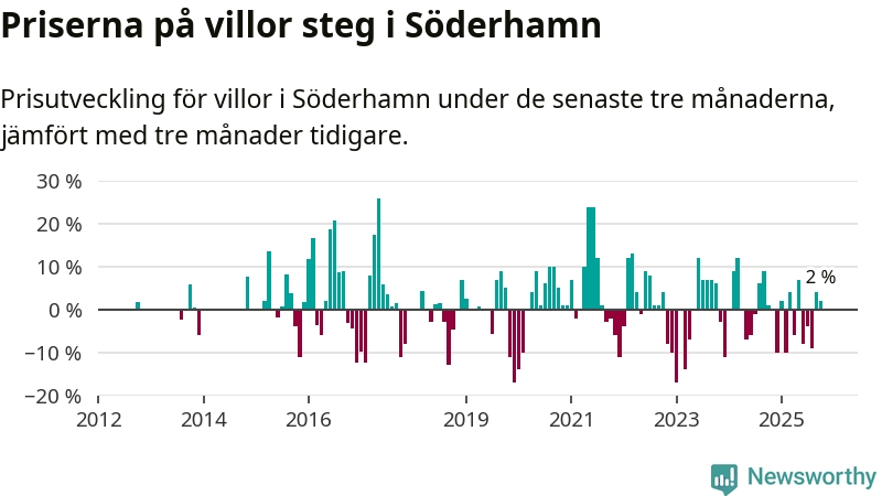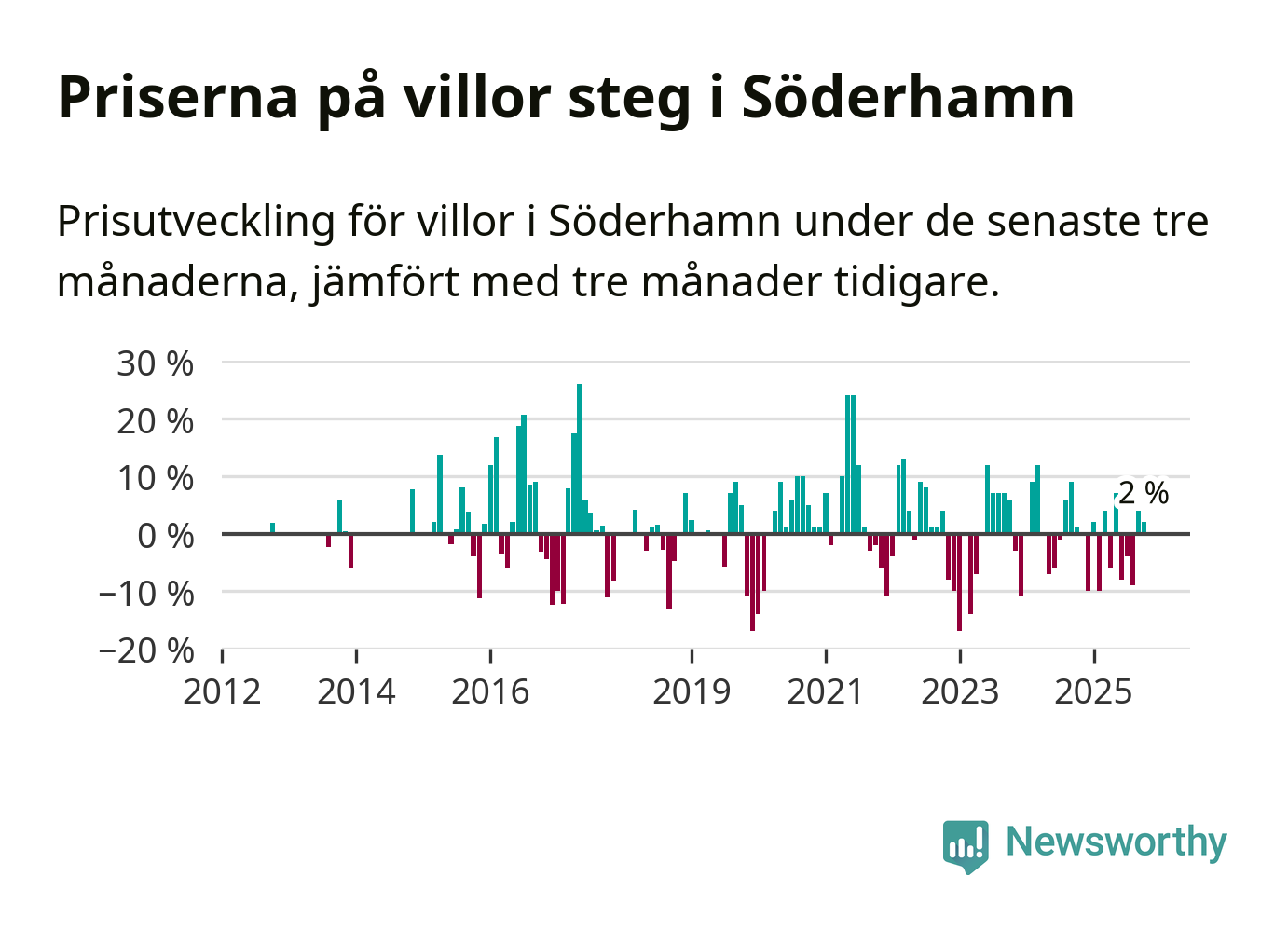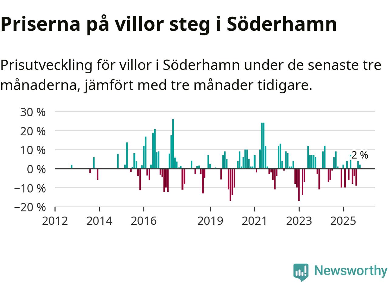 Statistiken visar även på en prisuppgång i Söderhamns kommun. Medelpriset på försäljningarna av villor i kommunen var 2 procent högre än för tre månader sedan. I hela Gävleborg däremot ligger villapriserna stilla.
