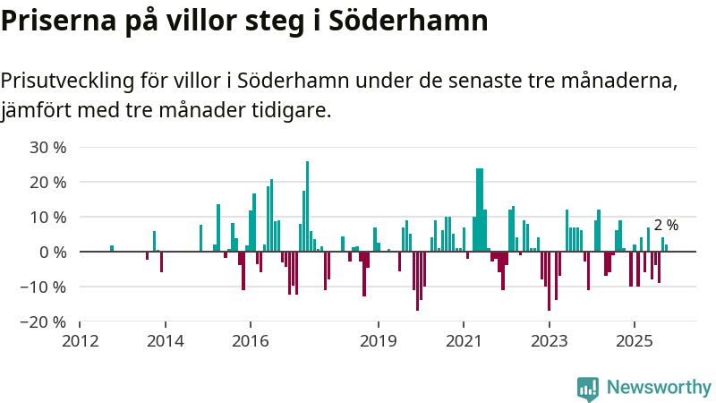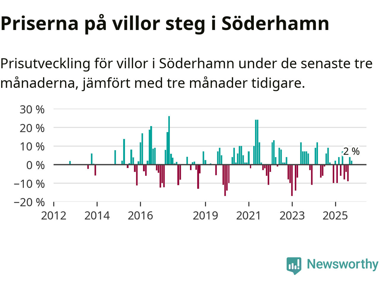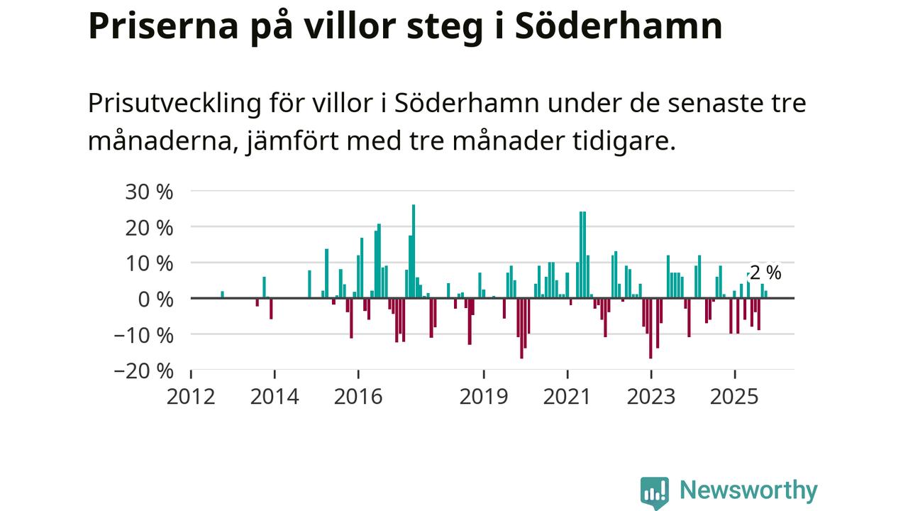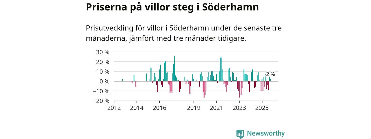 Statistiken visar även på en prisuppgång i Söderhamns kommun. Medelpriset på försäljningarna av villor i kommunen var 2 procent högre än för tre månader sedan. I hela Gävleborg däremot ligger villapriserna stilla.