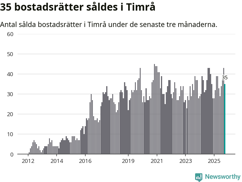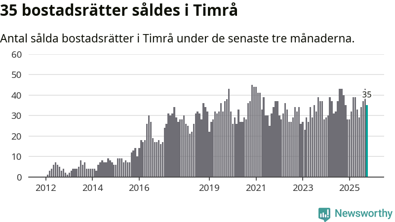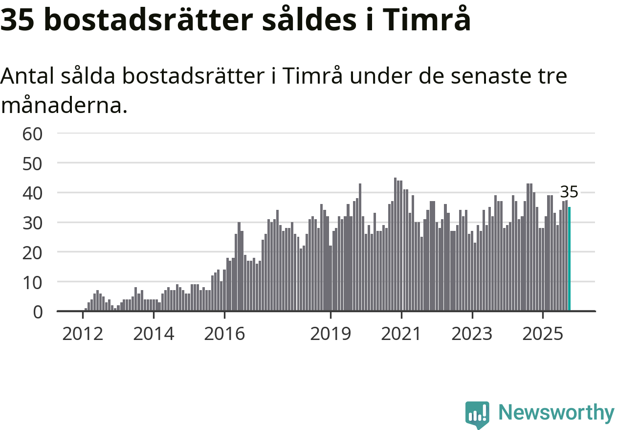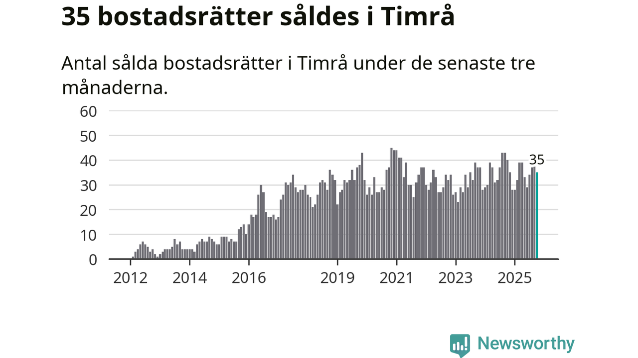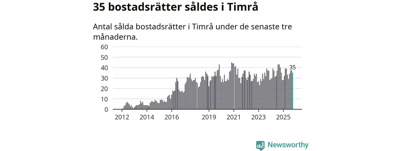 Sammanlagt såldes 35 bostadsrätter i Timrå kommun mellan augusti och oktober till ett genomsnittligt pris på 0,6 miljoner kronor. I fjol gjordes 40 affärer vid den här tiden på året.