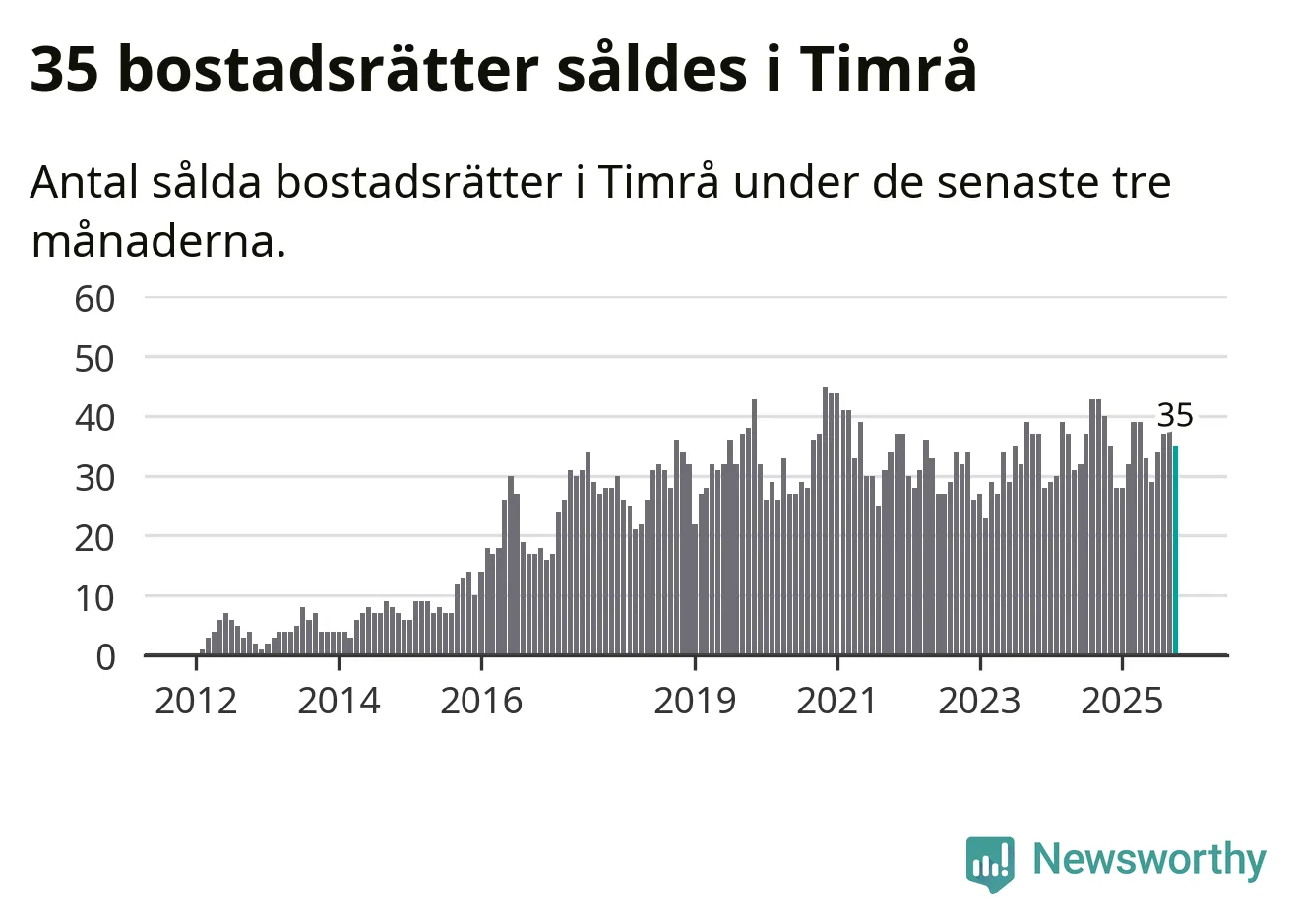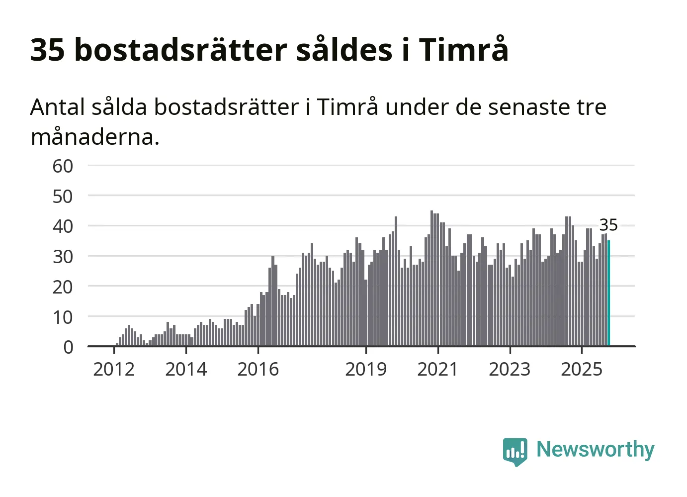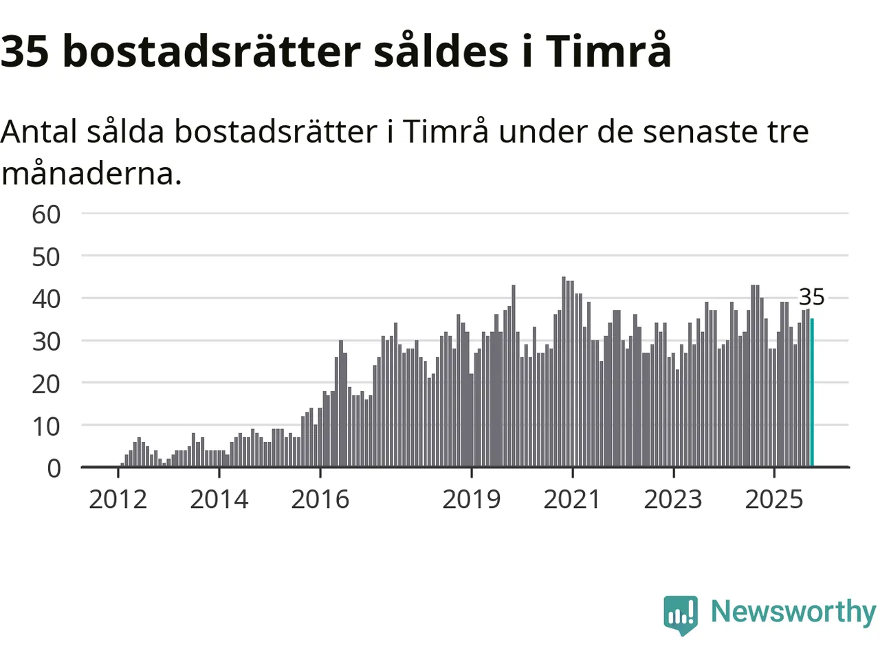 Sammanlagt såldes 35 bostadsrätter i Timrå kommun mellan augusti och oktober till ett genomsnittligt pris på 0,6 miljoner kronor. I fjol gjordes 40 affärer vid den här tiden på året.