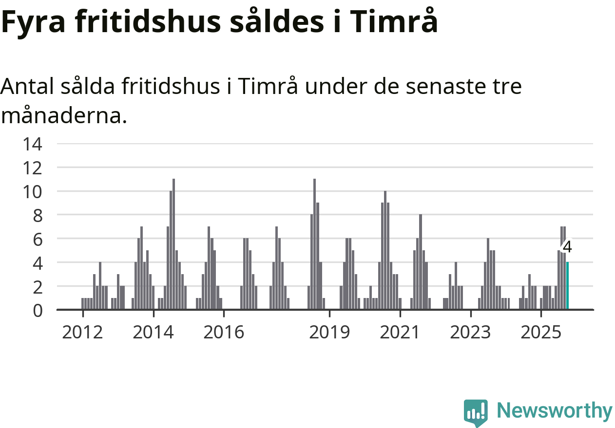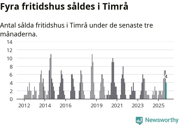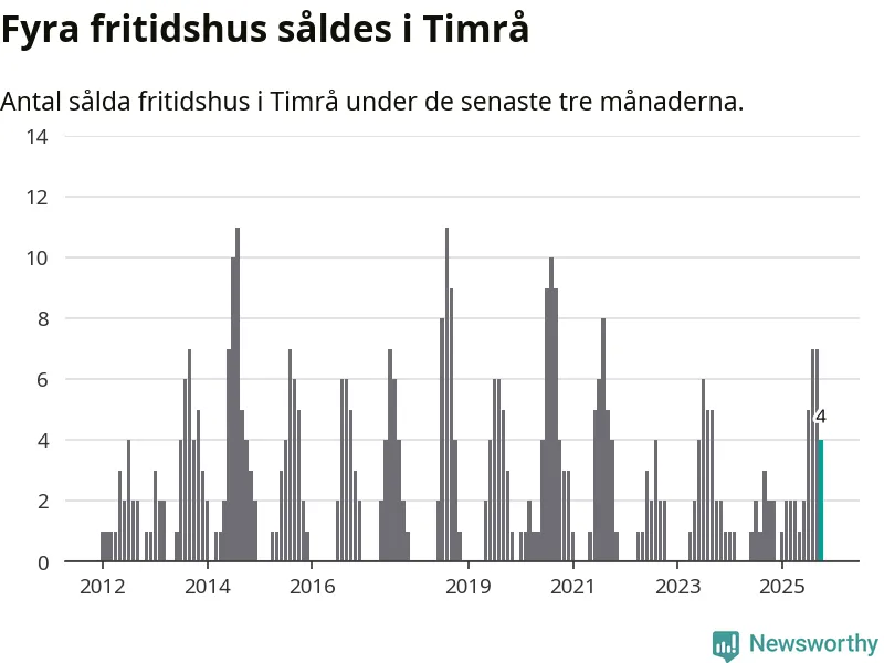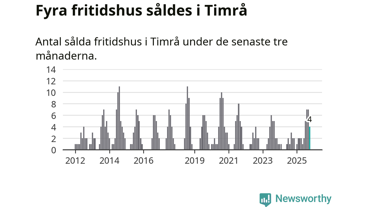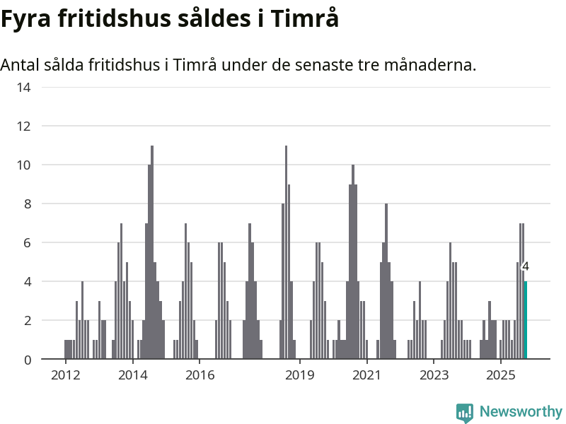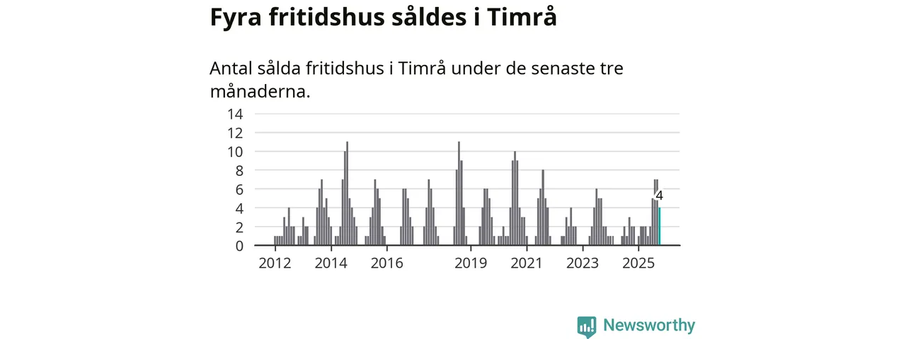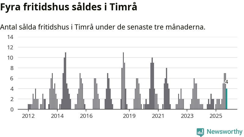 Mellan augusti och oktober gjordes sammanlagt fyra affärer med fritidshus i Timrå kommun. Det kan jämföras med två vid motsvarande tid i fjol.