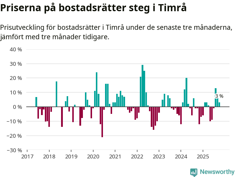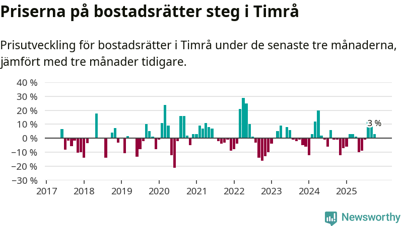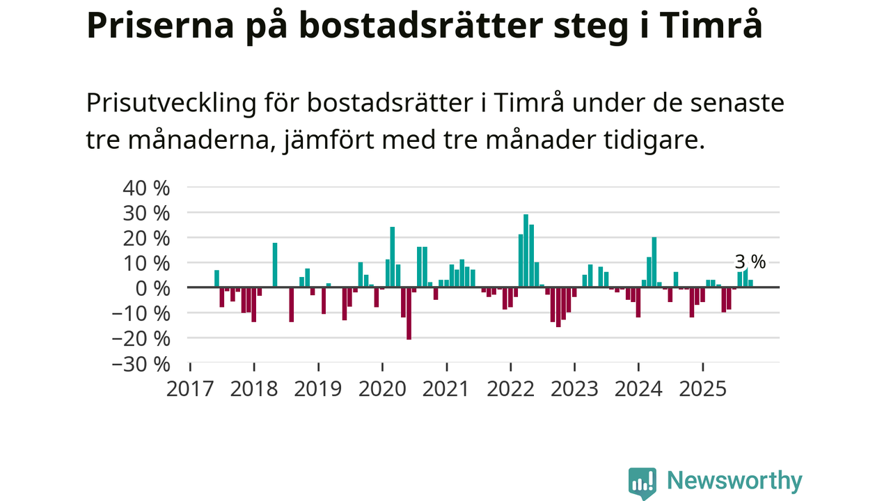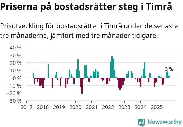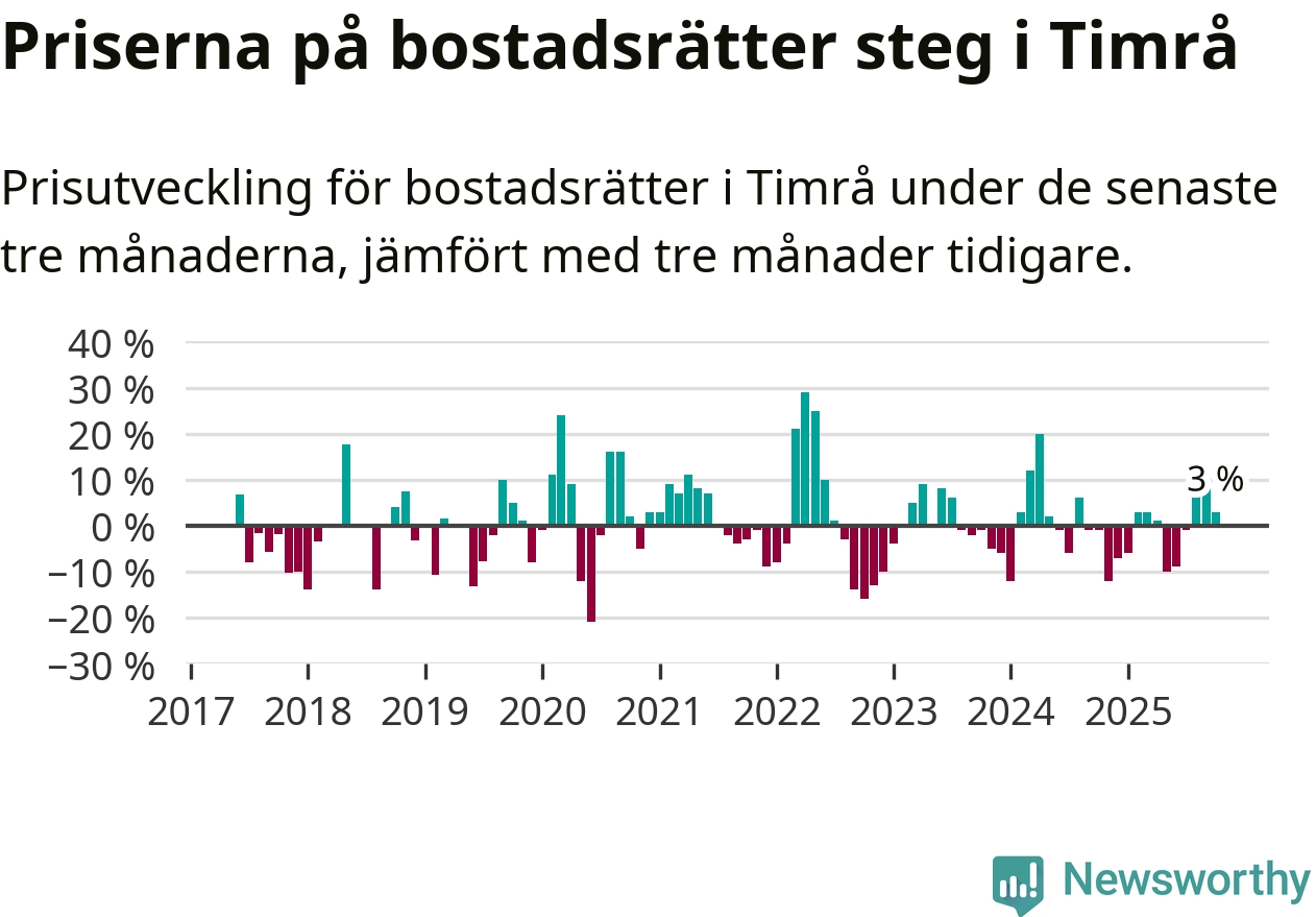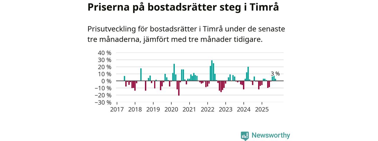 Priserna på bostadsrätter har gått upp i Timrå kommun. Medelpriset på försäljningarna under de senaste tre månaderna visar på en uppgång med 3 procent.