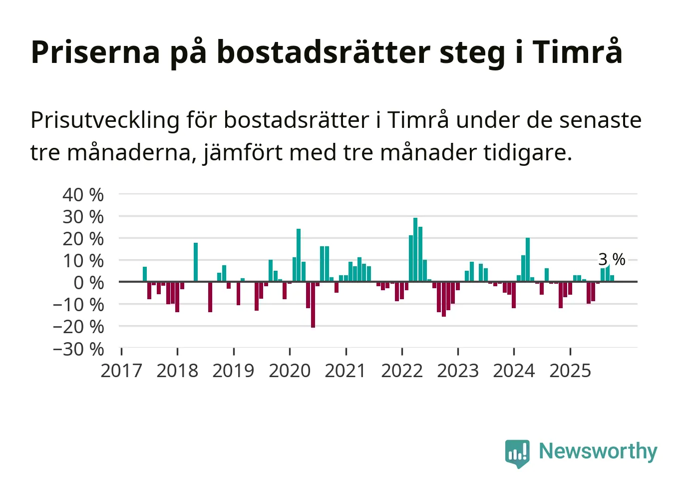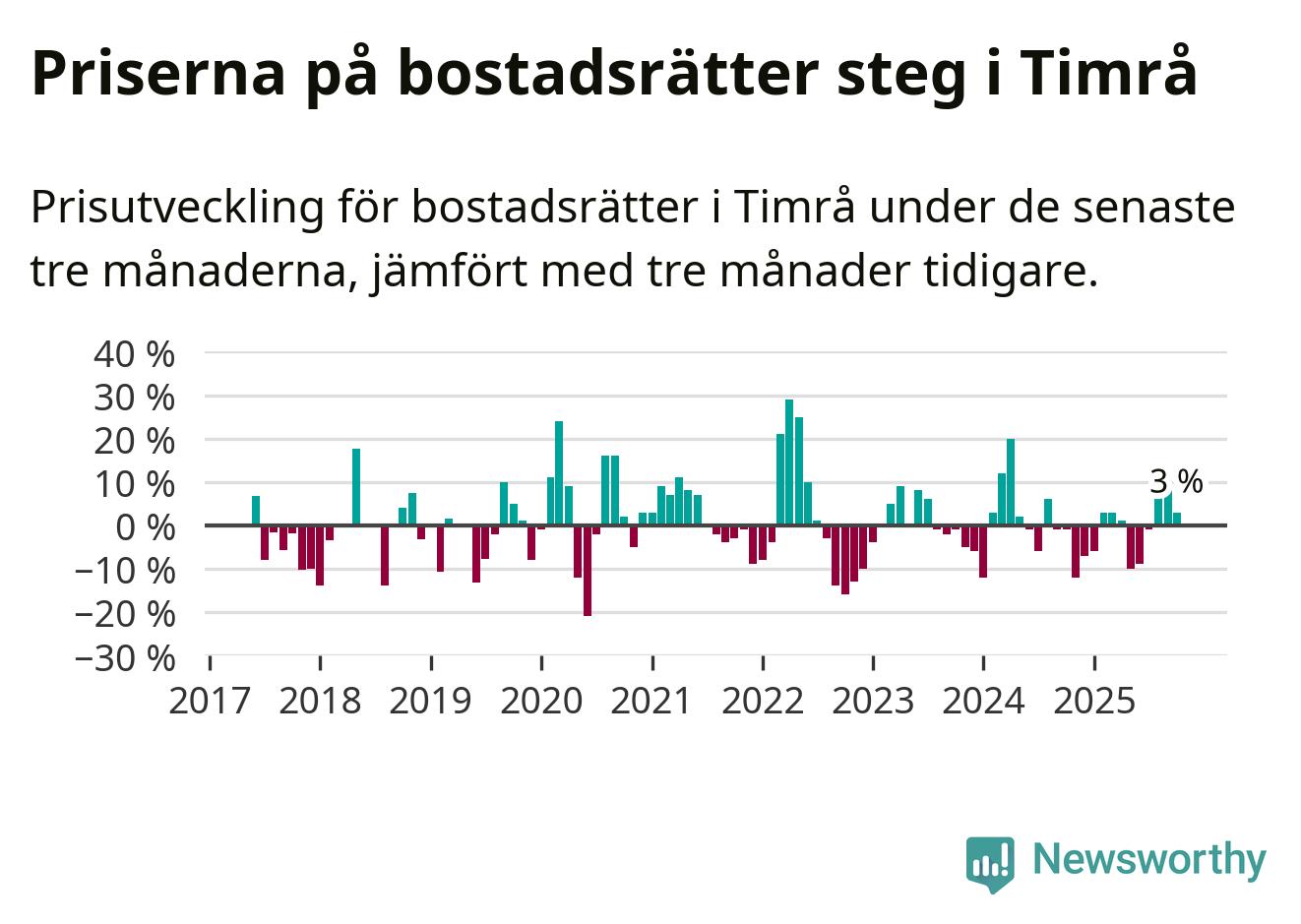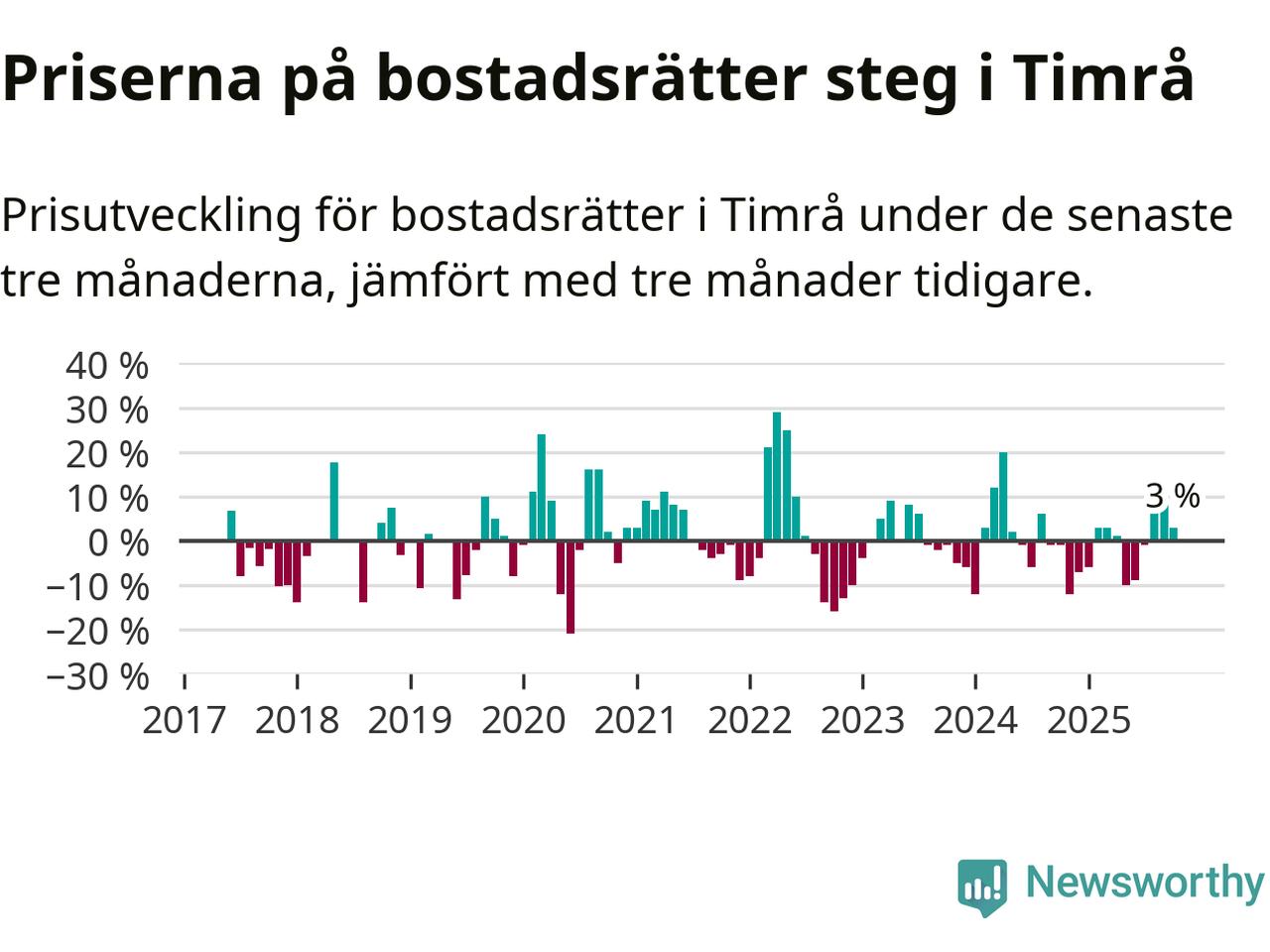Priserna på bostadsrätter har gått upp i Timrå kommun. Medelpriset på försäljningarna under de senaste tre månaderna visar på en uppgång med 3 procent.