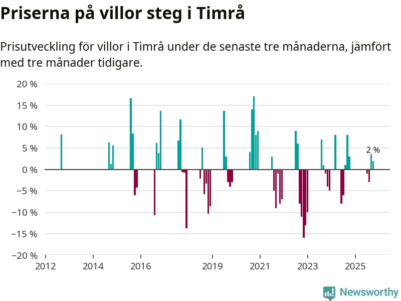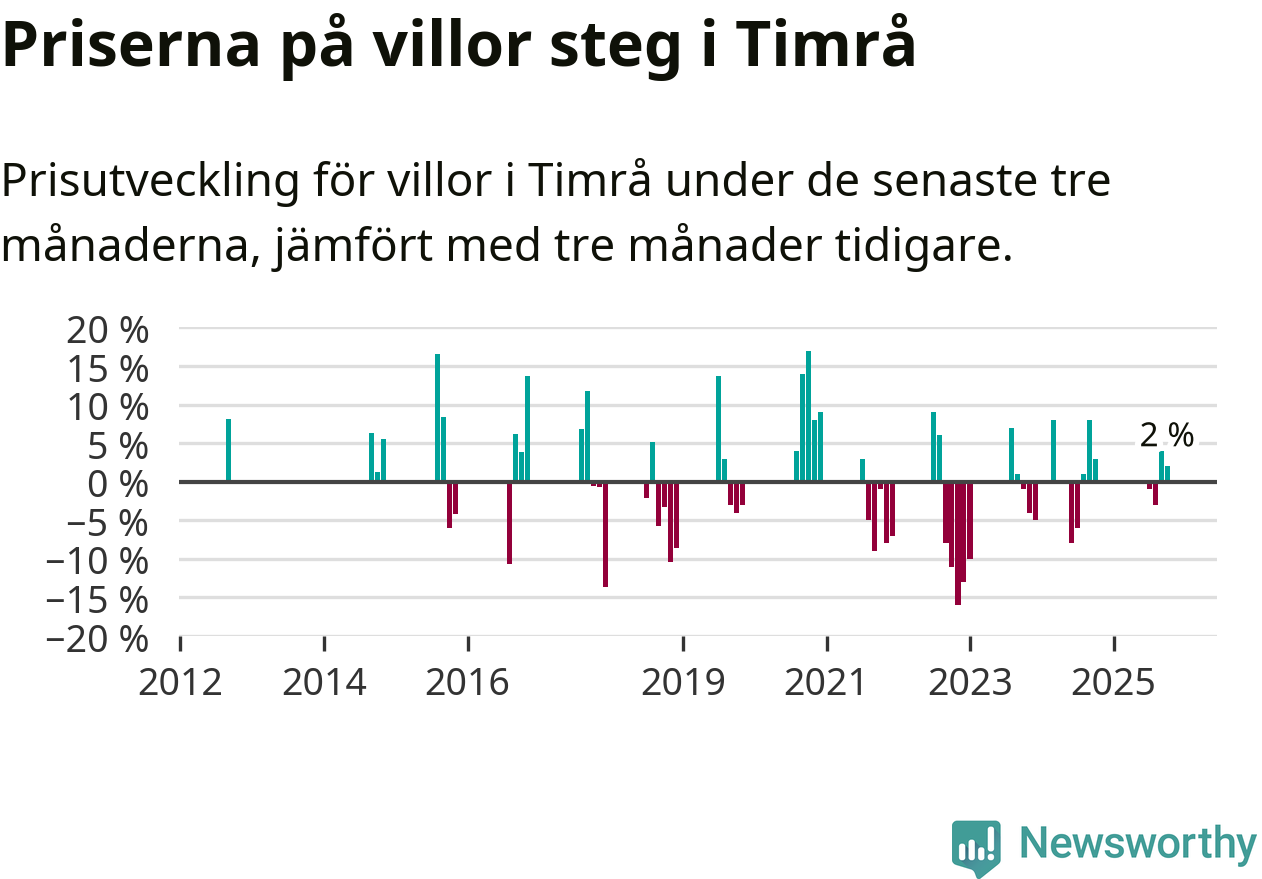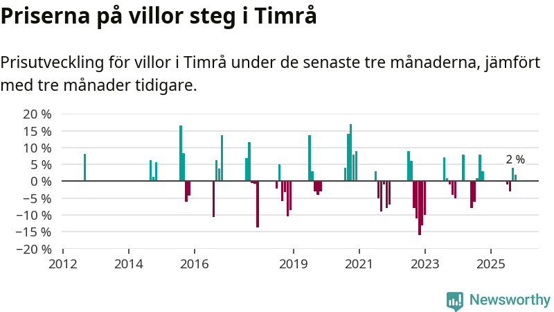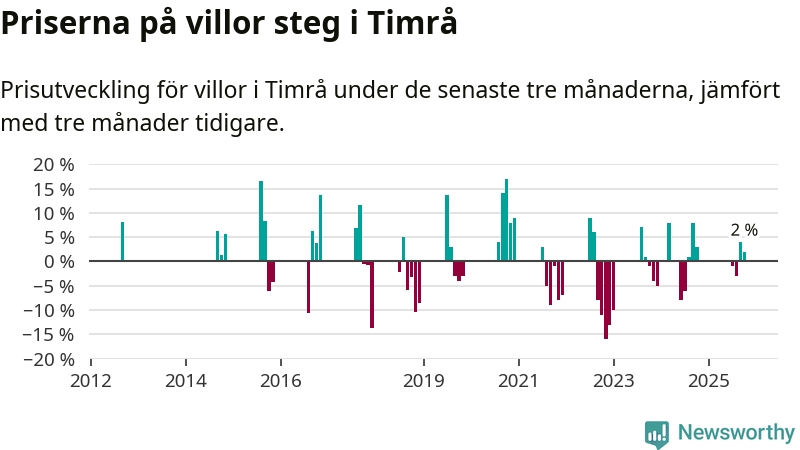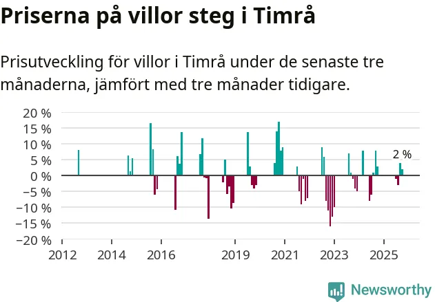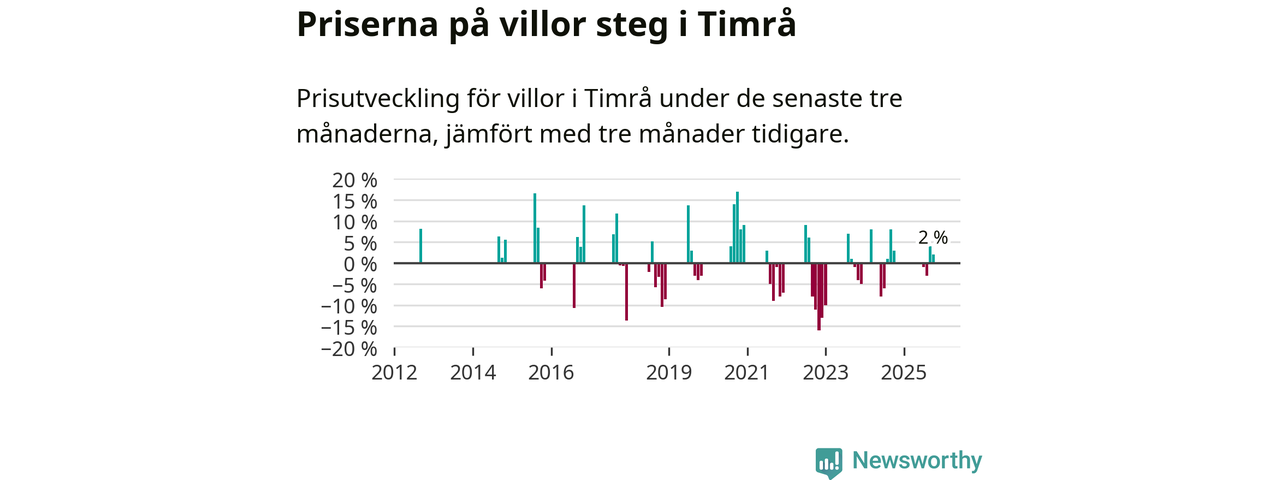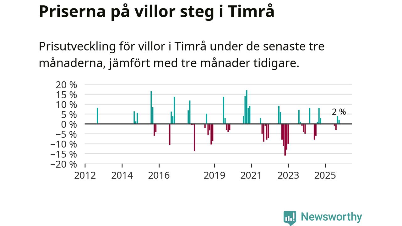 Statistiken visar även på en prisuppgång i Timrå kommun. Medelpriset på försäljningarna av villor i kommunen var 2 procent högre än för tre månader sedan. I hela Västernorrland däremot sjunker villapriserna. I hela länet noterades en prisnedgång på 1 procent.