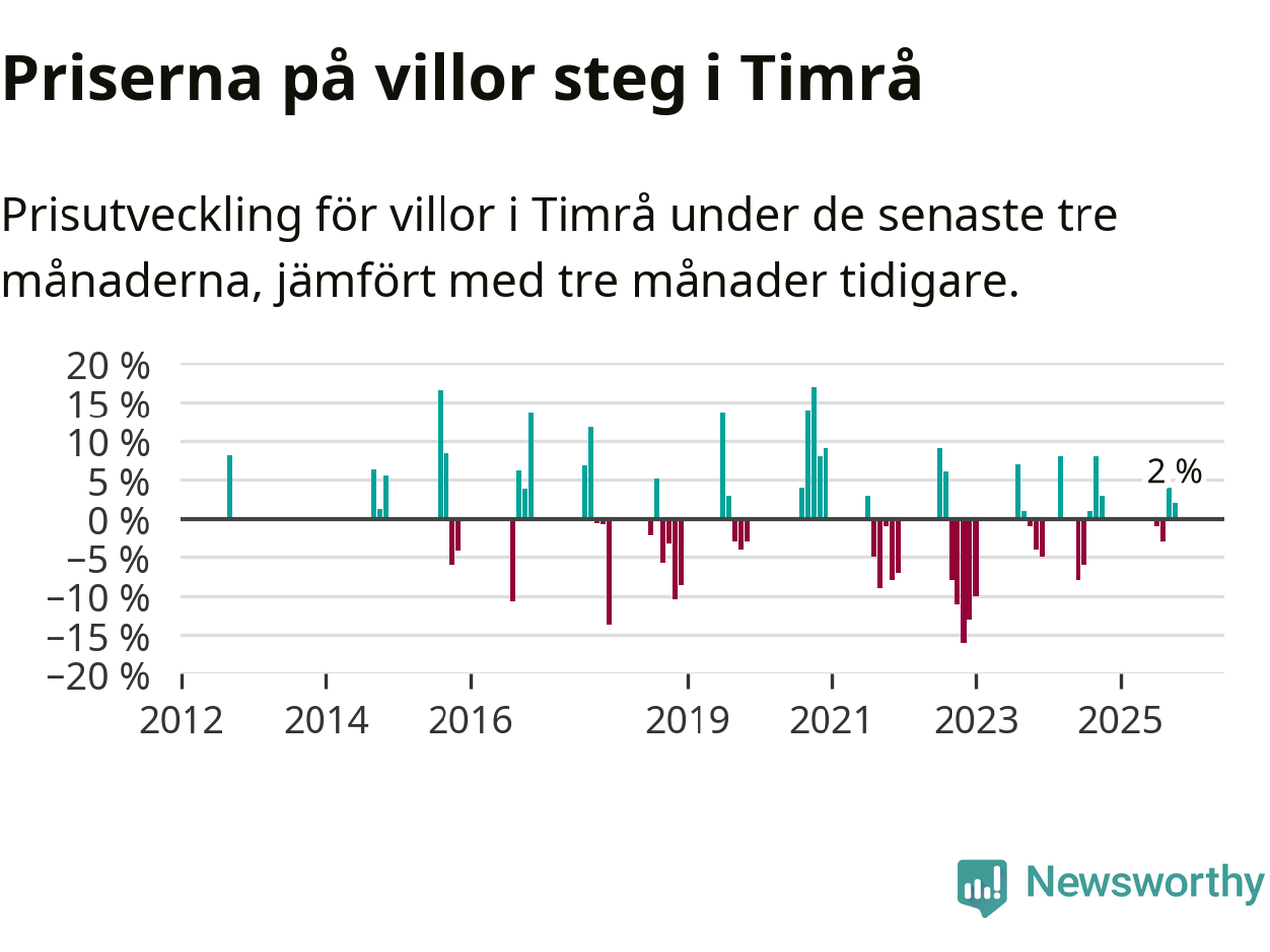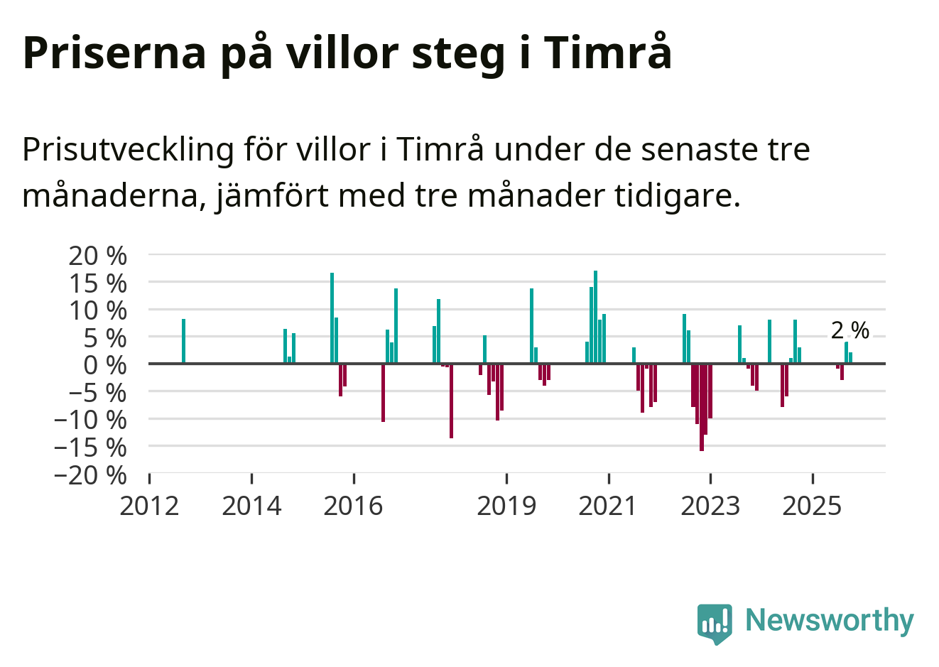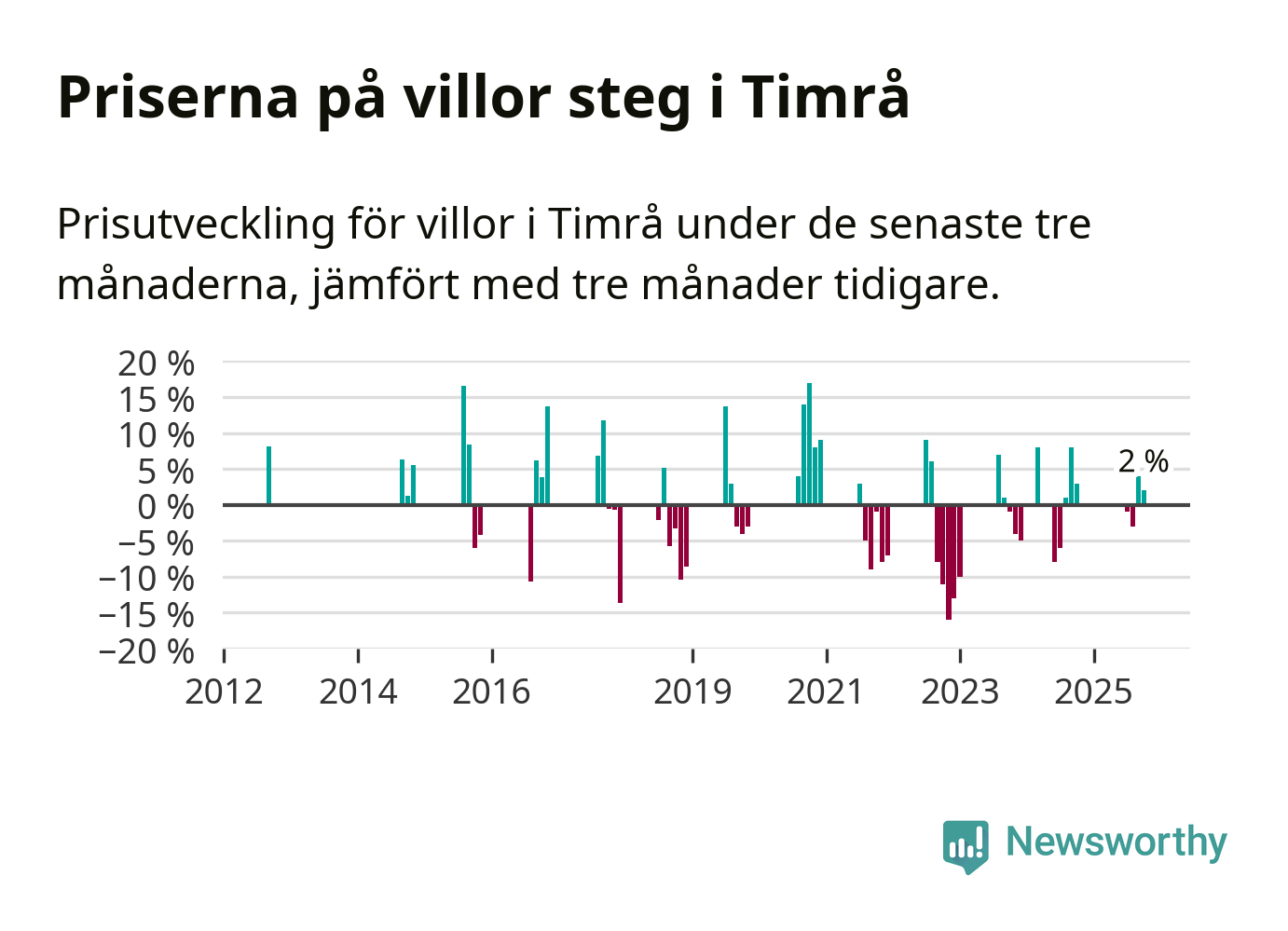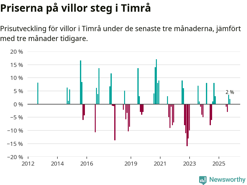 Statistiken visar även på en prisuppgång i Timrå kommun. Medelpriset på försäljningarna av villor i kommunen var 2 procent högre än för tre månader sedan. I hela Västernorrland däremot sjunker villapriserna. I hela länet noterades en prisnedgång på 1 procent.