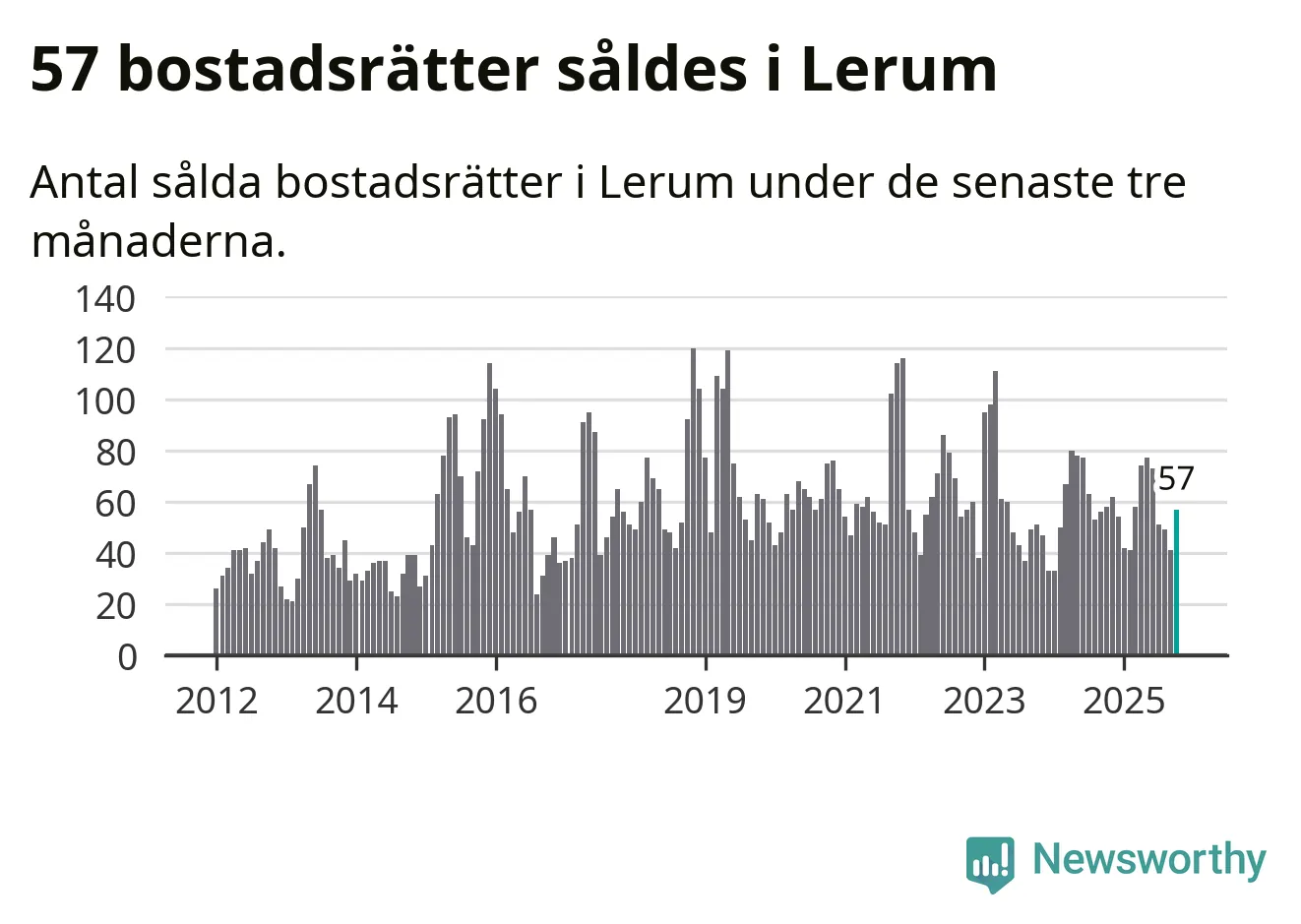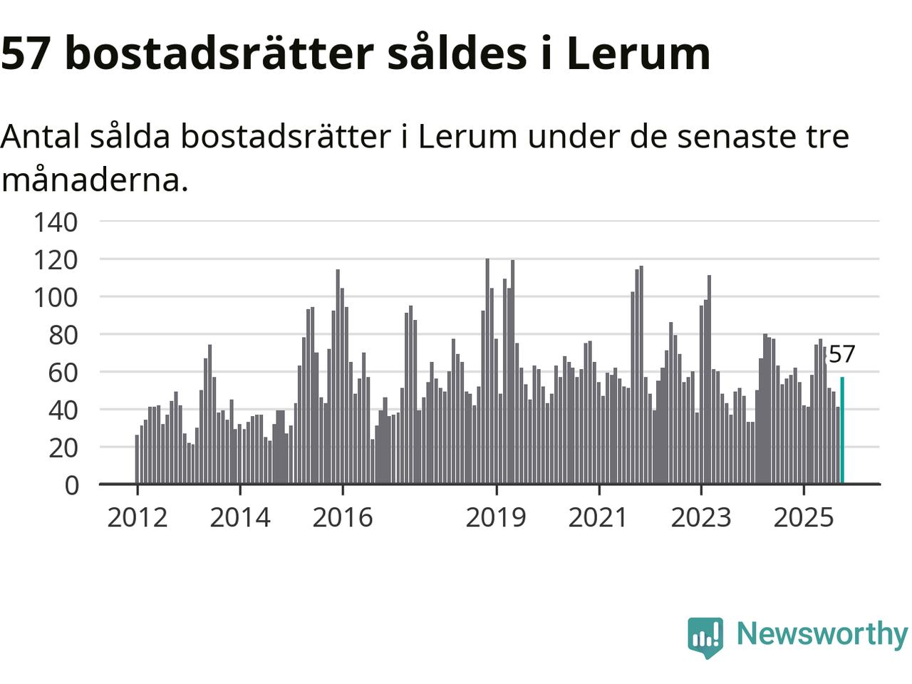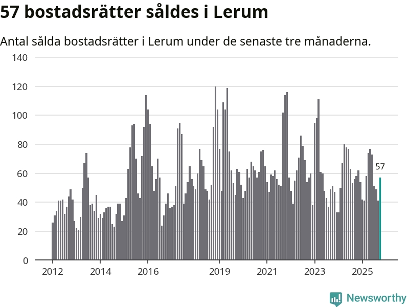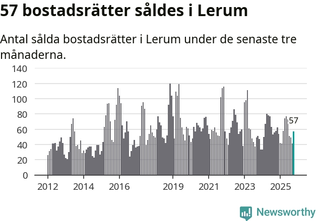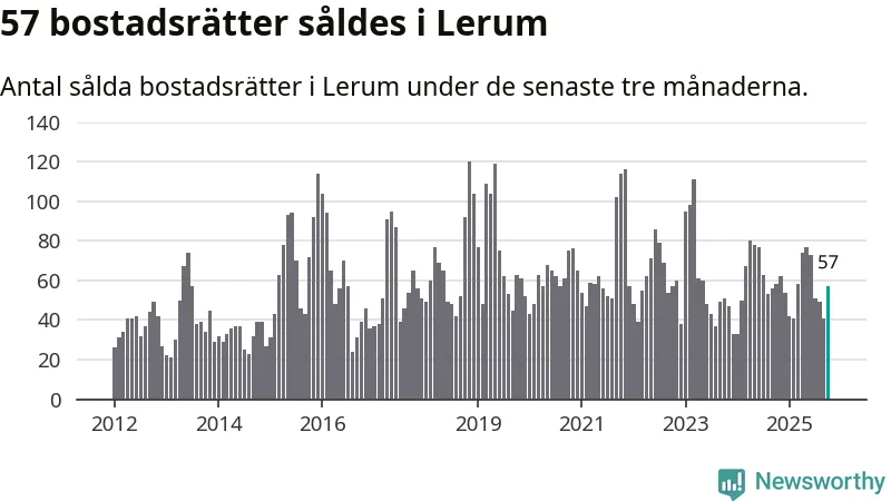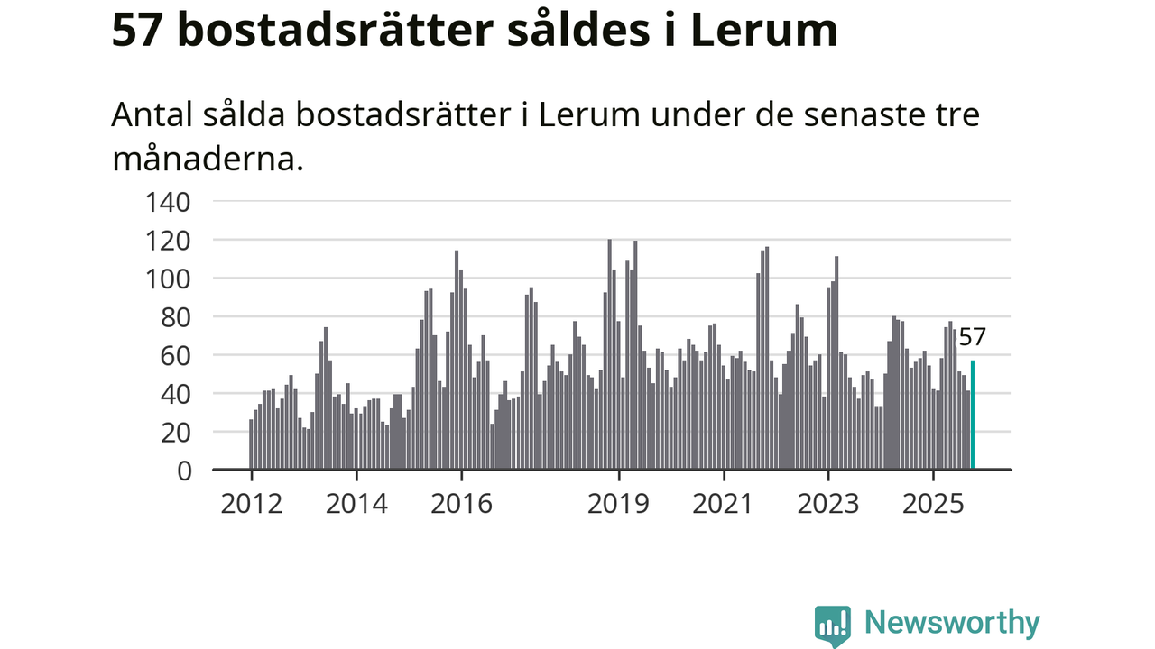 Sammanlagt såldes 57 bostadsrätter i Lerums kommun mellan augusti och oktober till ett genomsnittligt pris på 2,2 miljoner kronor. I fjol gjordes 58 affärer vid den här tiden på året.