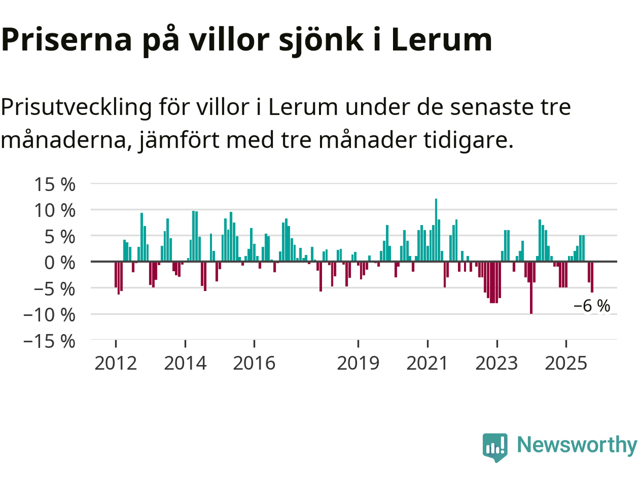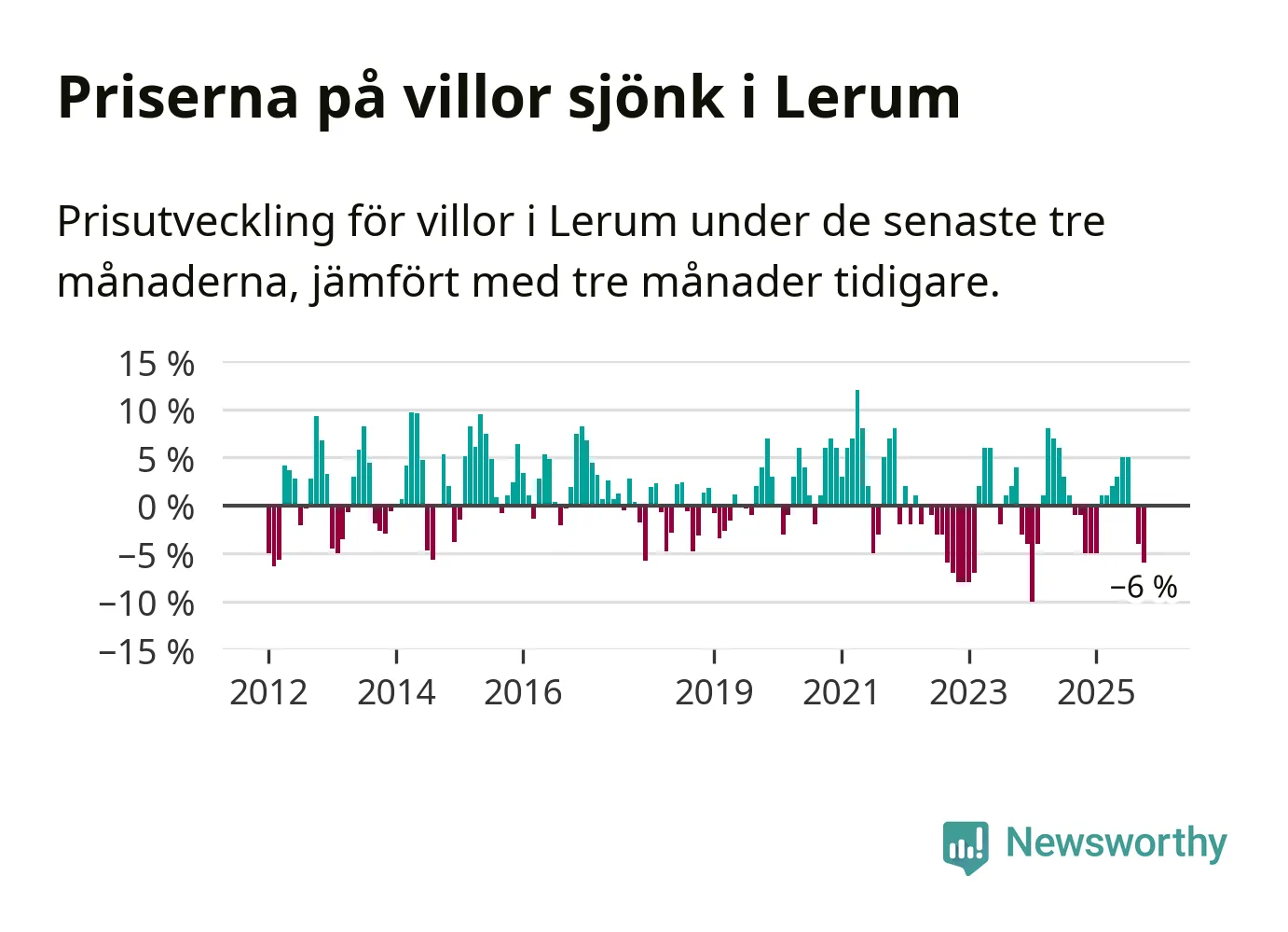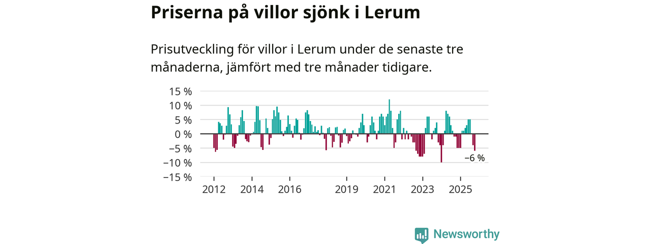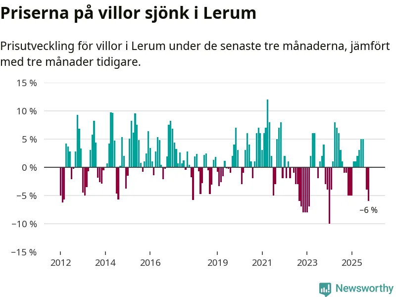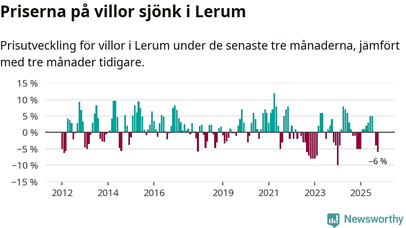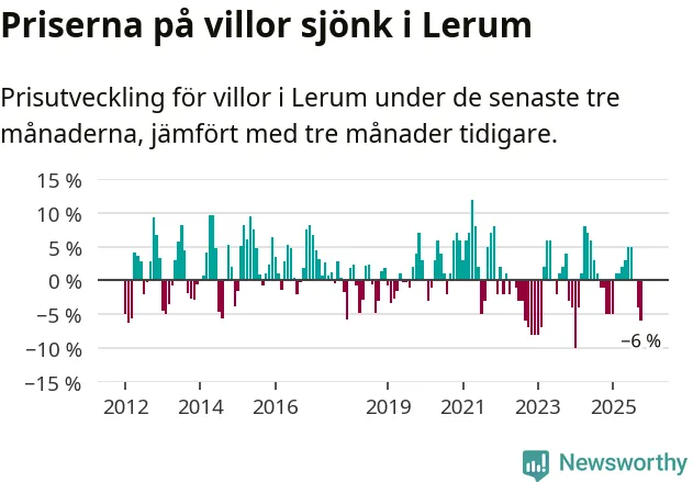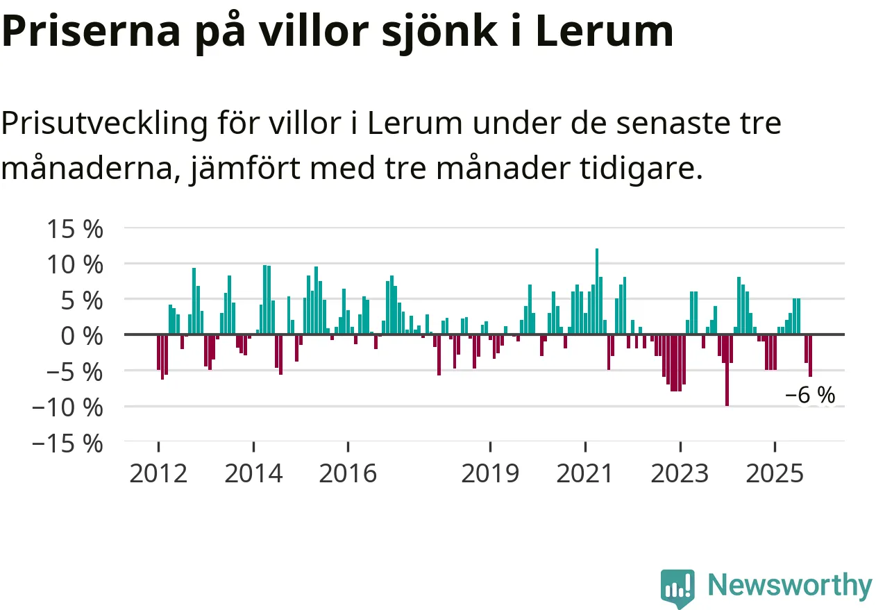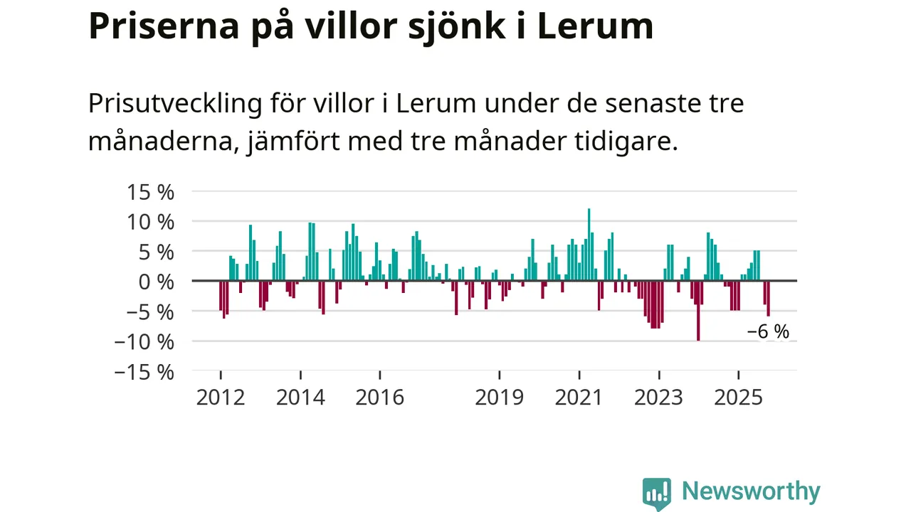 Villapriserna har gått ner i Lerums kommun. Medelpriset på försäljningarna under de senaste tre månaderna visar på en nedgång med 6 procent.