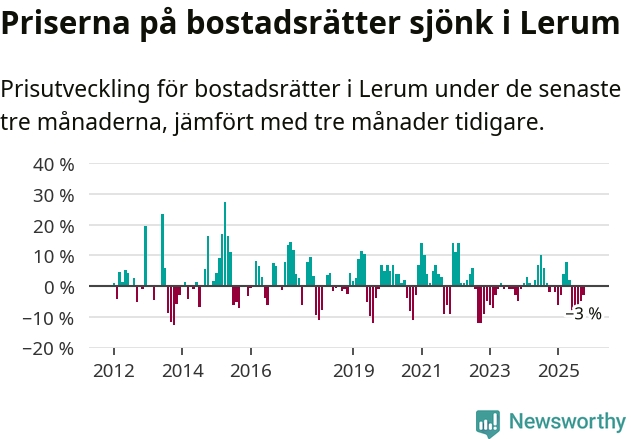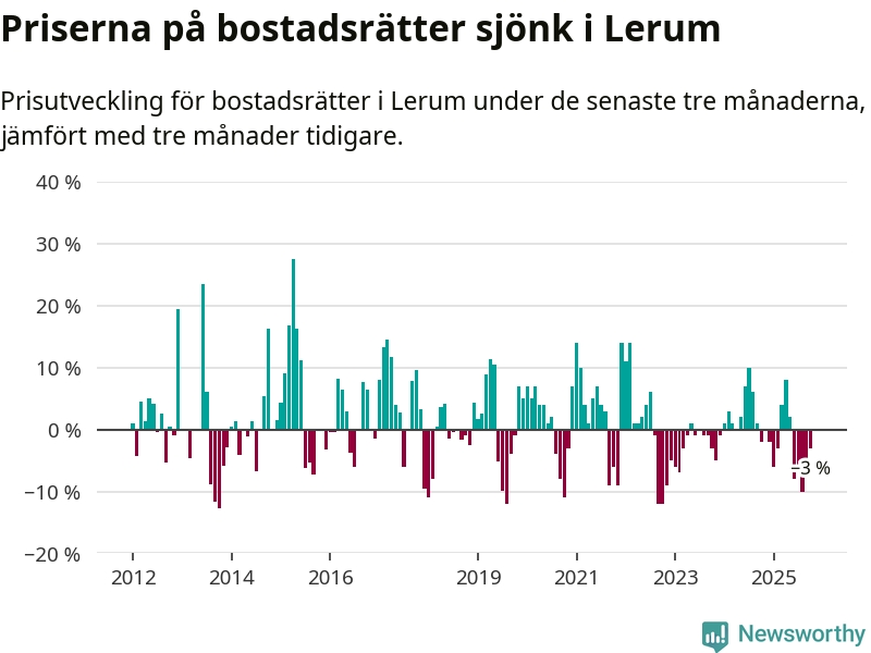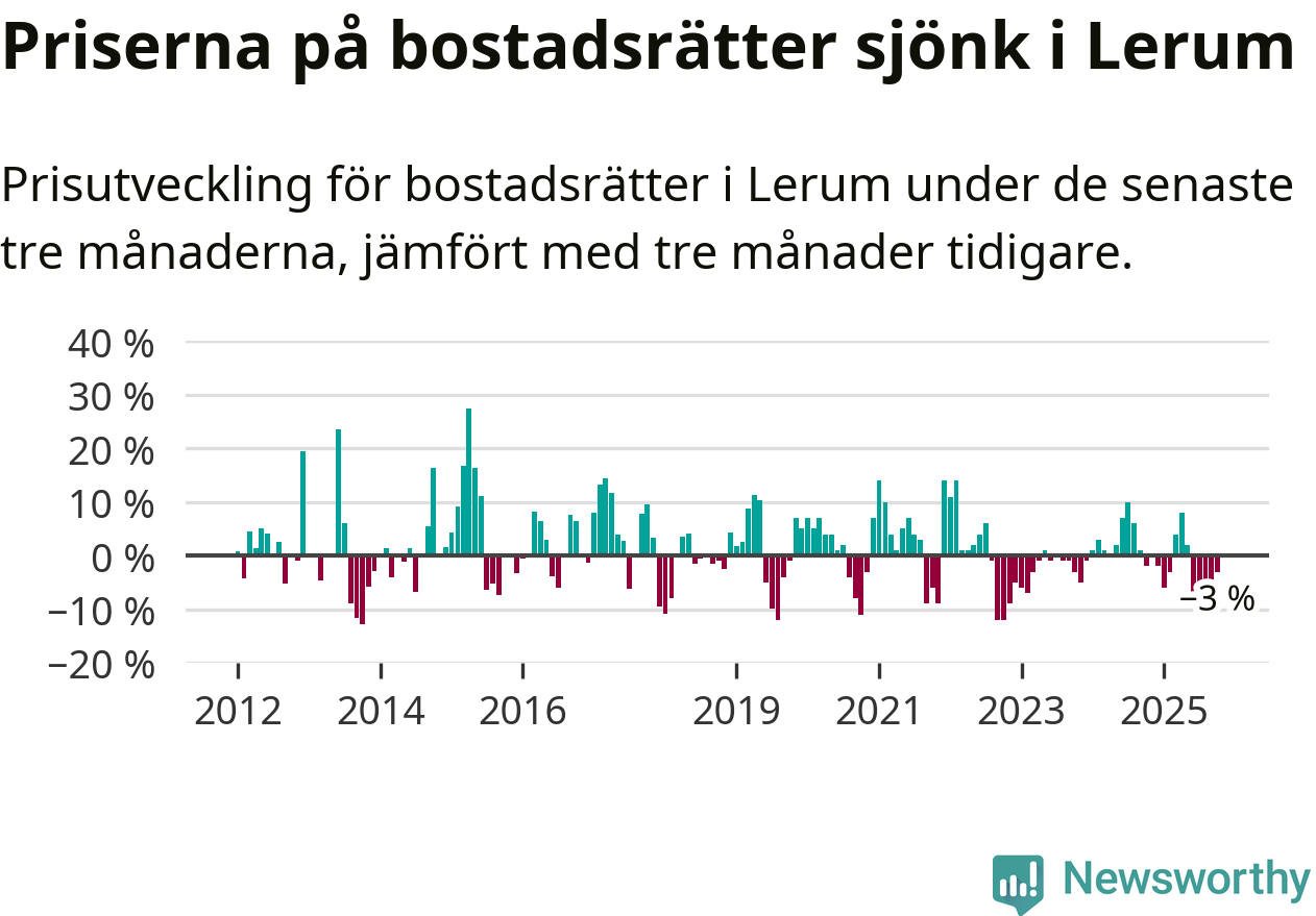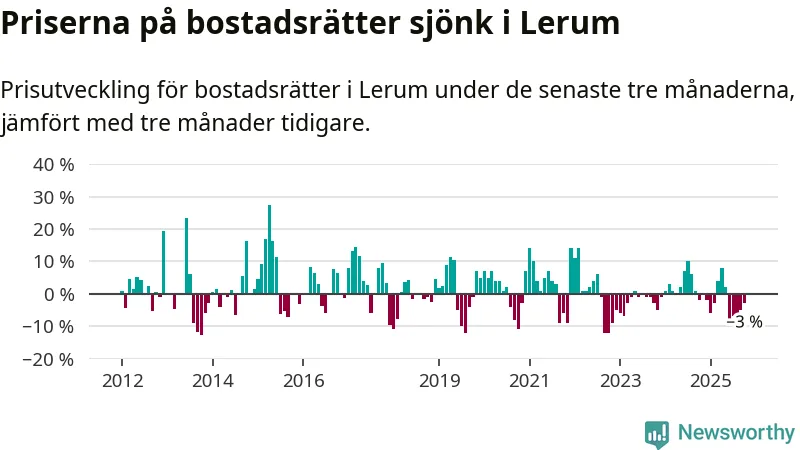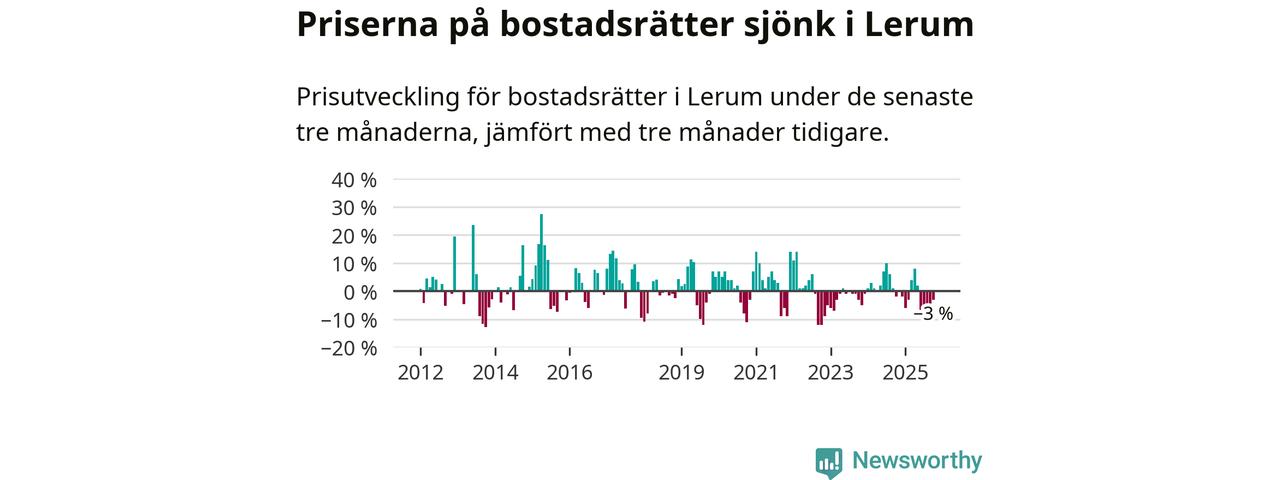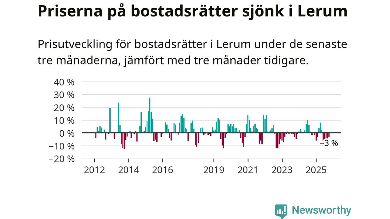 Priserna på bostadsrätter har gått ner i Lerums kommun. Medelpriset på försäljningarna under de senaste tre månaderna visar på en nedgång med 3 procent.