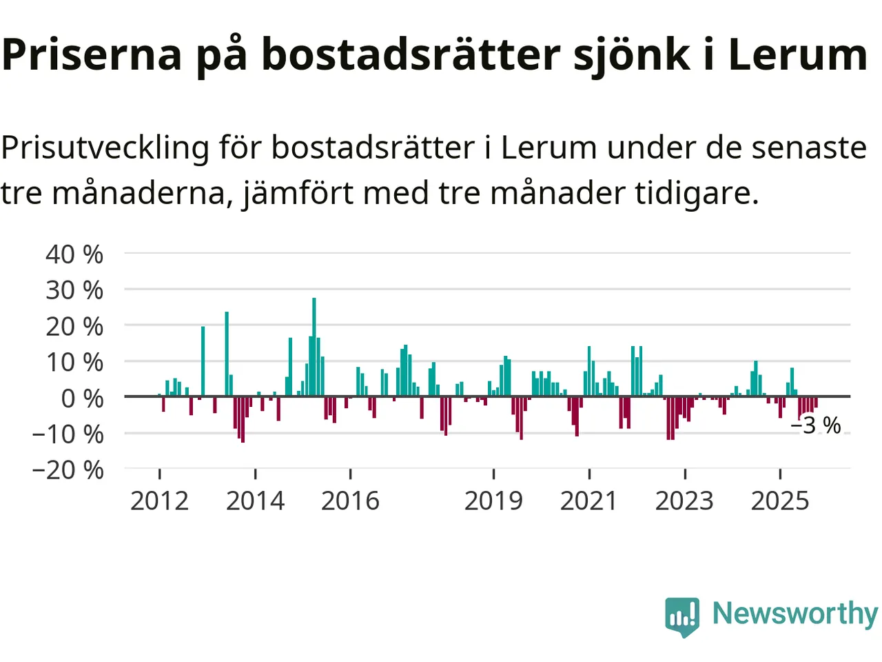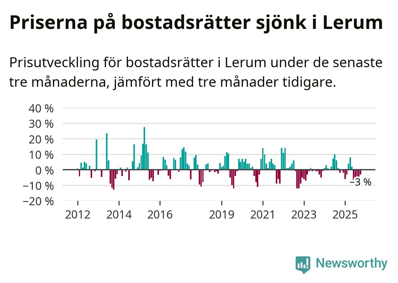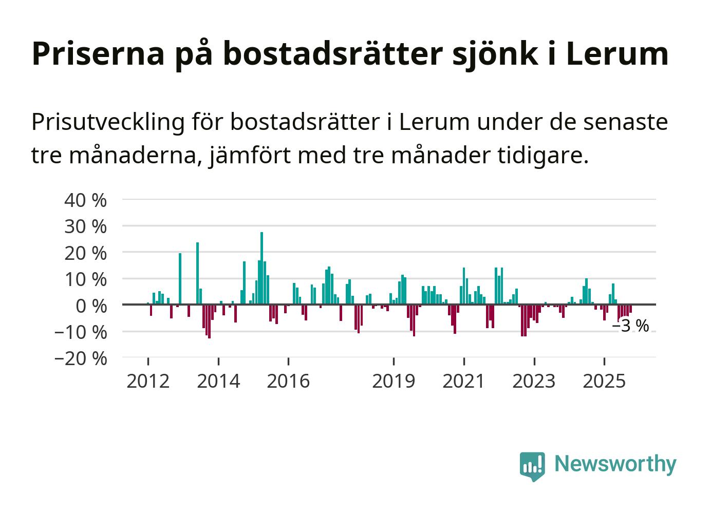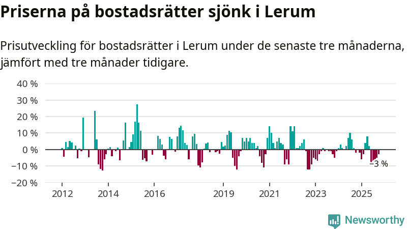 Priserna på bostadsrätter har gått ner i Lerums kommun. Medelpriset på försäljningarna under de senaste tre månaderna visar på en nedgång med 3 procent.