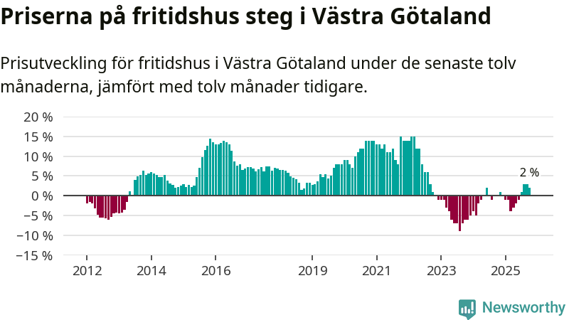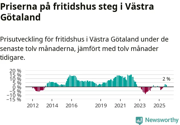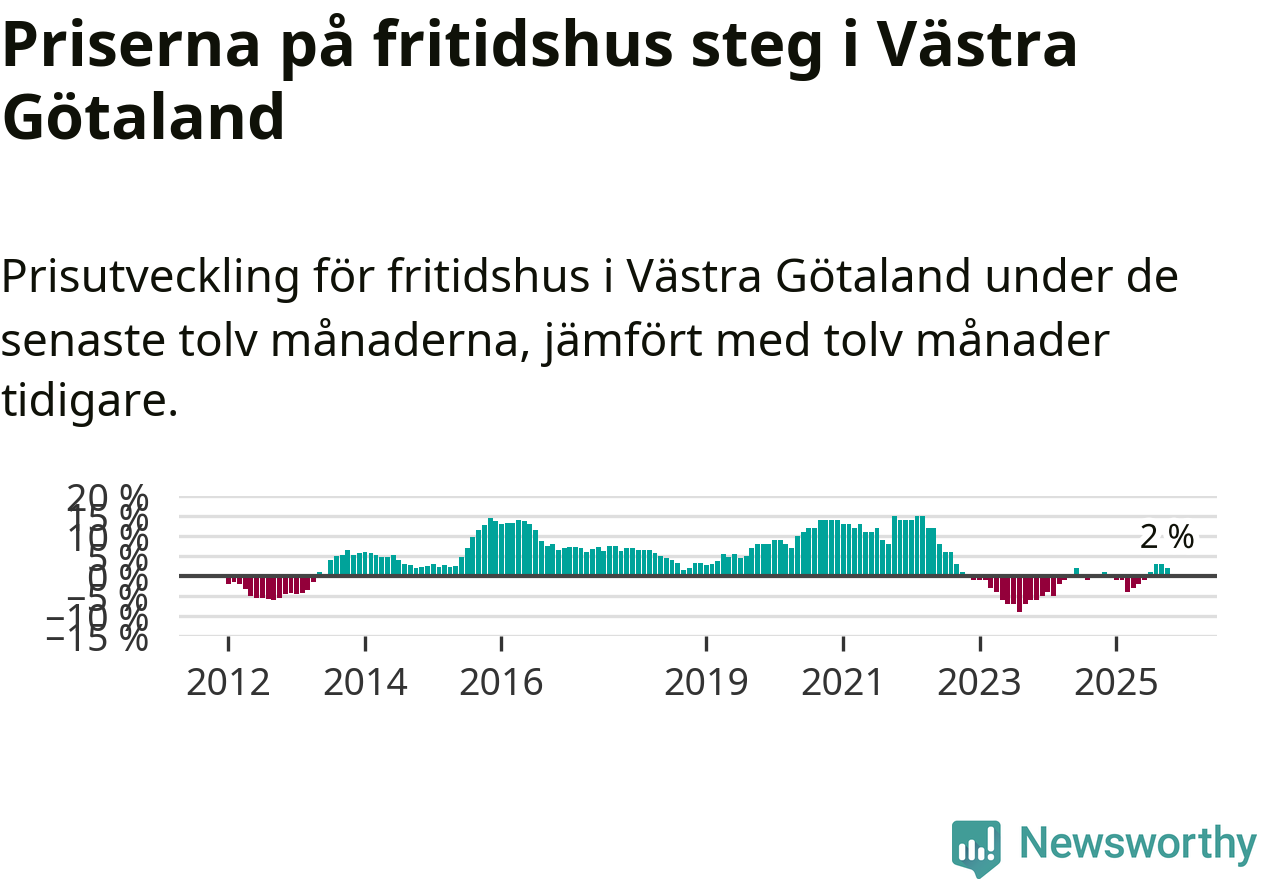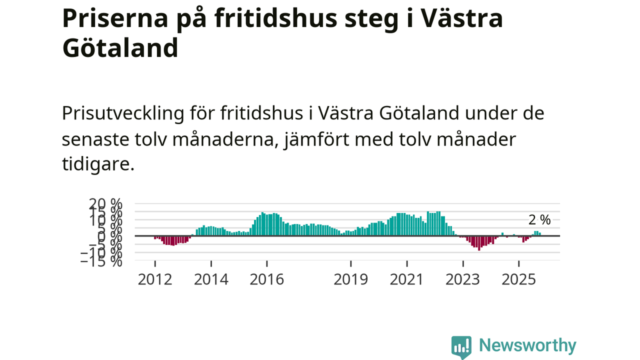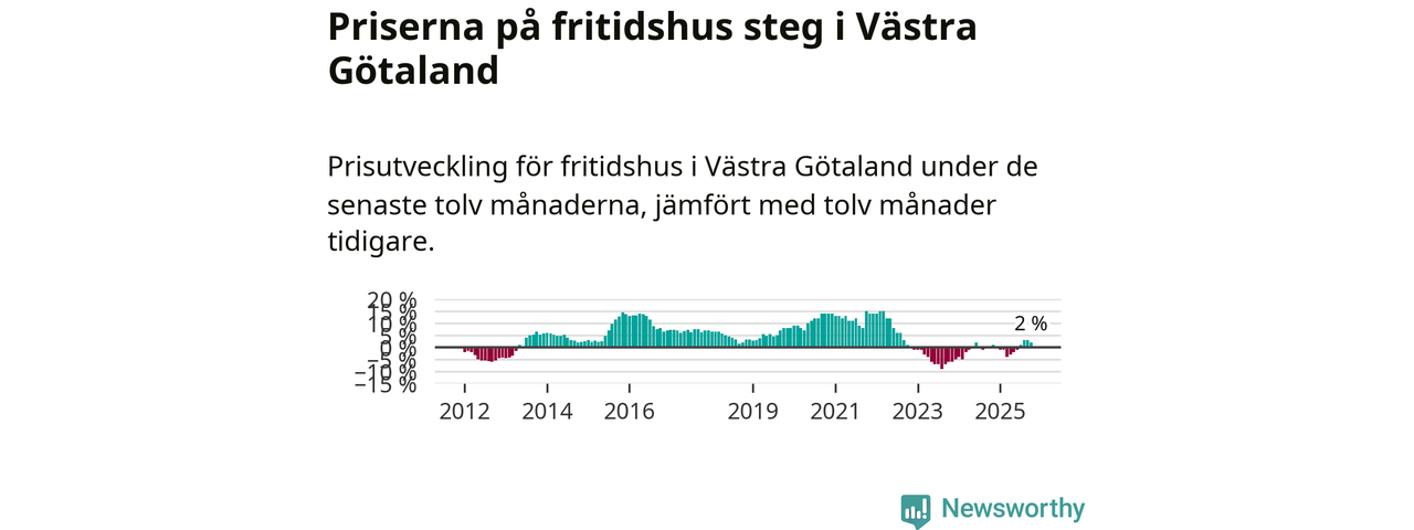 På grund av få försäljningar saknas uppgifter om prisförändringar för fritidshus i 45 av länets 49 kommuner. Bland de fyra vi har uppgifter om stiger priserna i samtliga.I Västra Götalands län som helhet går priserna på fritidshus upp med 2 procent. I hela Sverige däremot sjunker priserna på fritidshus. I hela riket noterades en prisnedgång på 3 procent.