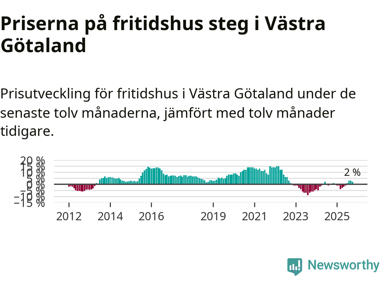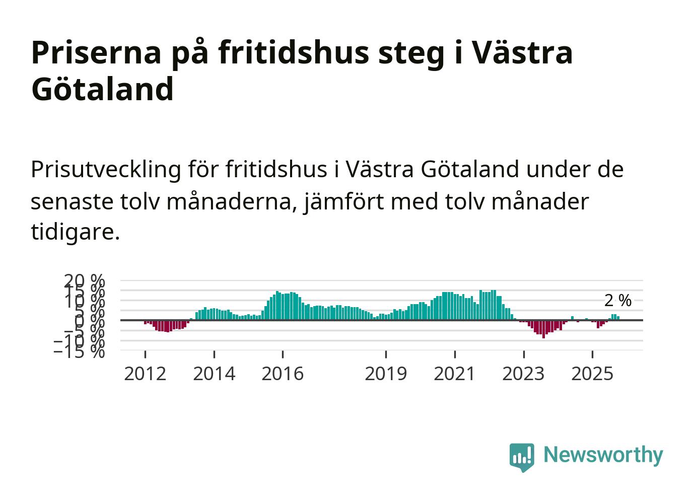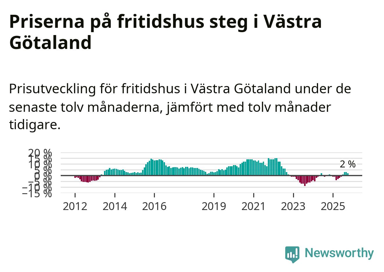 På grund av få försäljningar saknas uppgifter om prisförändringar för fritidshus i 45 av länets 49 kommuner. Bland de fyra vi har uppgifter om stiger priserna i samtliga.I Västra Götalands län som helhet går priserna på fritidshus upp med 2 procent. I hela Sverige däremot sjunker priserna på fritidshus. I hela riket noterades en prisnedgång på 3 procent.