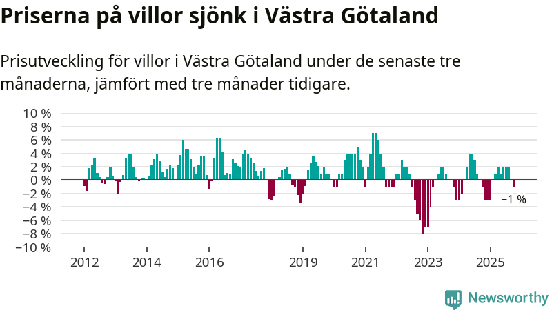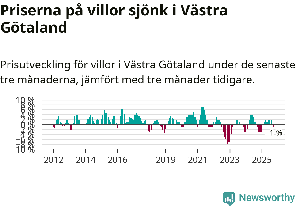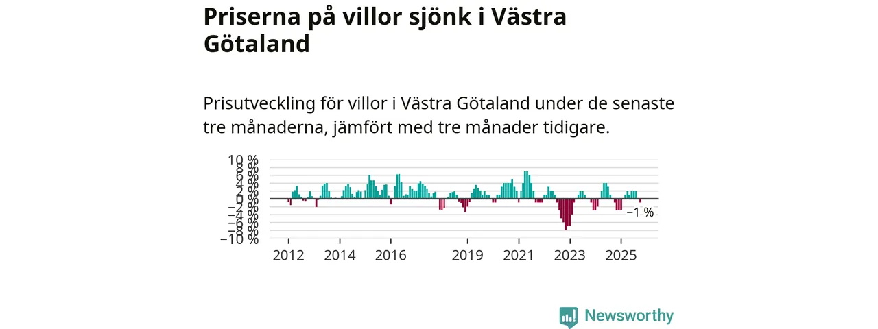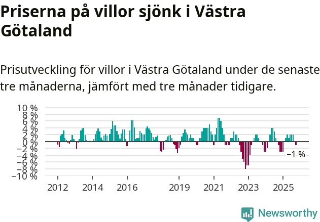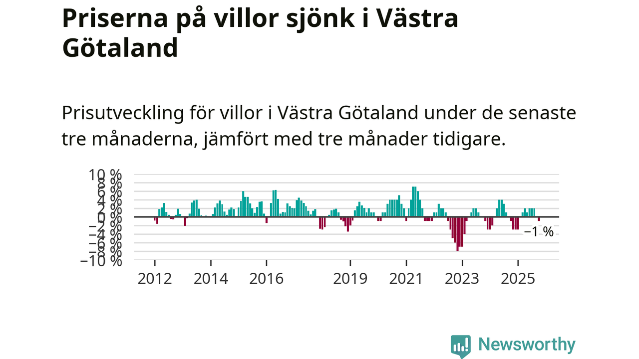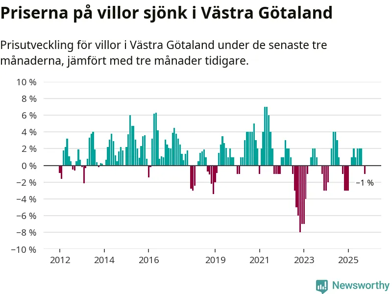 Villapriserna har gått ner i Västra Götalands län. Medelpriset på försäljningarna under de senaste tre månaderna visar på en nedgång med 1 procent.