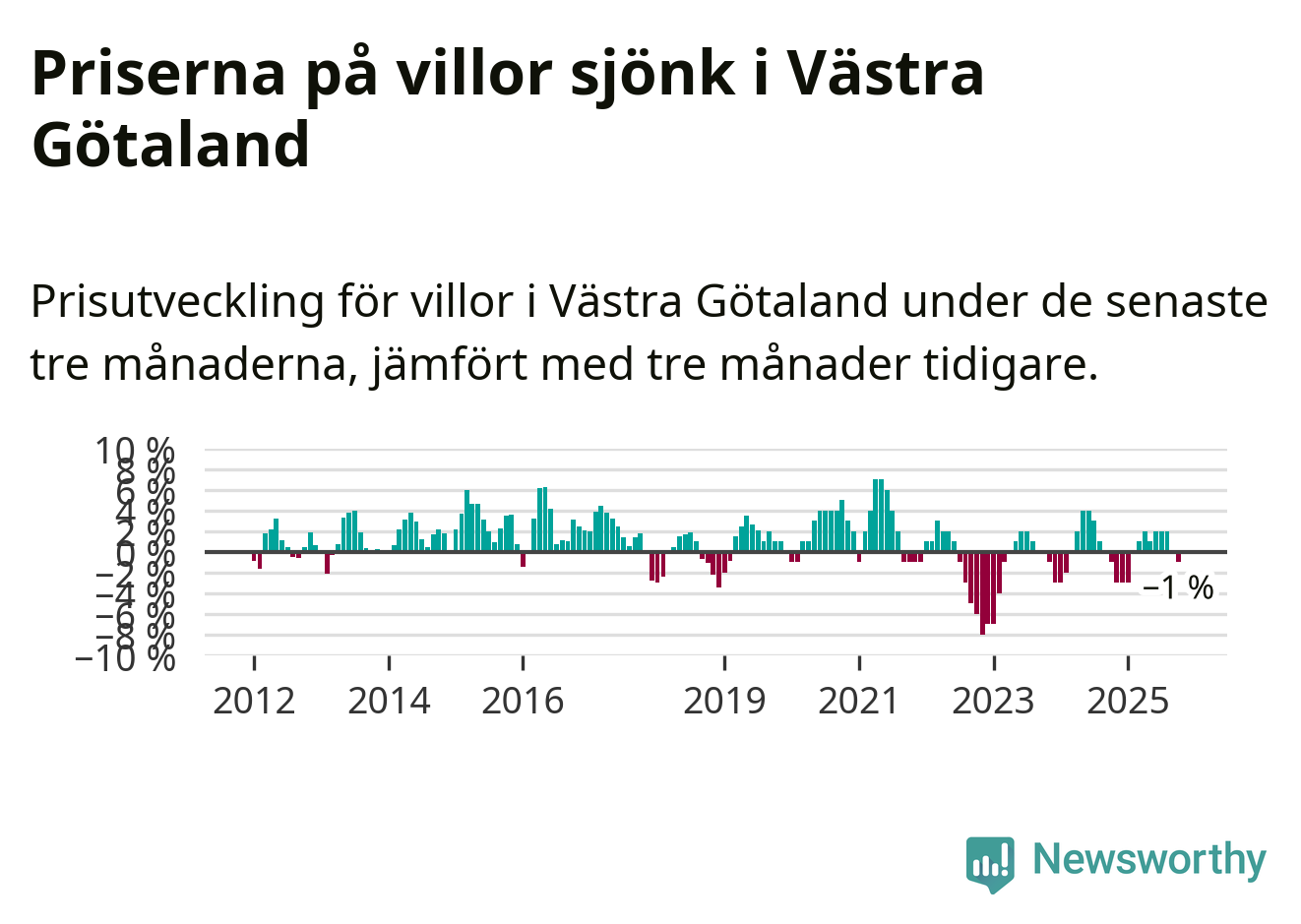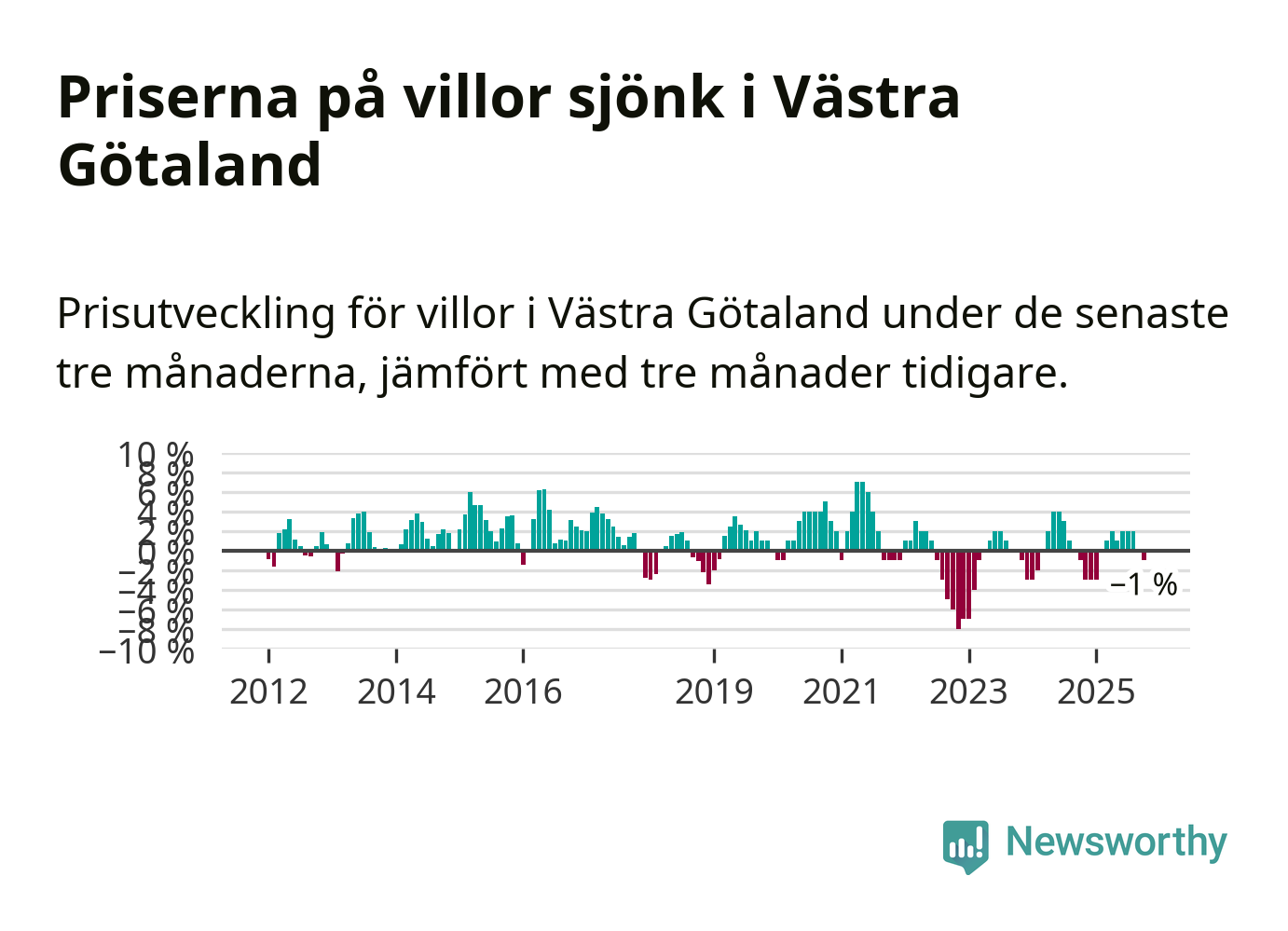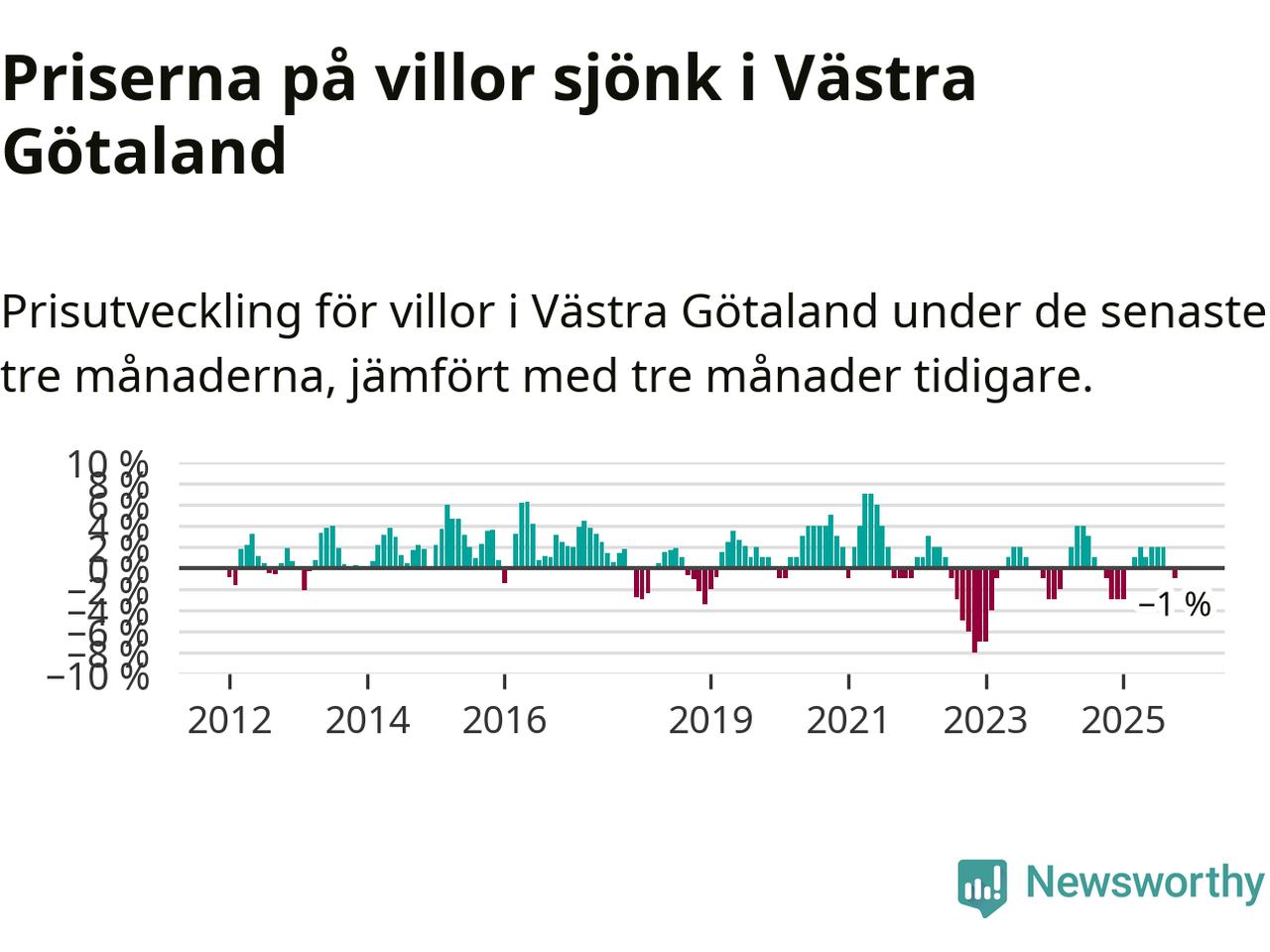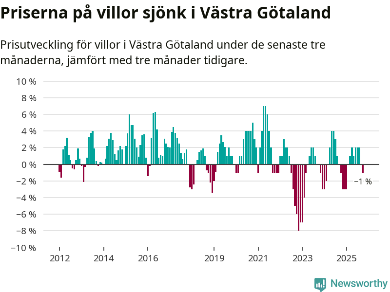 Villapriserna har gått ner i Västra Götalands län. Medelpriset på försäljningarna under de senaste tre månaderna visar på en nedgång med 1 procent.