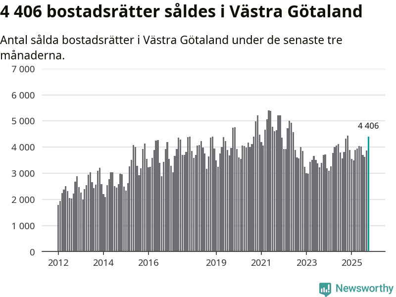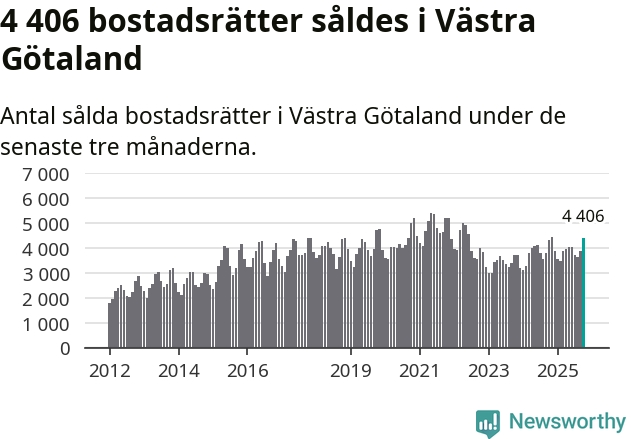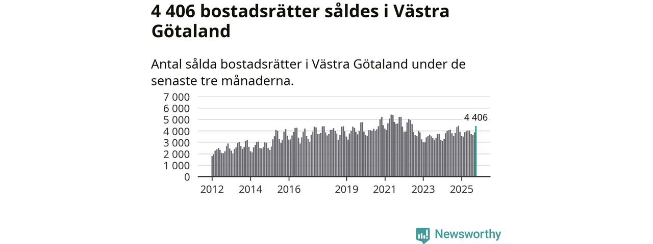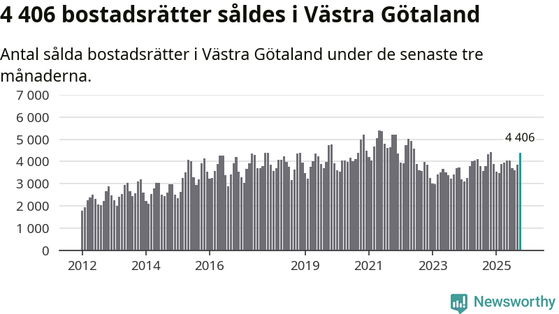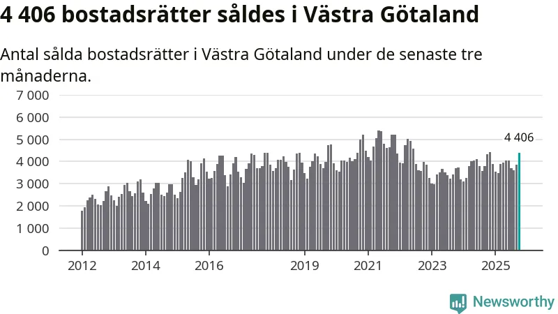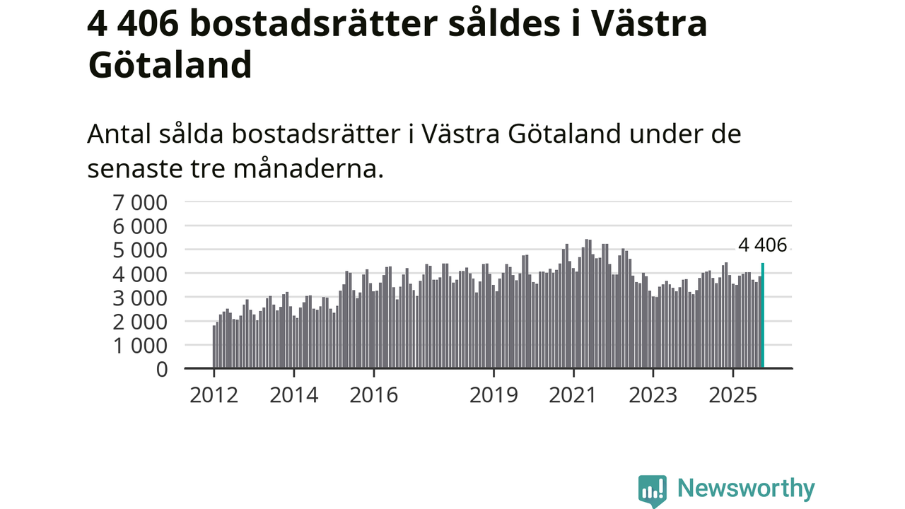 Sammanlagt såldes 4 406 bostadsrätter i Västra Götalands län mellan augusti och oktober till ett genomsnittligt pris på 2,5 miljoner kronor. I fjol gjordes 4 321 affärer vid den här tiden på året.