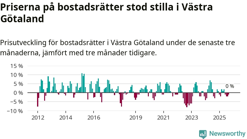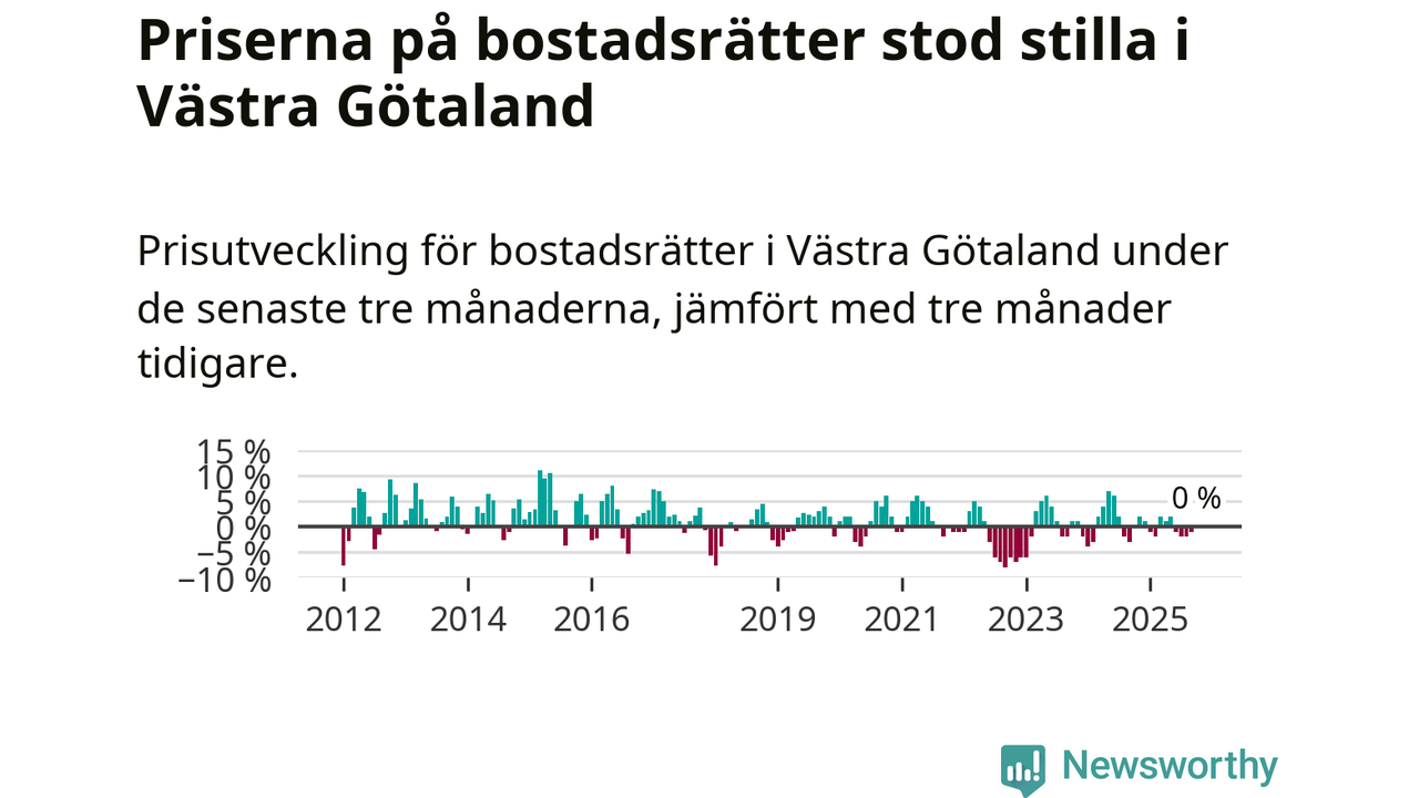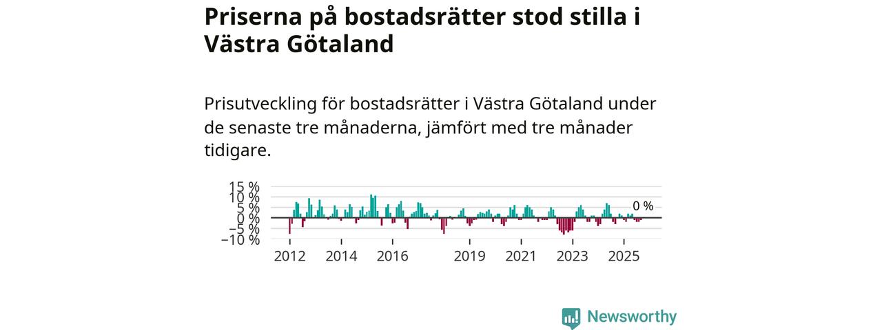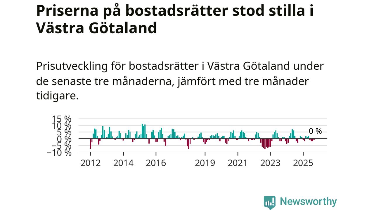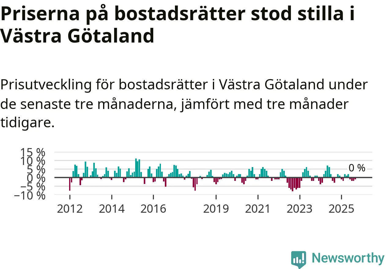 Priserna på bostadsrätter står i stort sett stilla i Västra Götalands län. Medelpriset på de på försäljningarna under de senaste tre månaderna låg på samma nivå som för tre månader sedan.