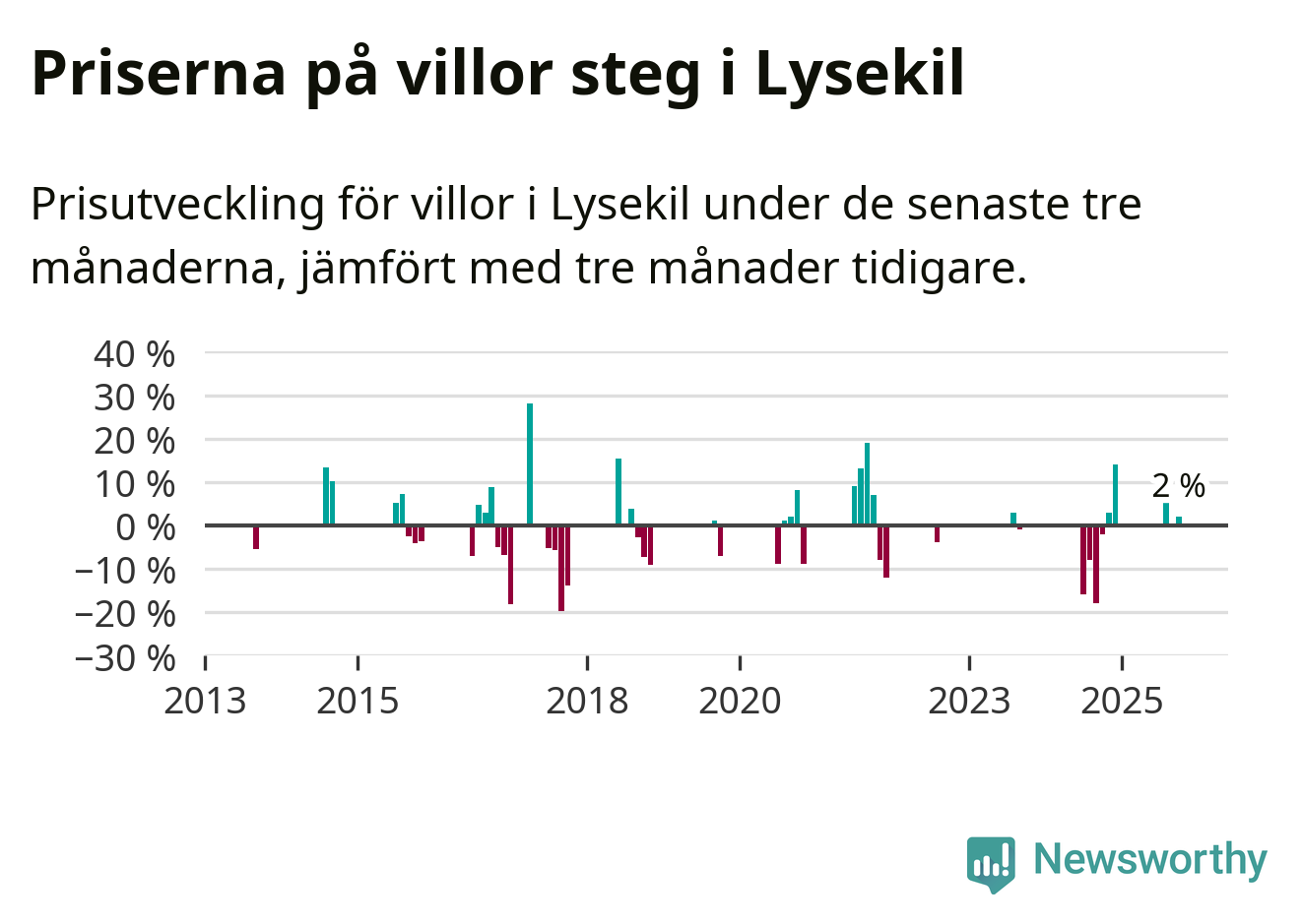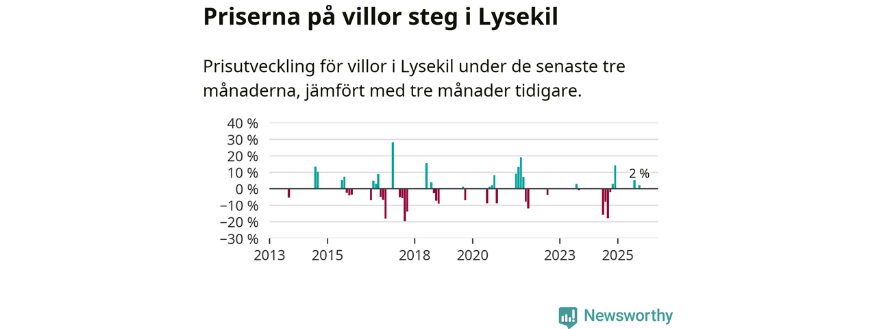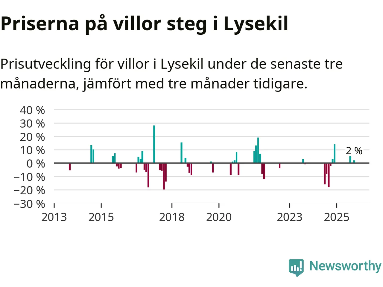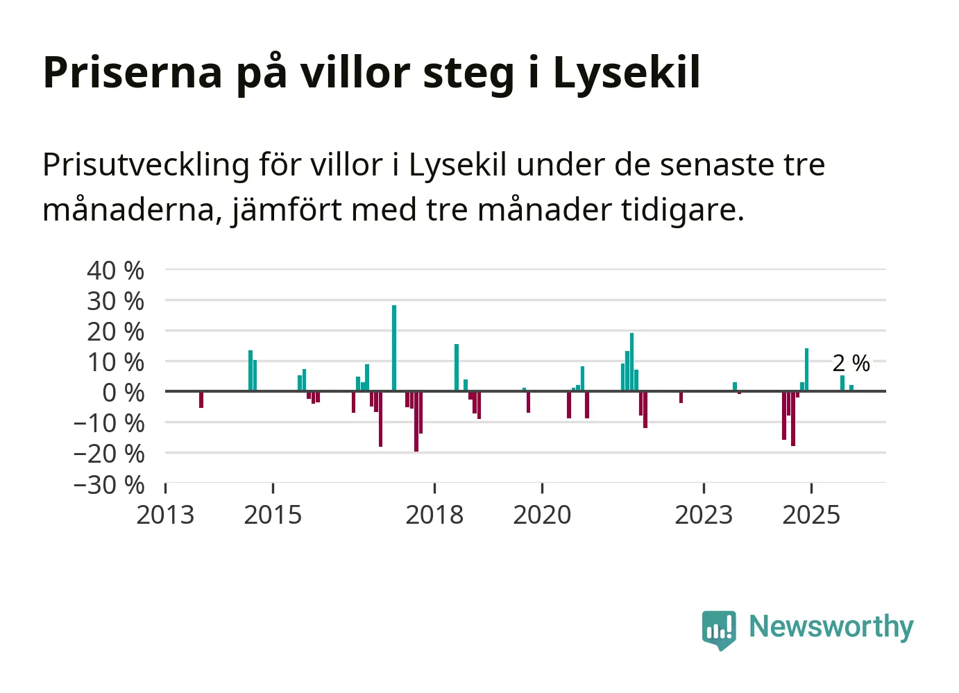 Statistiken visar även på en prisuppgång i Lysekils kommun. Medelpriset på försäljningarna av villor i kommunen var 2 procent högre än för tre månader sedan. I hela Västra Götaland däremot sjunker villapriserna. I hela länet noterades en prisnedgång på 1 procent.