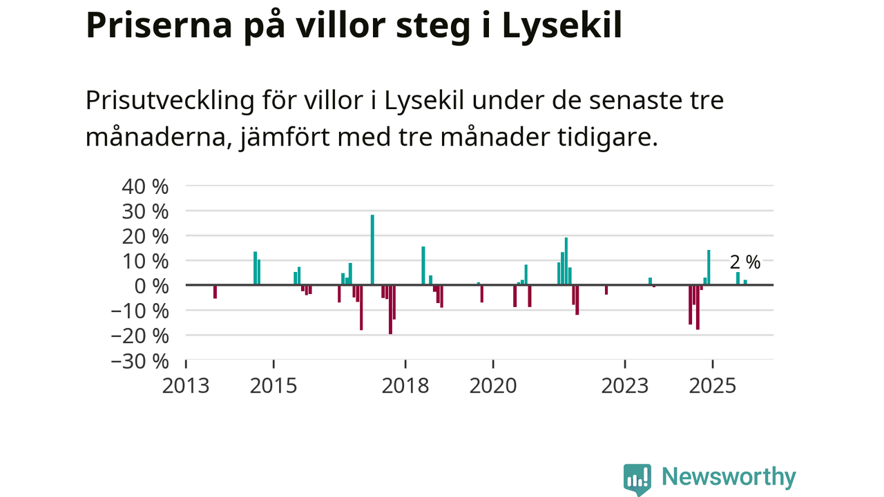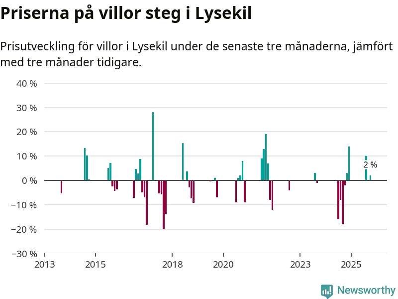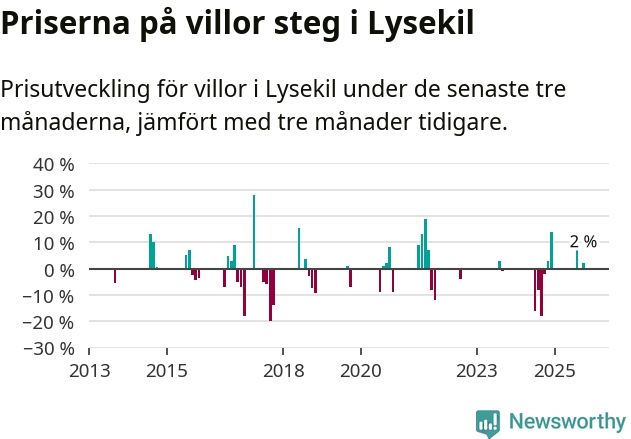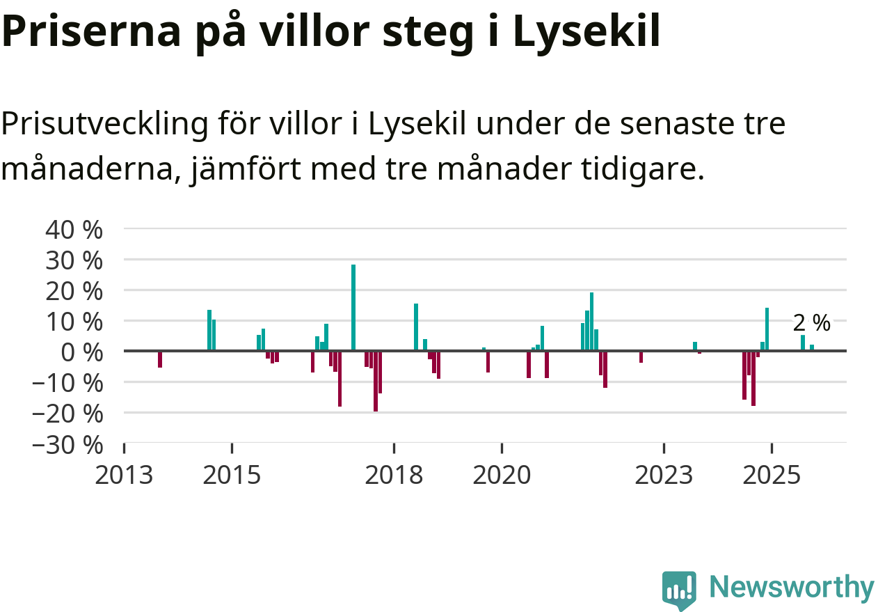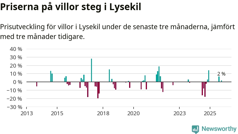Statistiken visar även på en prisuppgång i Lysekils kommun. Medelpriset på försäljningarna av villor i kommunen var 2 procent högre än för tre månader sedan. I hela Västra Götaland däremot sjunker villapriserna. I hela länet noterades en prisnedgång på 1 procent.