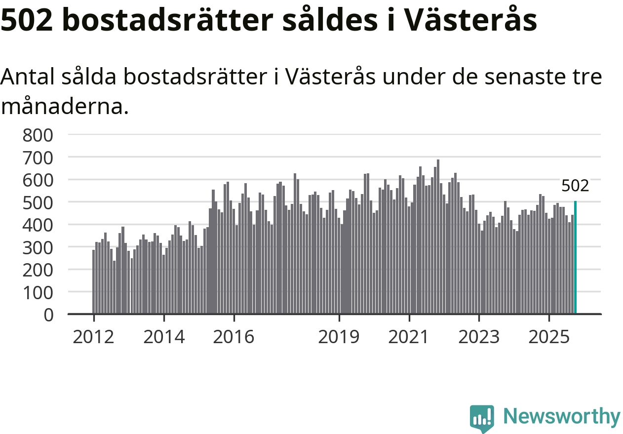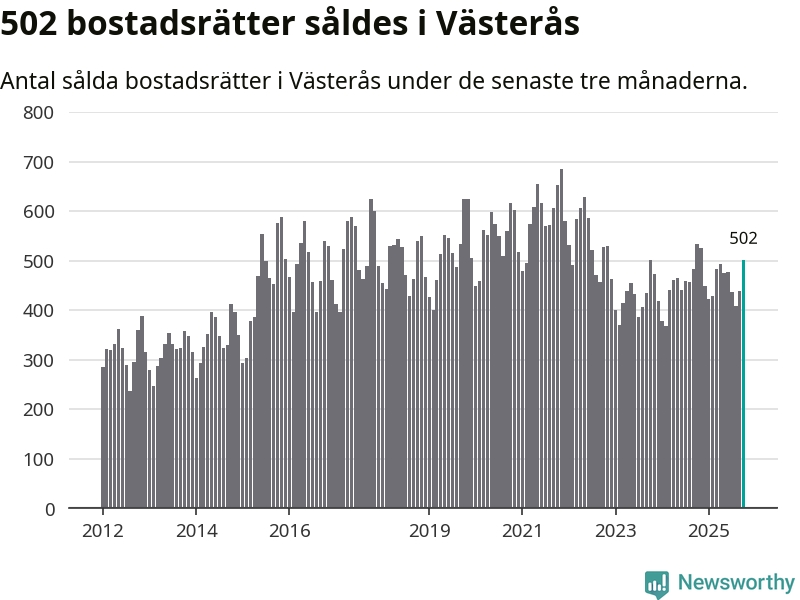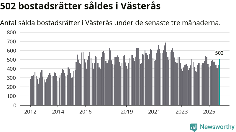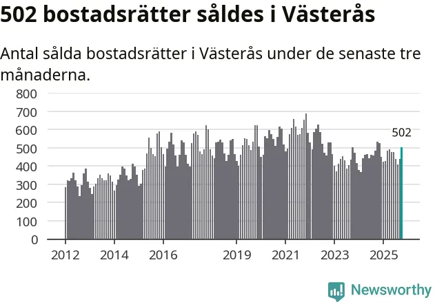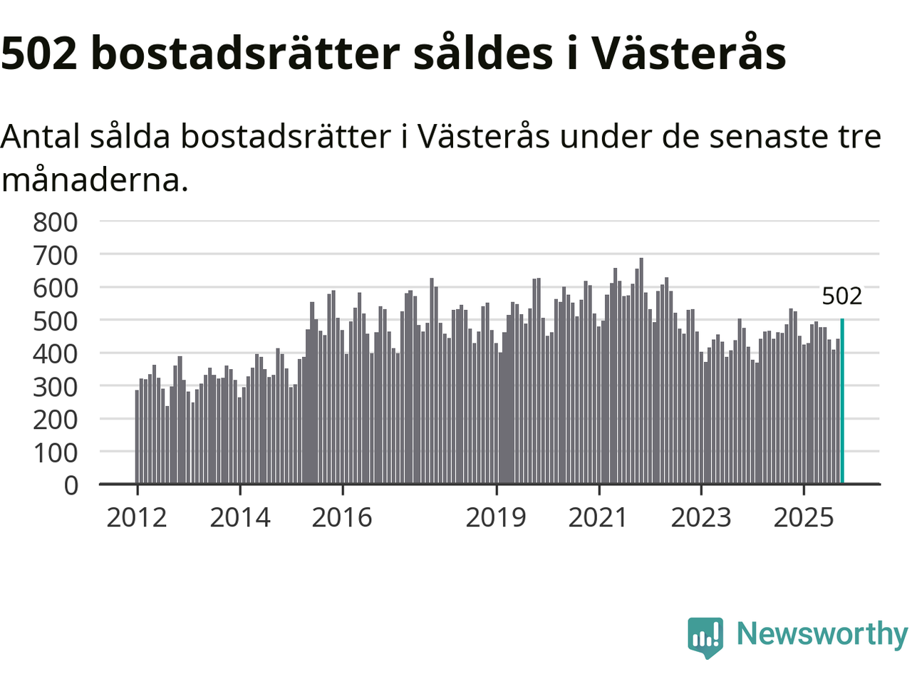 Sammanlagt såldes 502 bostadsrätter i Västerås kommun mellan augusti och oktober till ett genomsnittligt pris på 1,7 miljoner kronor. I fjol gjordes 534 affärer vid den här tiden på året.