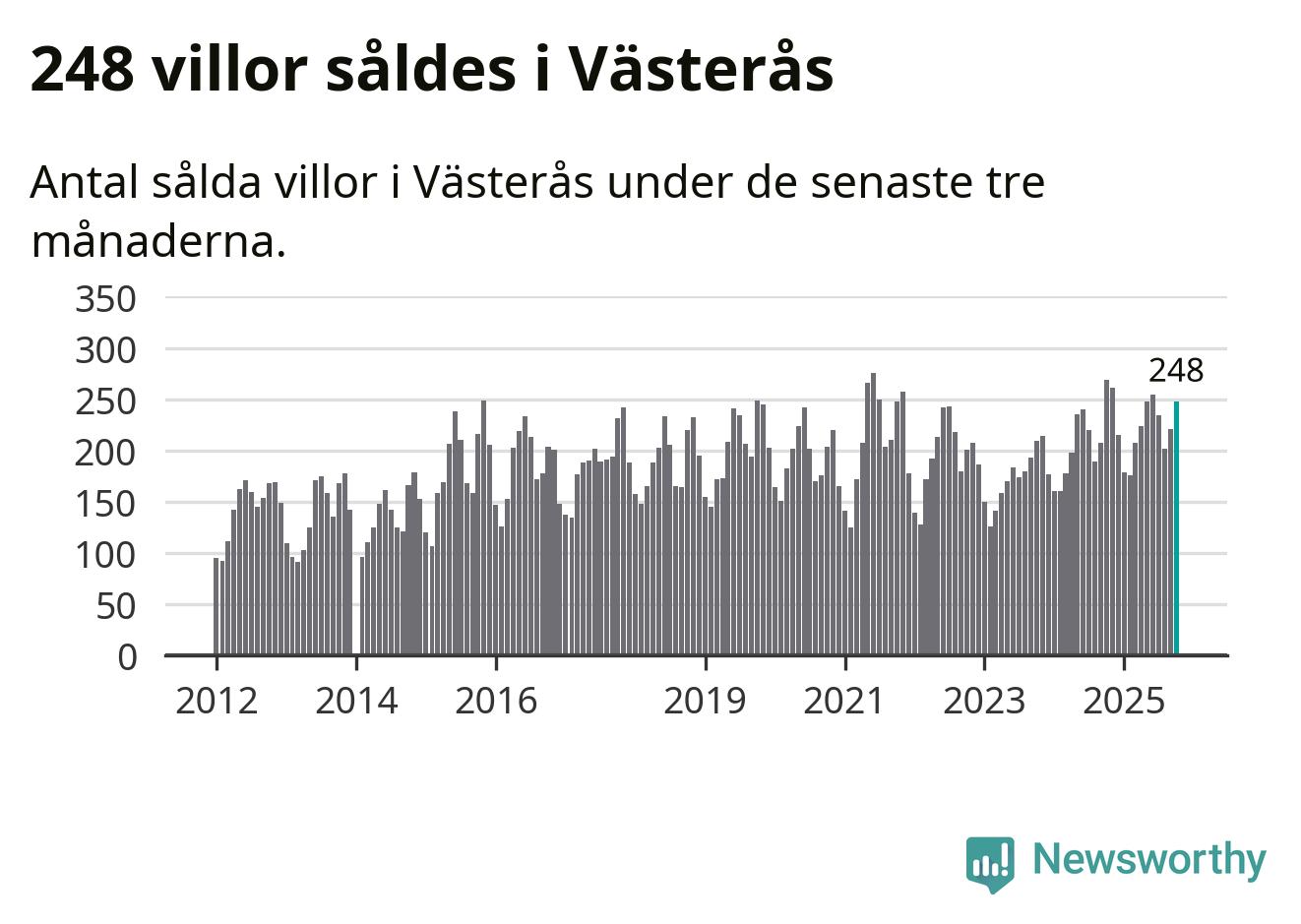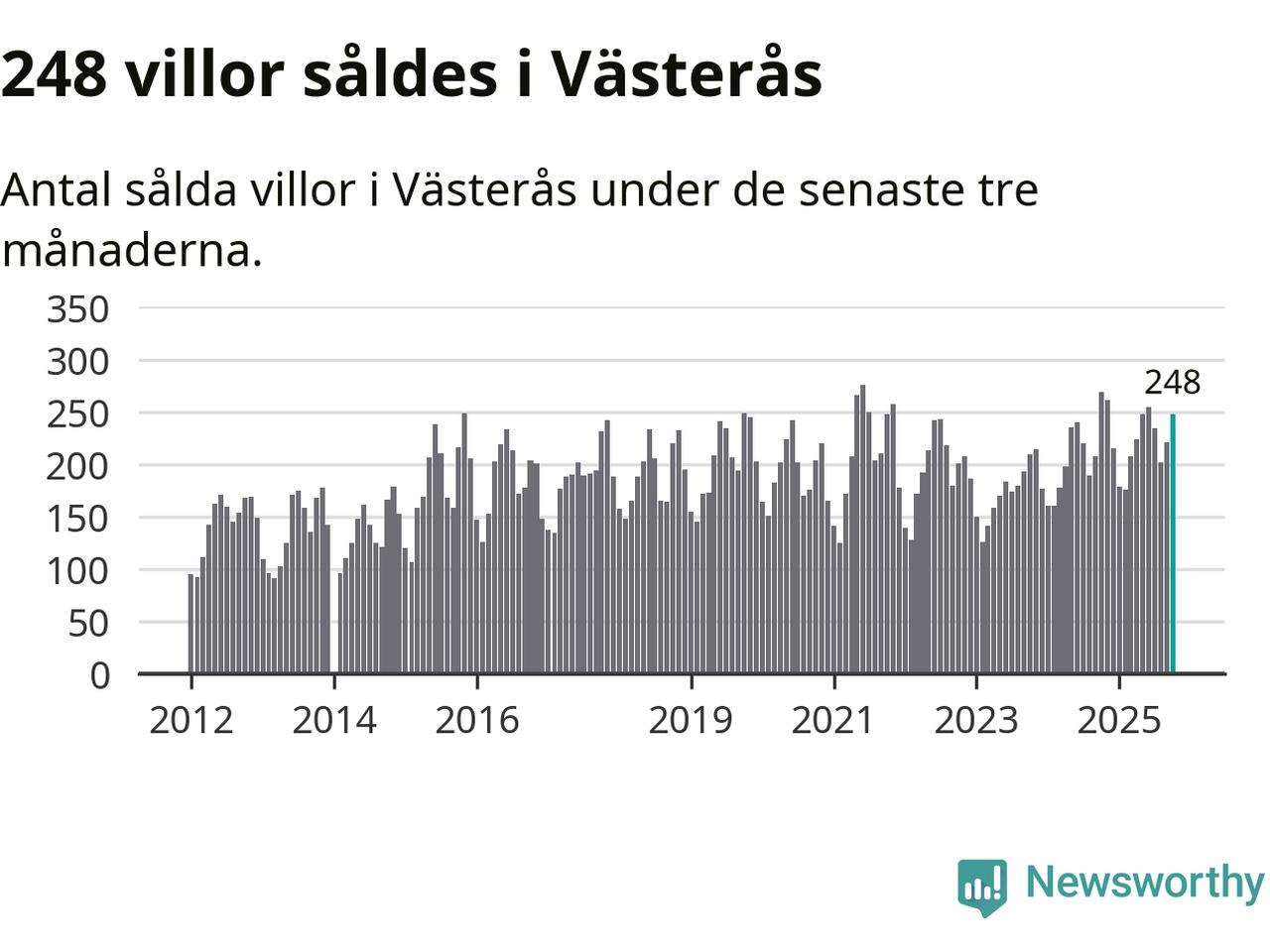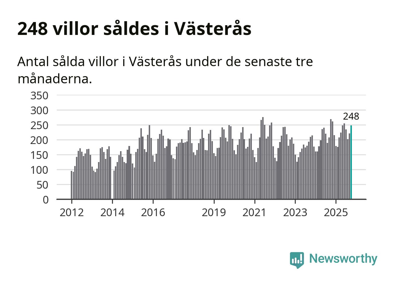 Sammanlagt såldes 248 villor i Västerås kommun mellan augusti och oktober till ett genomsnittligt pris på 4,2 miljoner kronor. I fjol gjordes 269 affärer vid den här tiden på året.