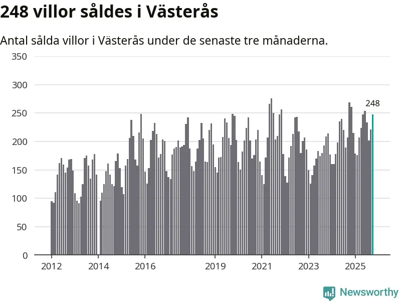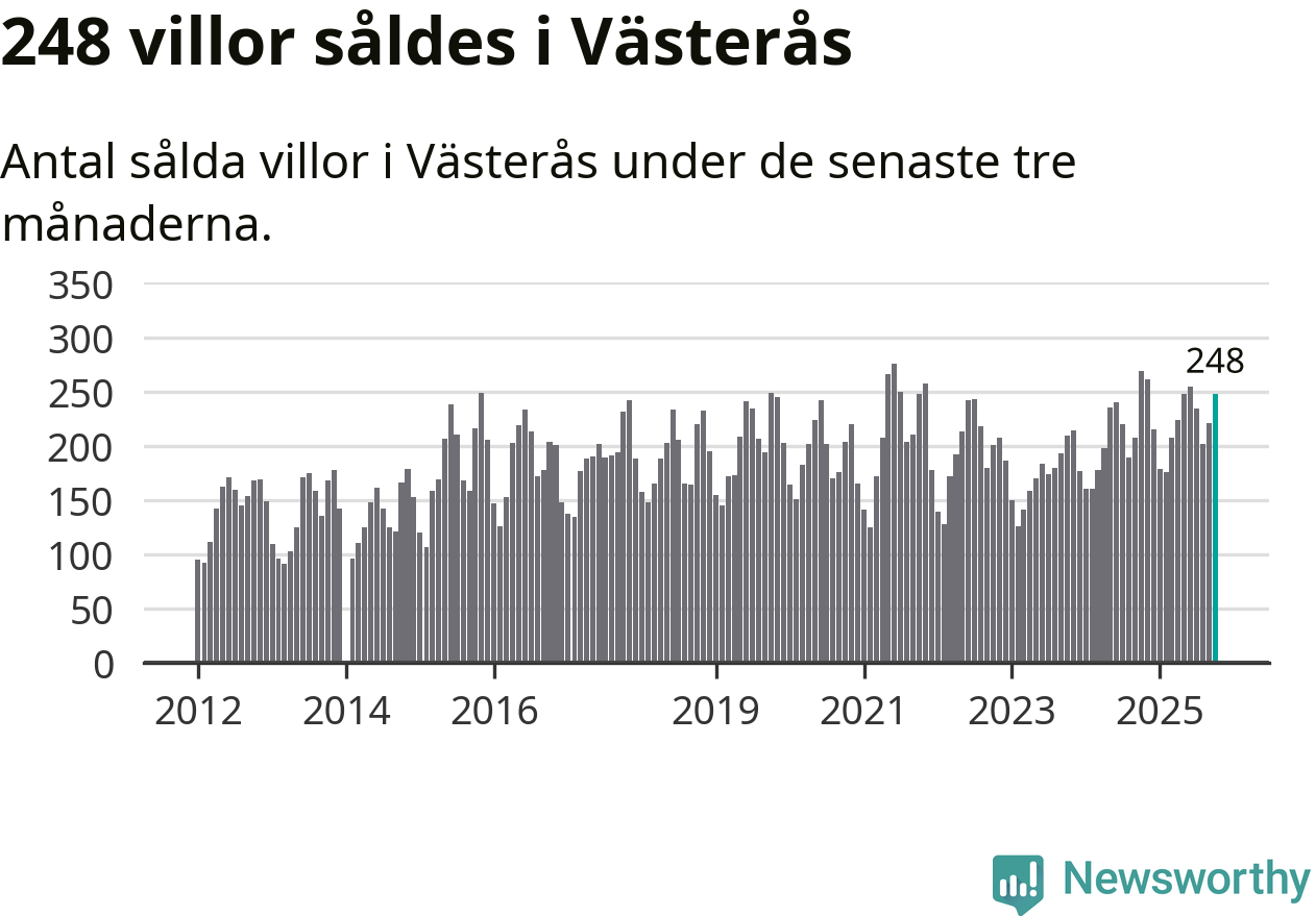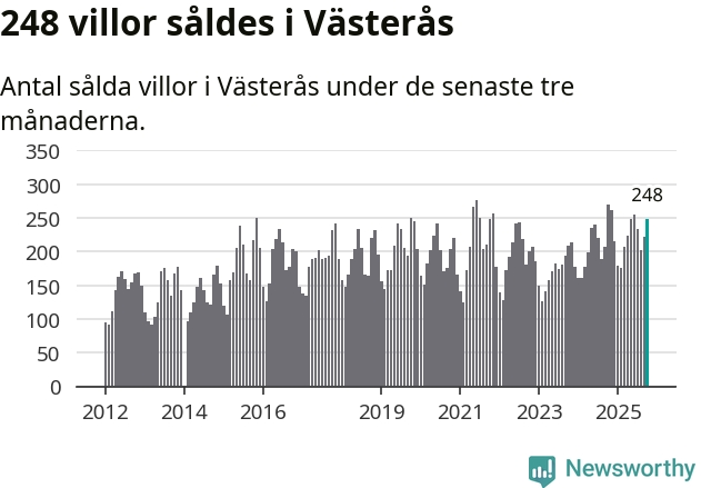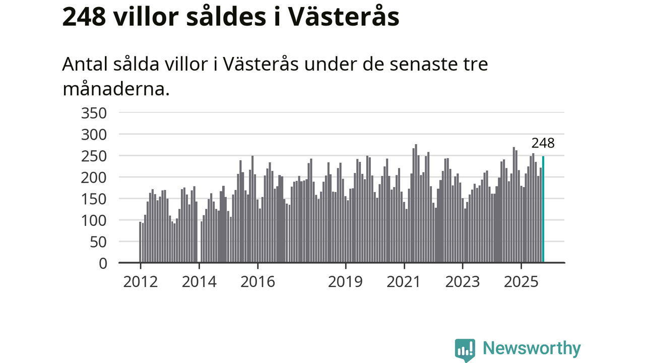 Sammanlagt såldes 248 villor i Västerås kommun mellan augusti och oktober till ett genomsnittligt pris på 4,2 miljoner kronor. I fjol gjordes 269 affärer vid den här tiden på året.